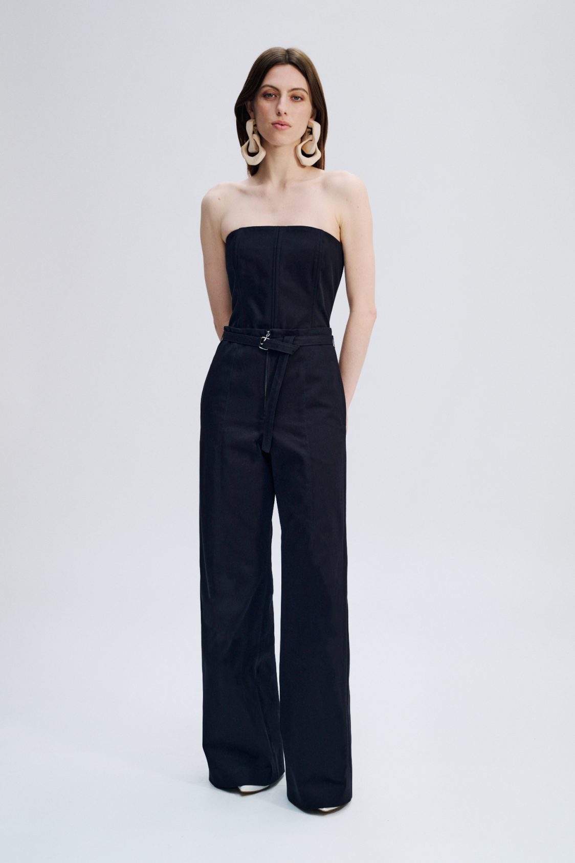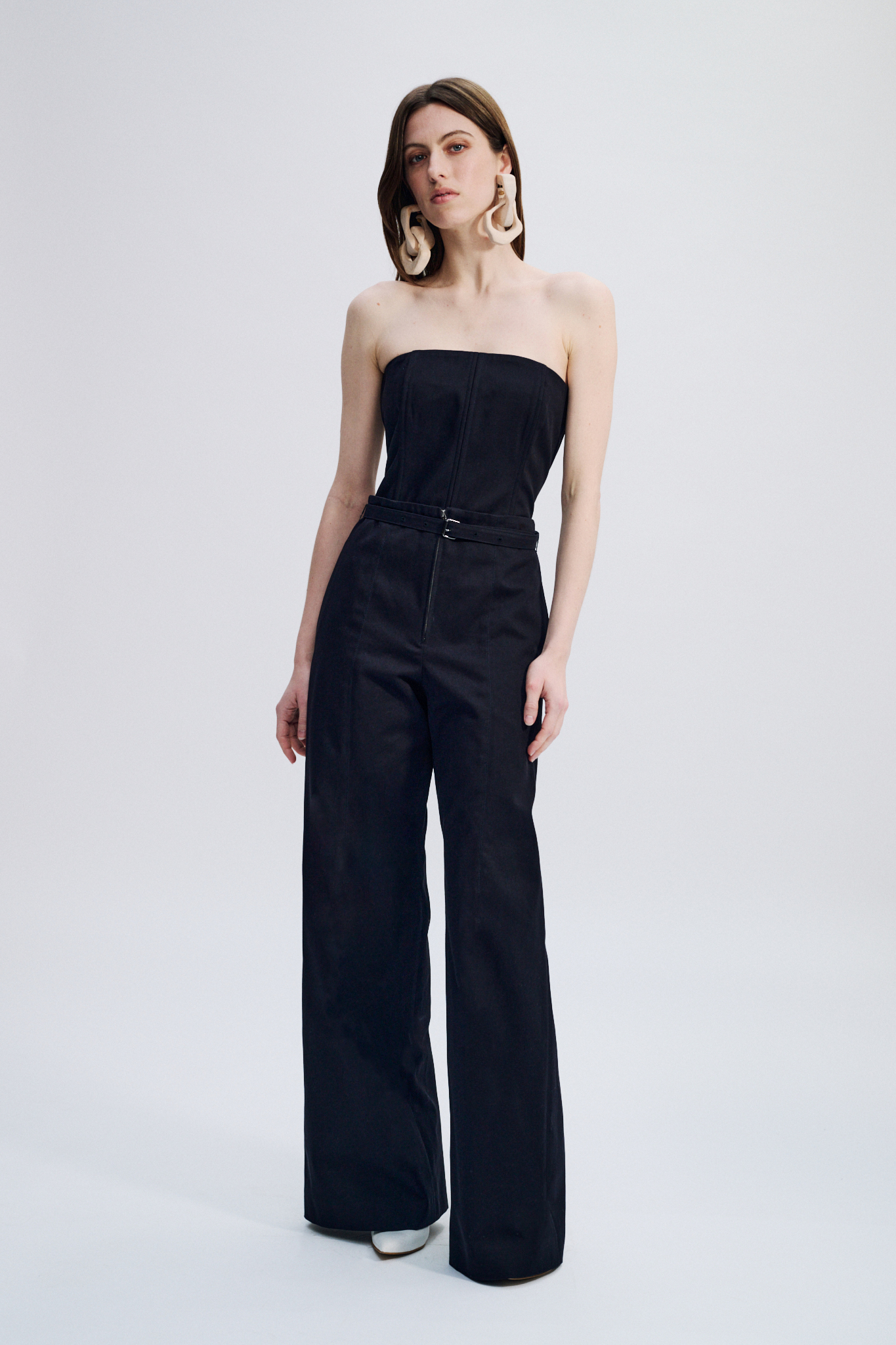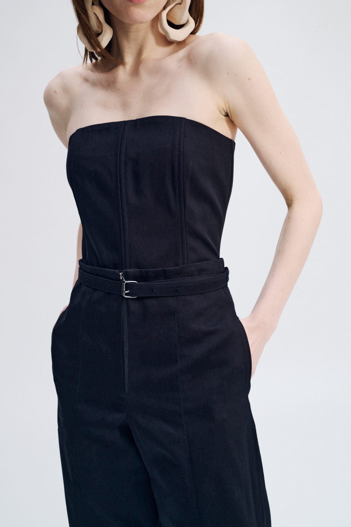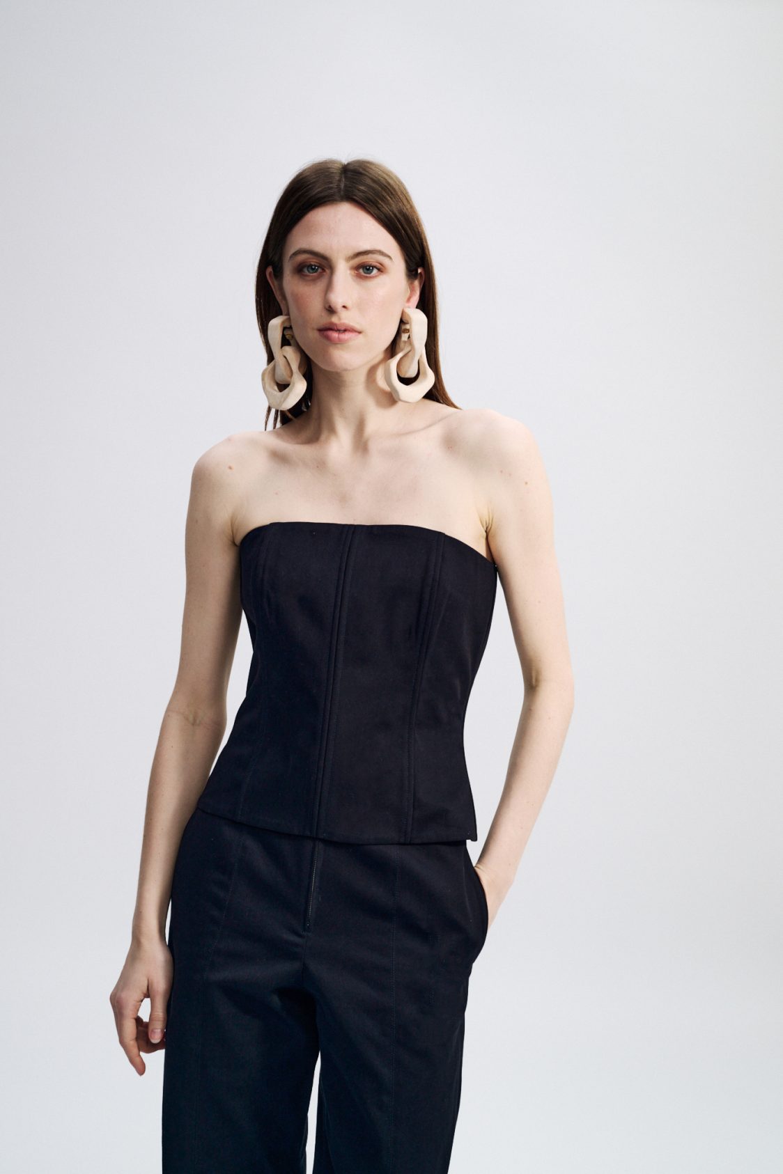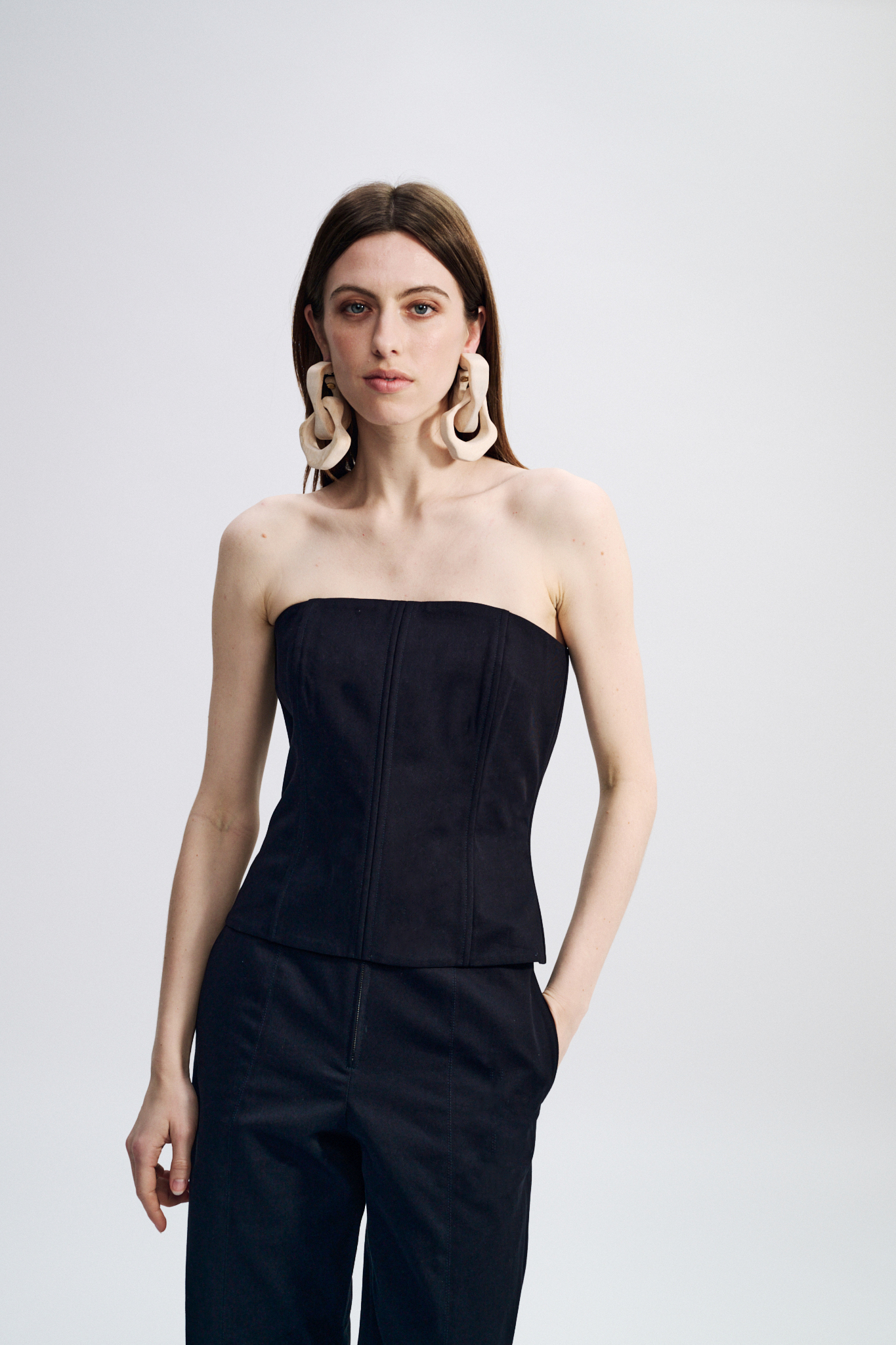 The vertical lines elongate the silhouette while providing structure thanks to the integrated boning.
