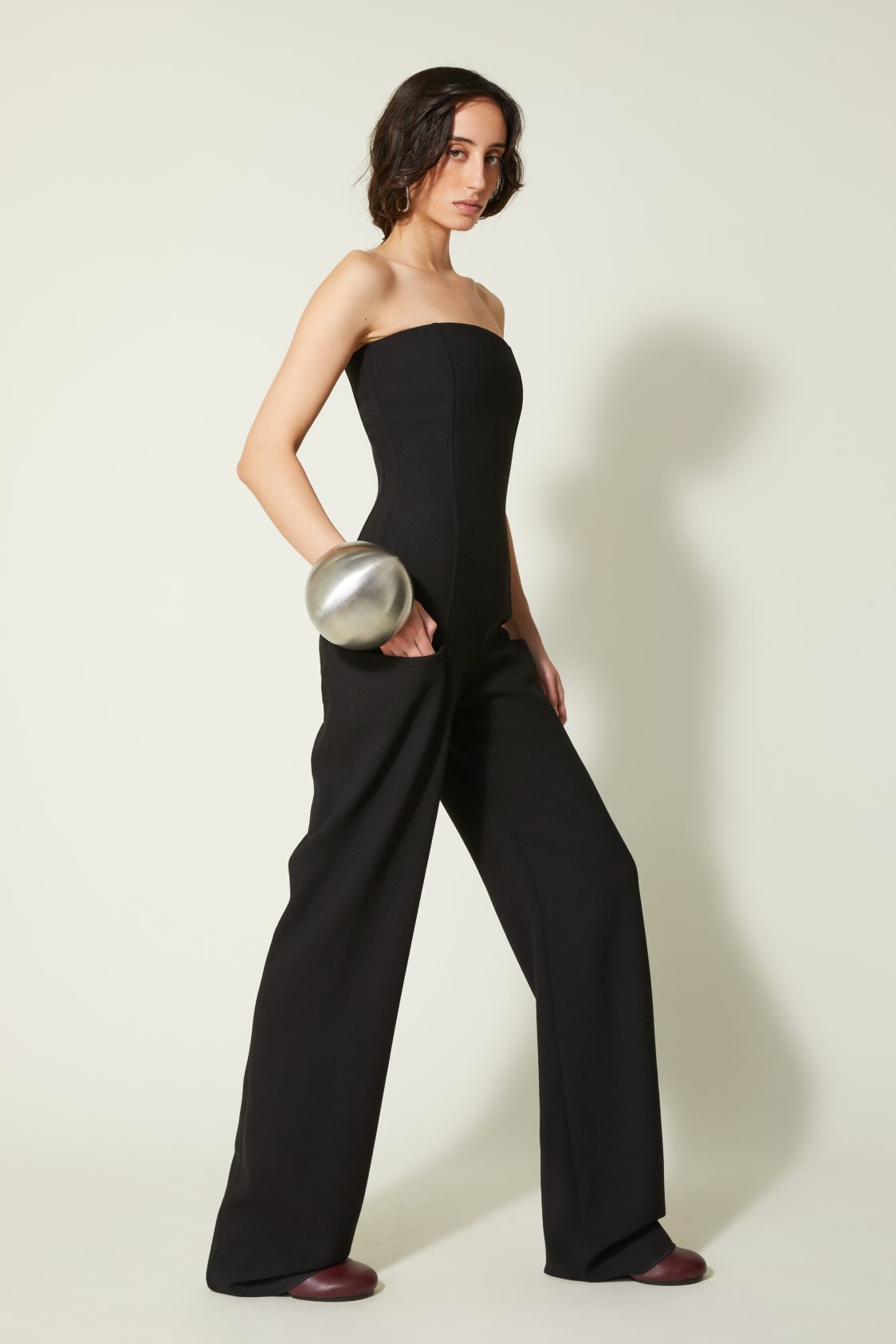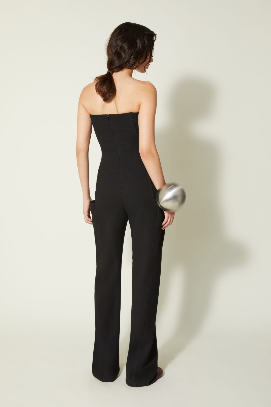 This strapless jumpsuit reveals a sleek, confident silhouette. Crafted from a supple black wool crepe, it fits closely through the bodice before flowing into long, fluid legs. Vertical seams sculpt the line and elongate the figure, while structured pockets add both definition and functionality.