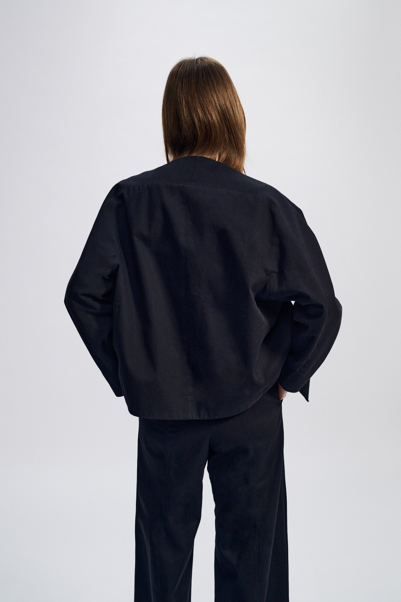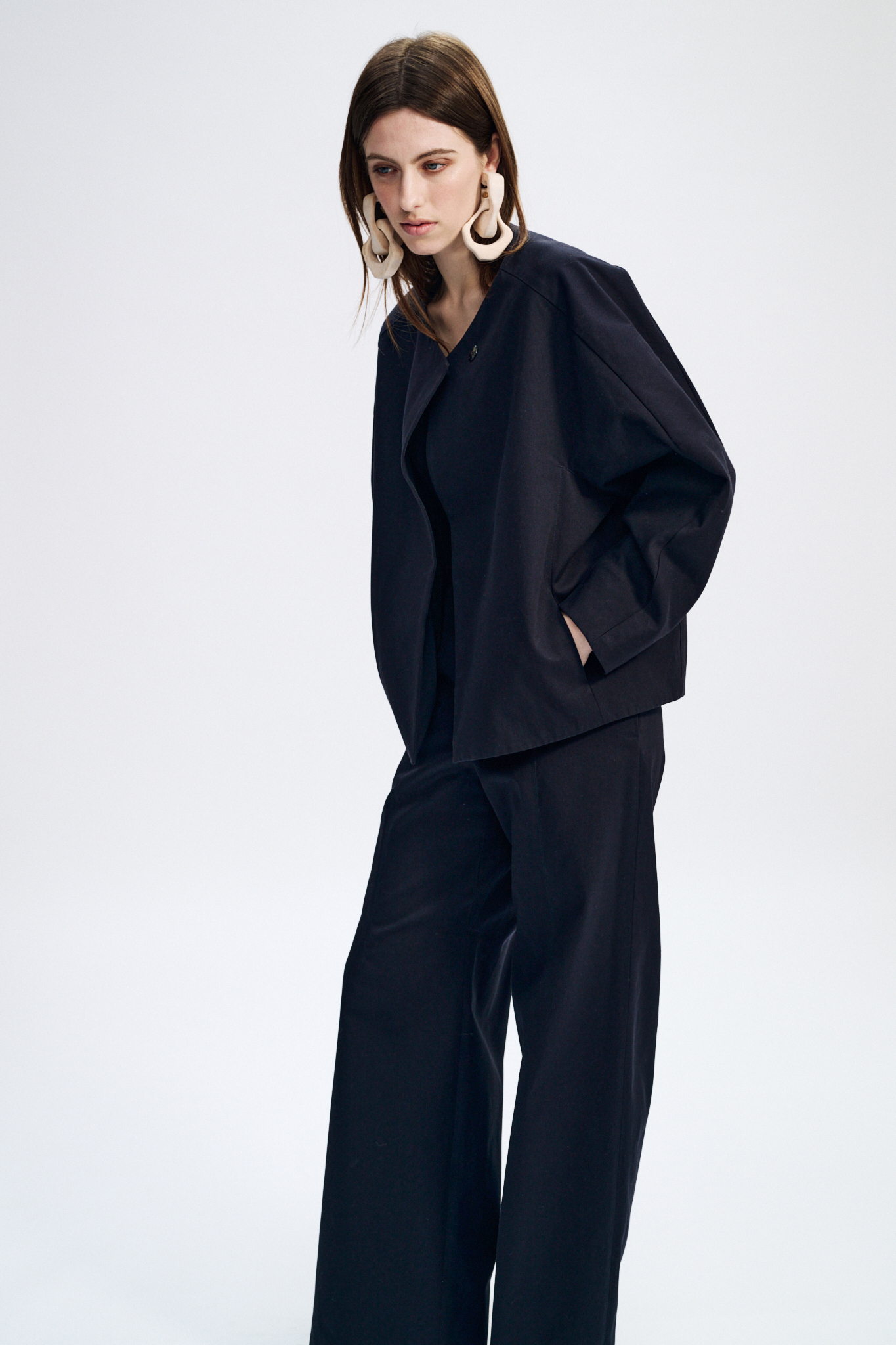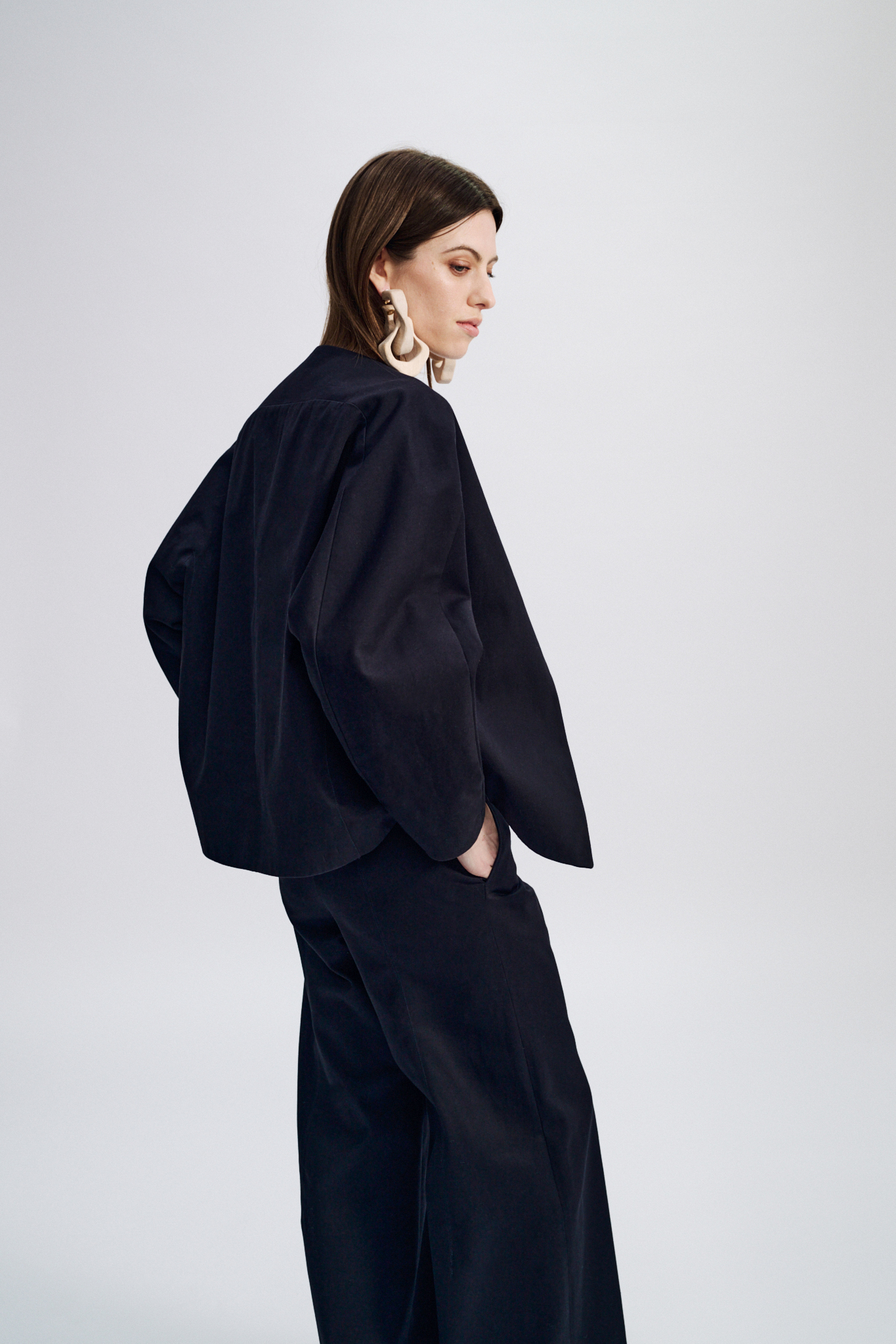 Collarless jacket in cotton gabardine. Its structured cut is distinguished by its voluminous, almost balloon-shaped sleeves. The sharp V-neckline and the asymmetrical draped flap are held by a single snap button. Crafted in a cotton gabardine with an impeccable drape, this piece pairs perfectly with the matching wide-leg trousers for a total look.
