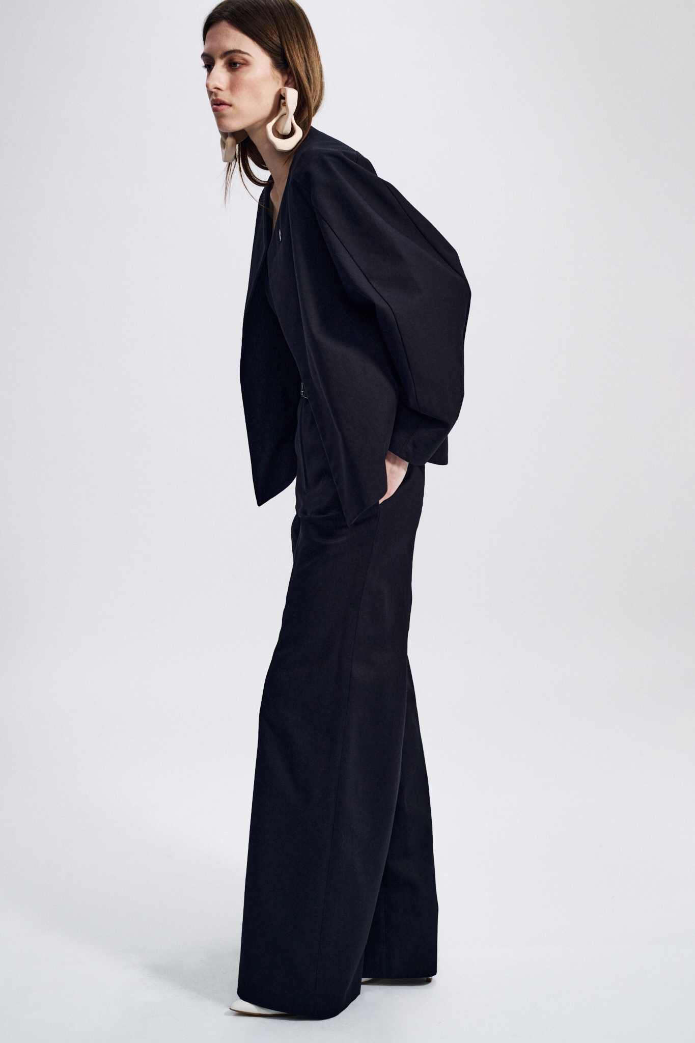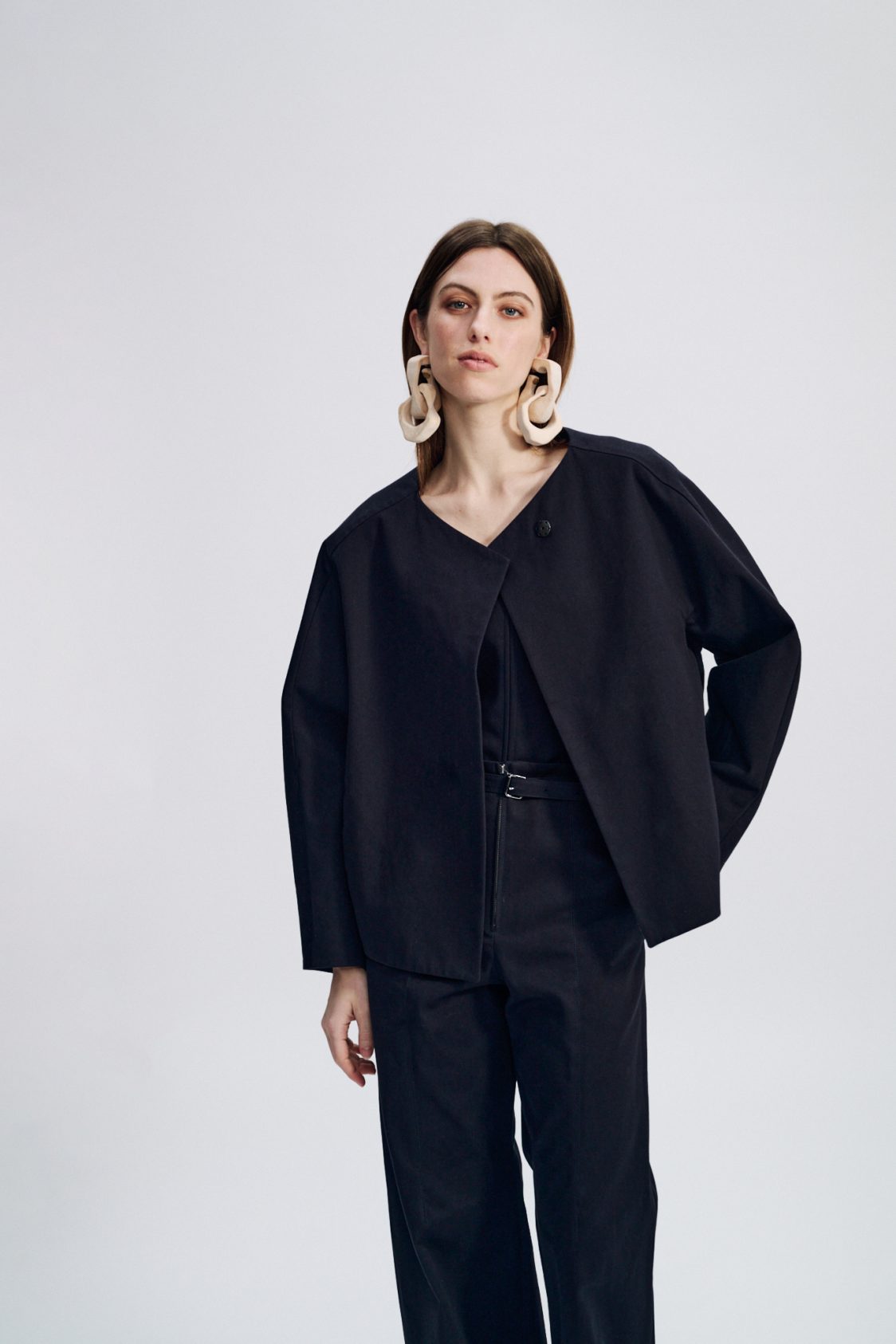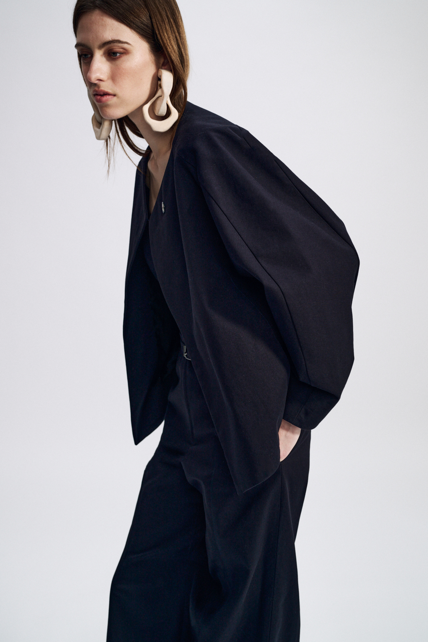 Collarless jacket in cotton gabardine. Its structured cut is distinguished by its voluminous, almost balloon-shaped sleeves. The sharp V-neckline and the asymmetrical draped flap are held by a single snap button. Crafted in a cotton gabardine with an impeccable drape, this piece pairs perfectly with the matching wide-leg trousers for a total look.