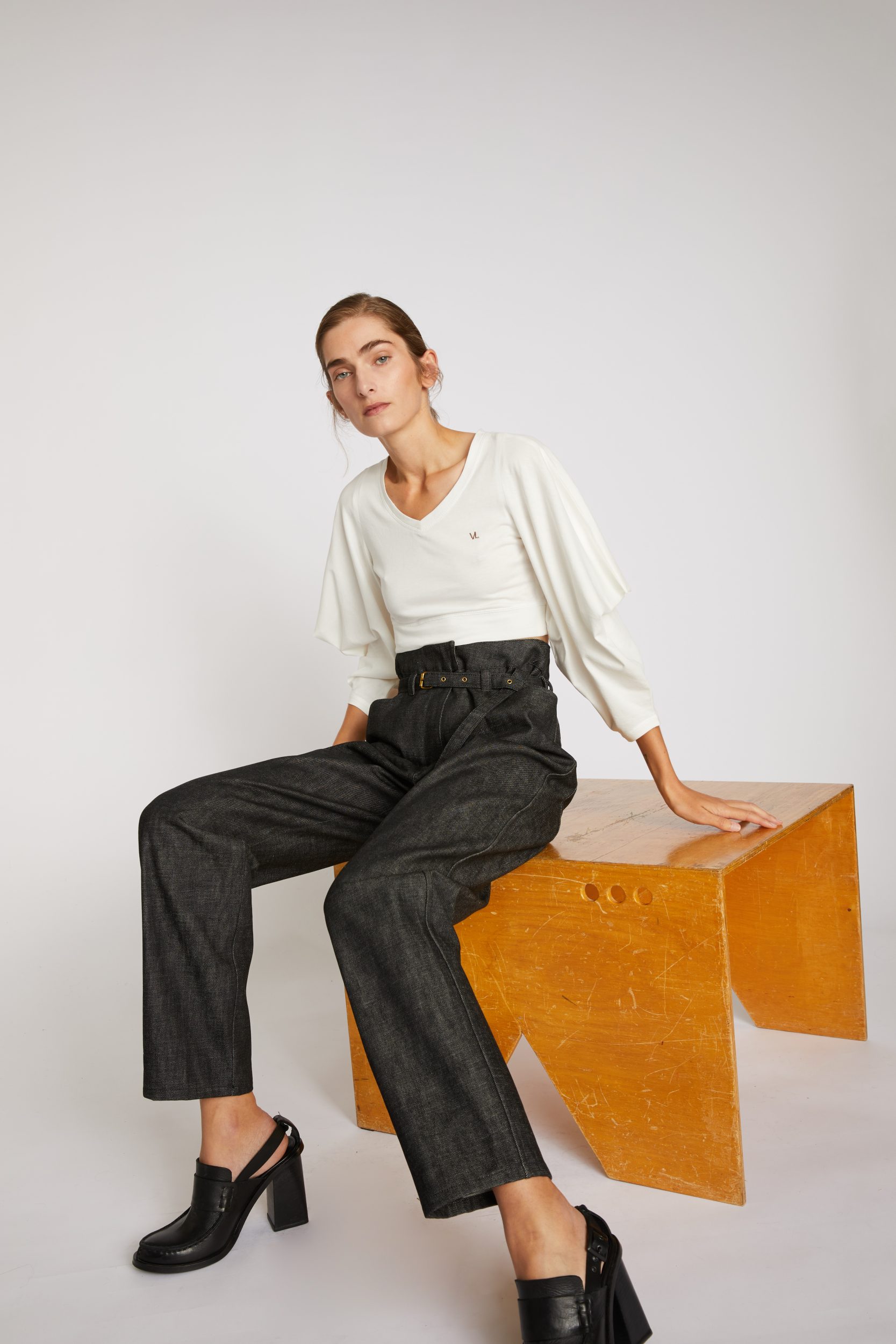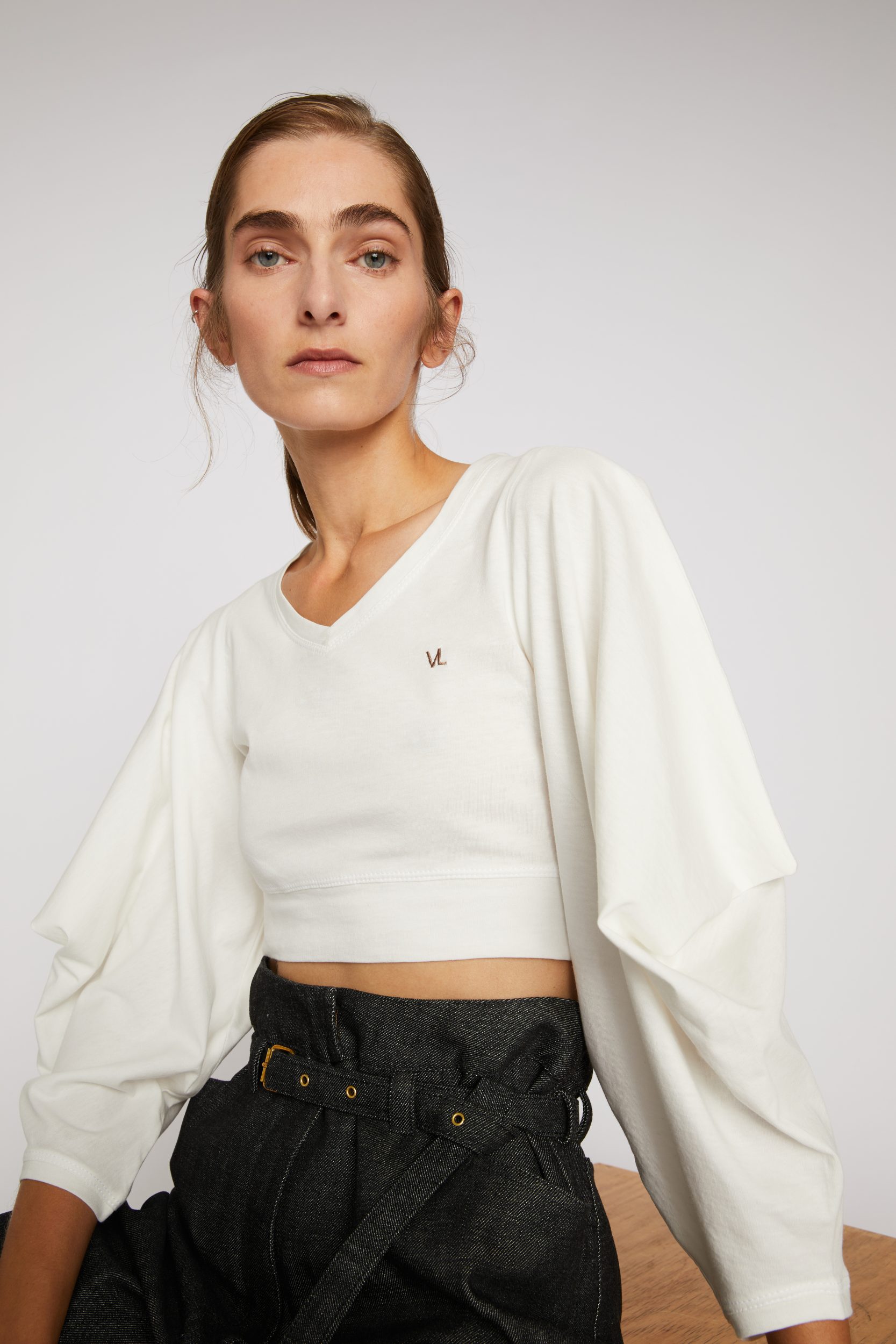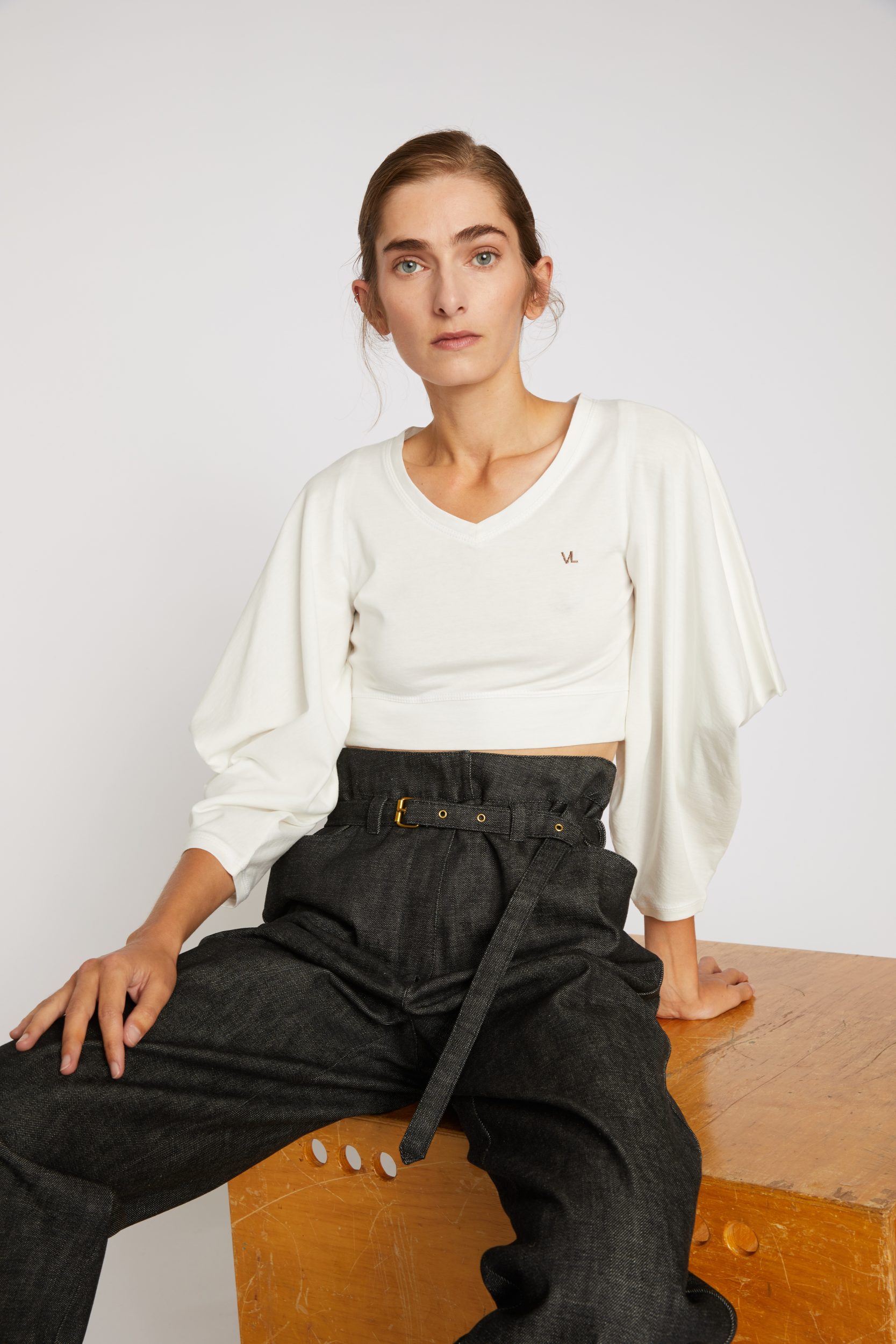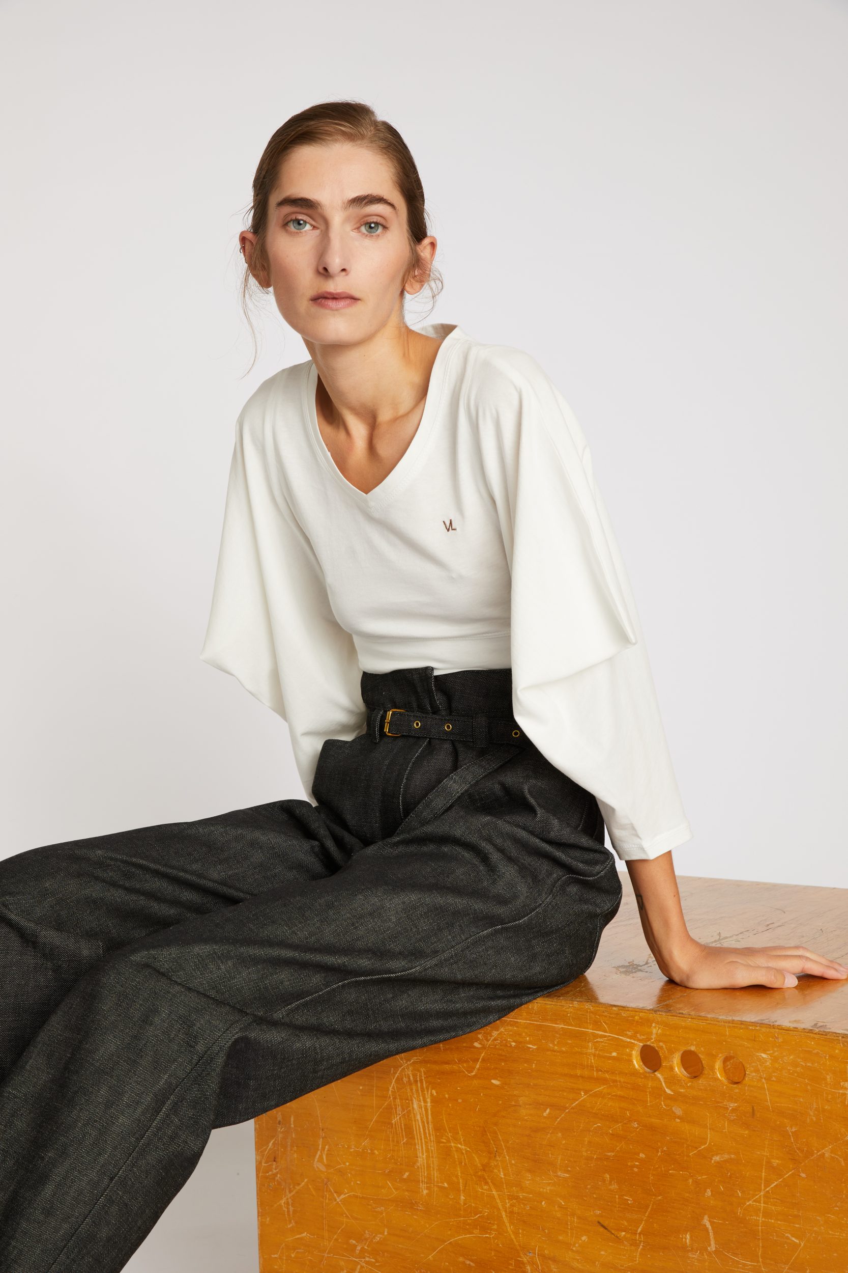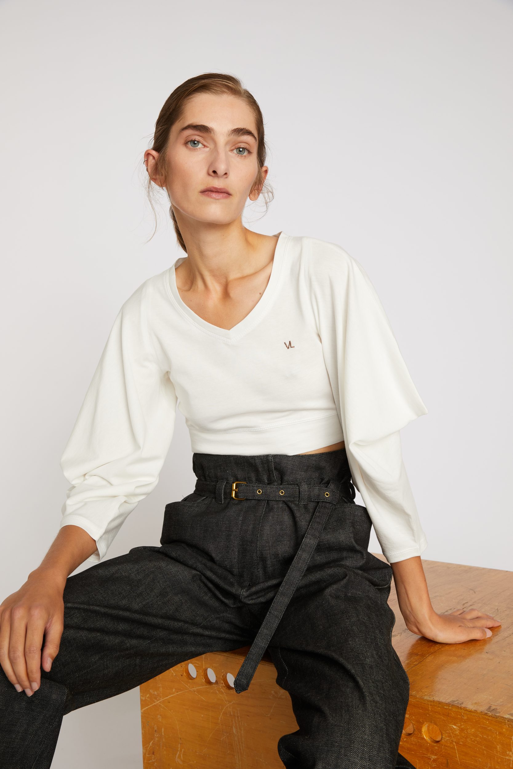 100% cotton Jersey T-Shirt — Rather wide crew neck — Triangle sleeves — Cuff tightened by a hidden piece of fabric for the sleeve to remain in place — Short body length with fitted waist — Brown chain stitch “VL” embroidery