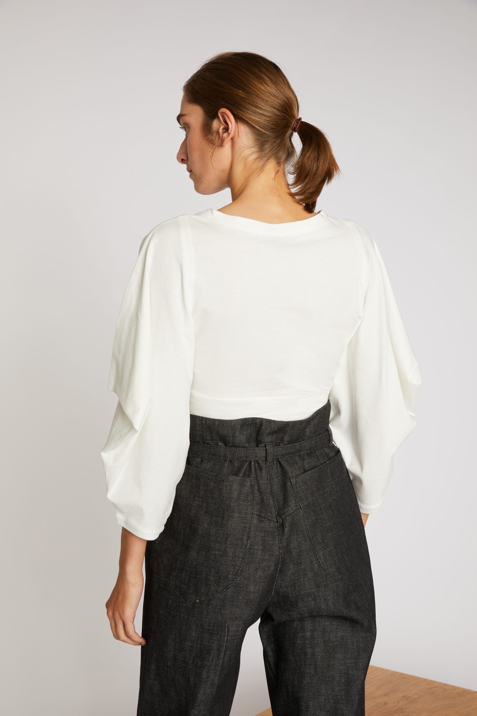 The iconic Veronique Leroy T-Shirt: white and simple, with structural shoulders and sleeves which can be worn two ways: with triangular clean shoulders, or with the shoulders folded inwards to create a sleeve with curved shapes – now in a crop version.