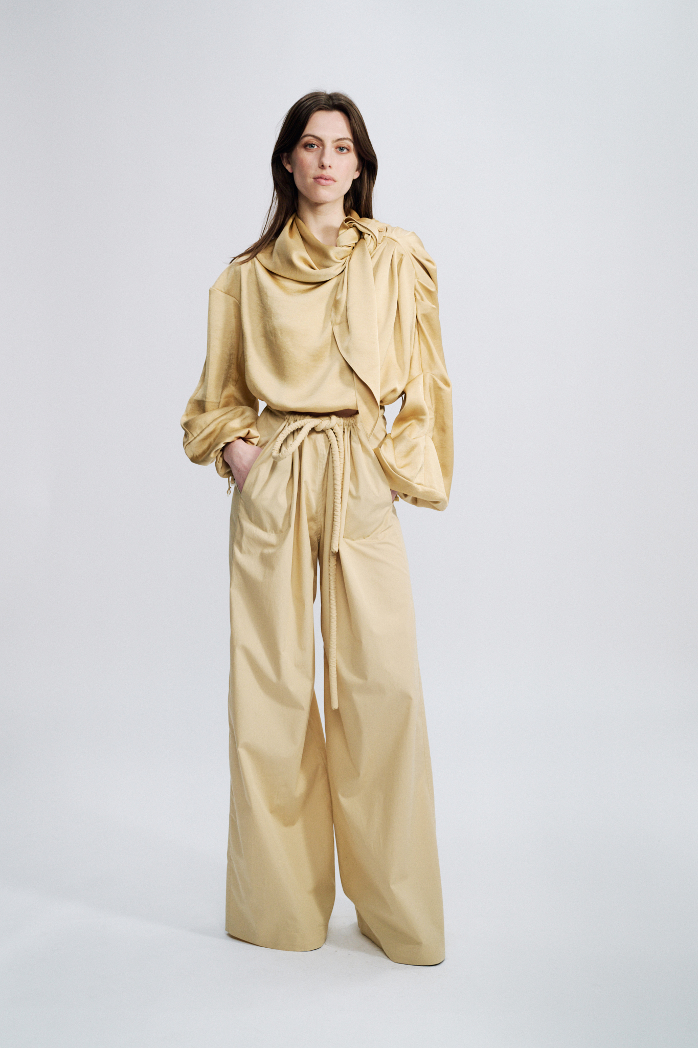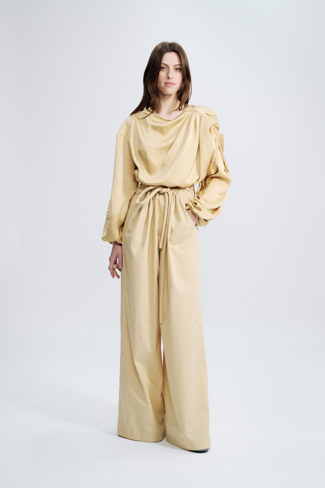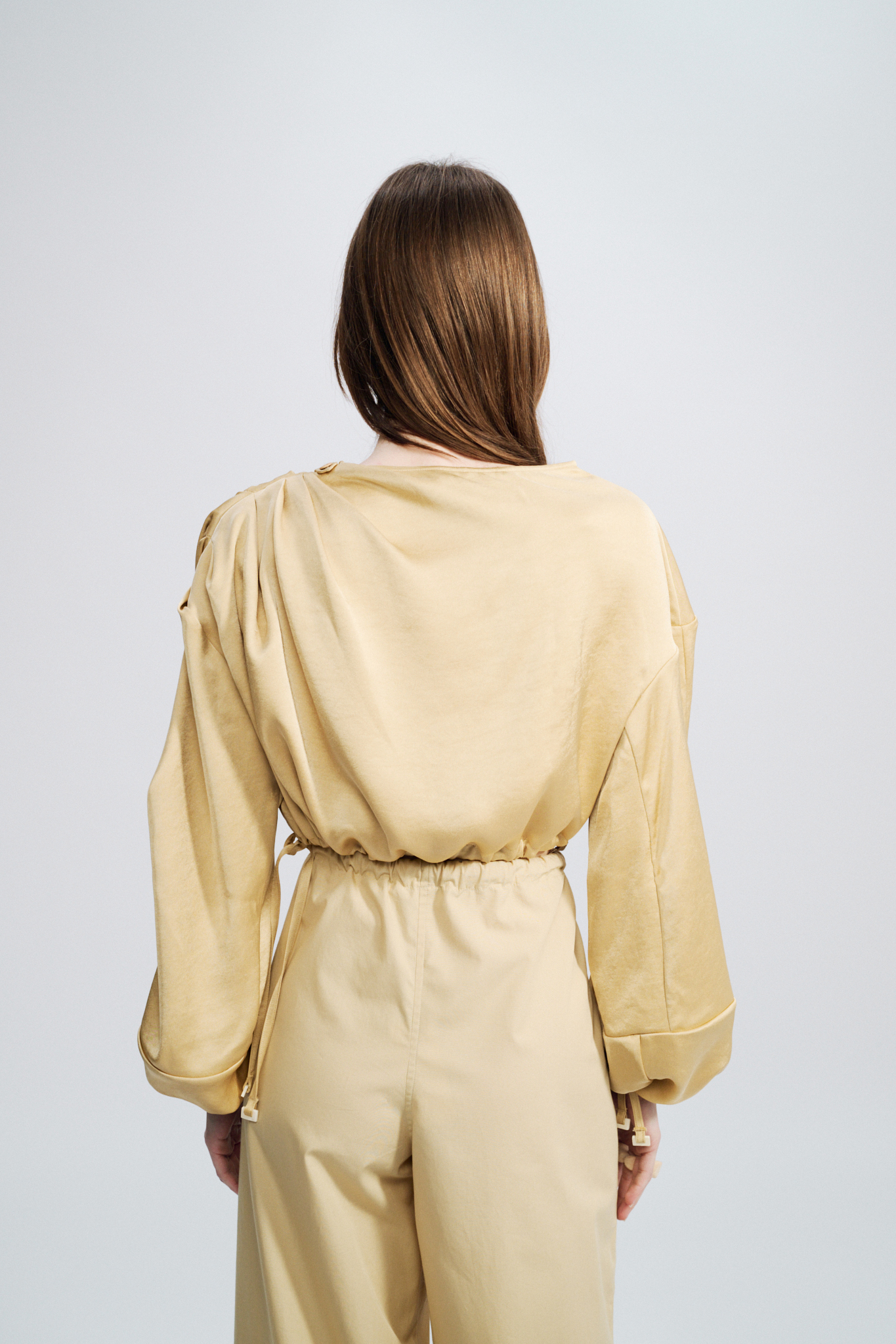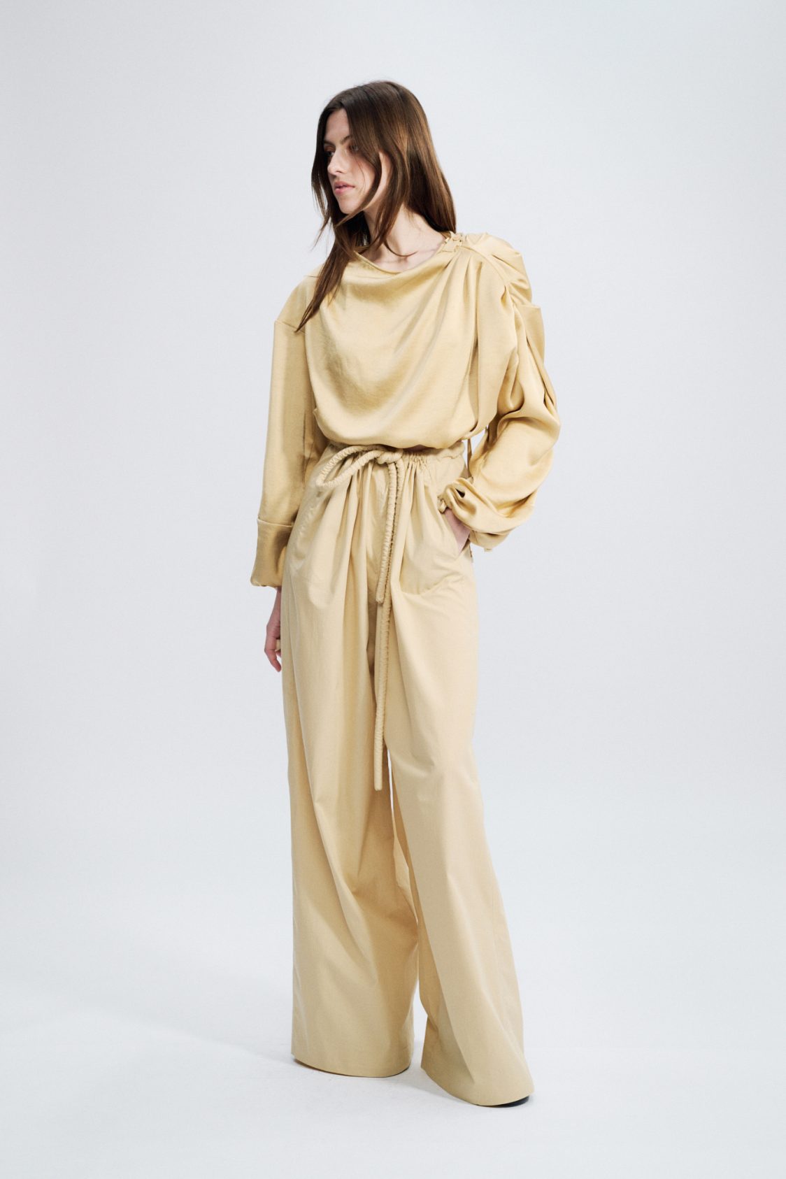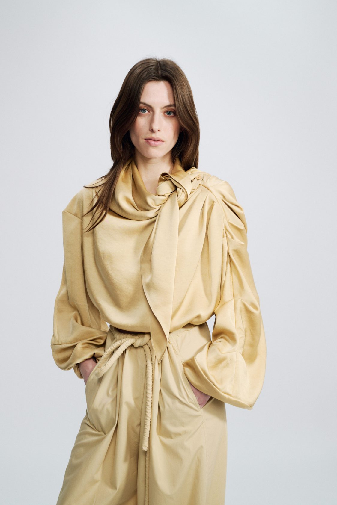 A more dressed-up, luxurious cropped version of our signature draped top, crafted here from a fluid viscose sattin.