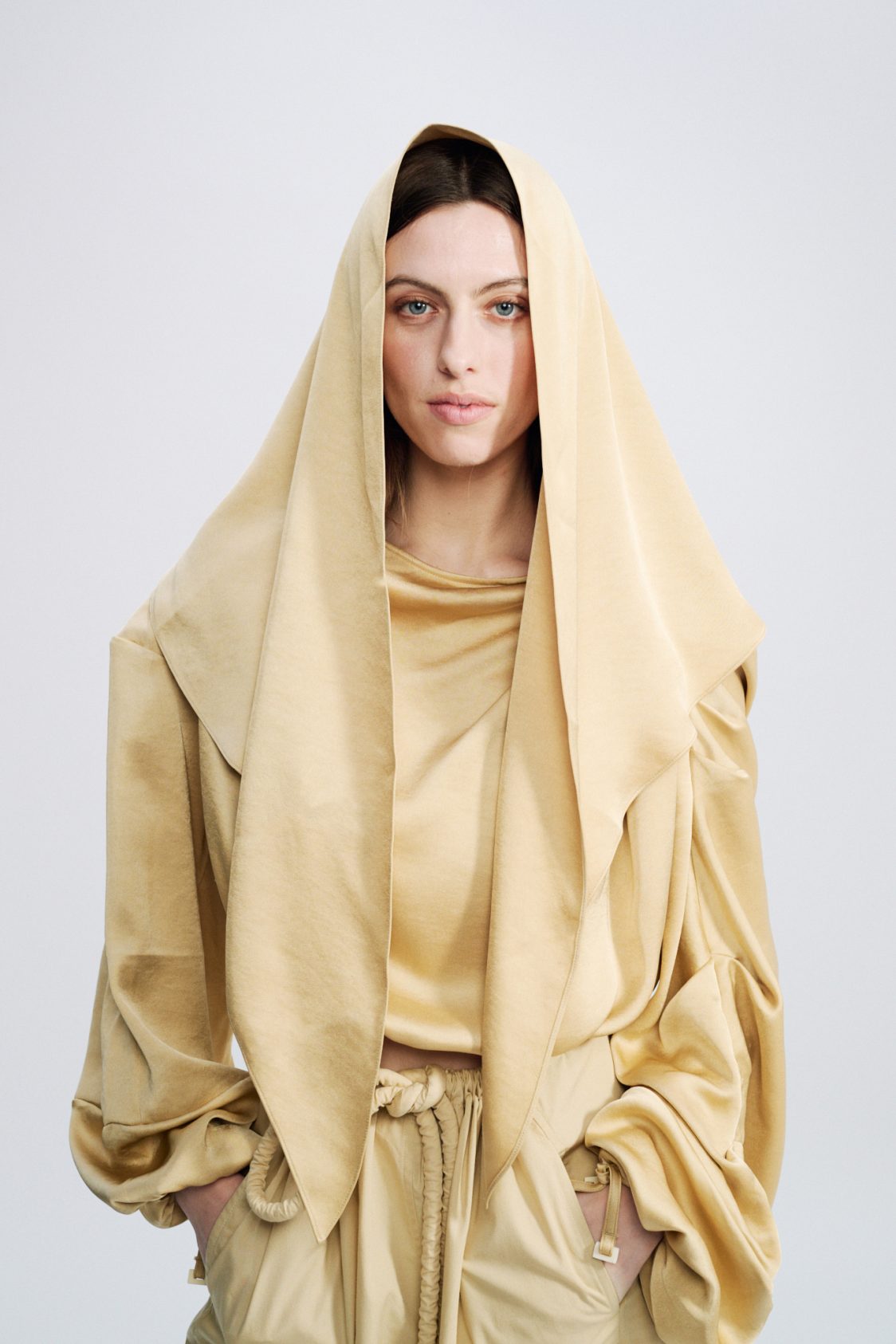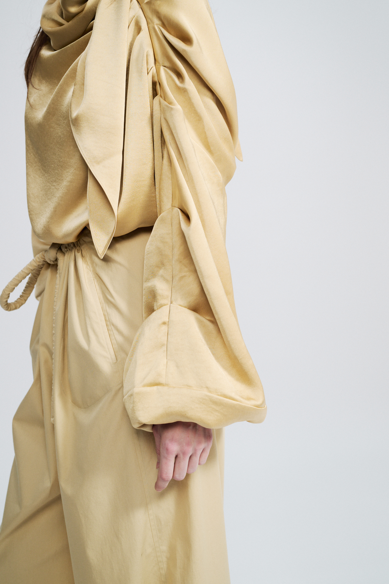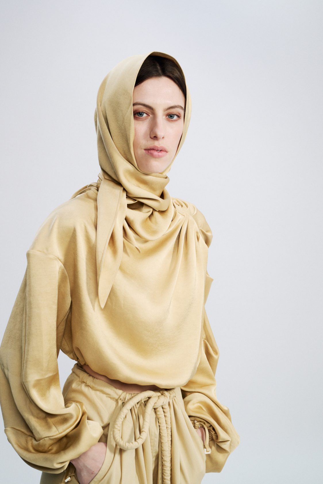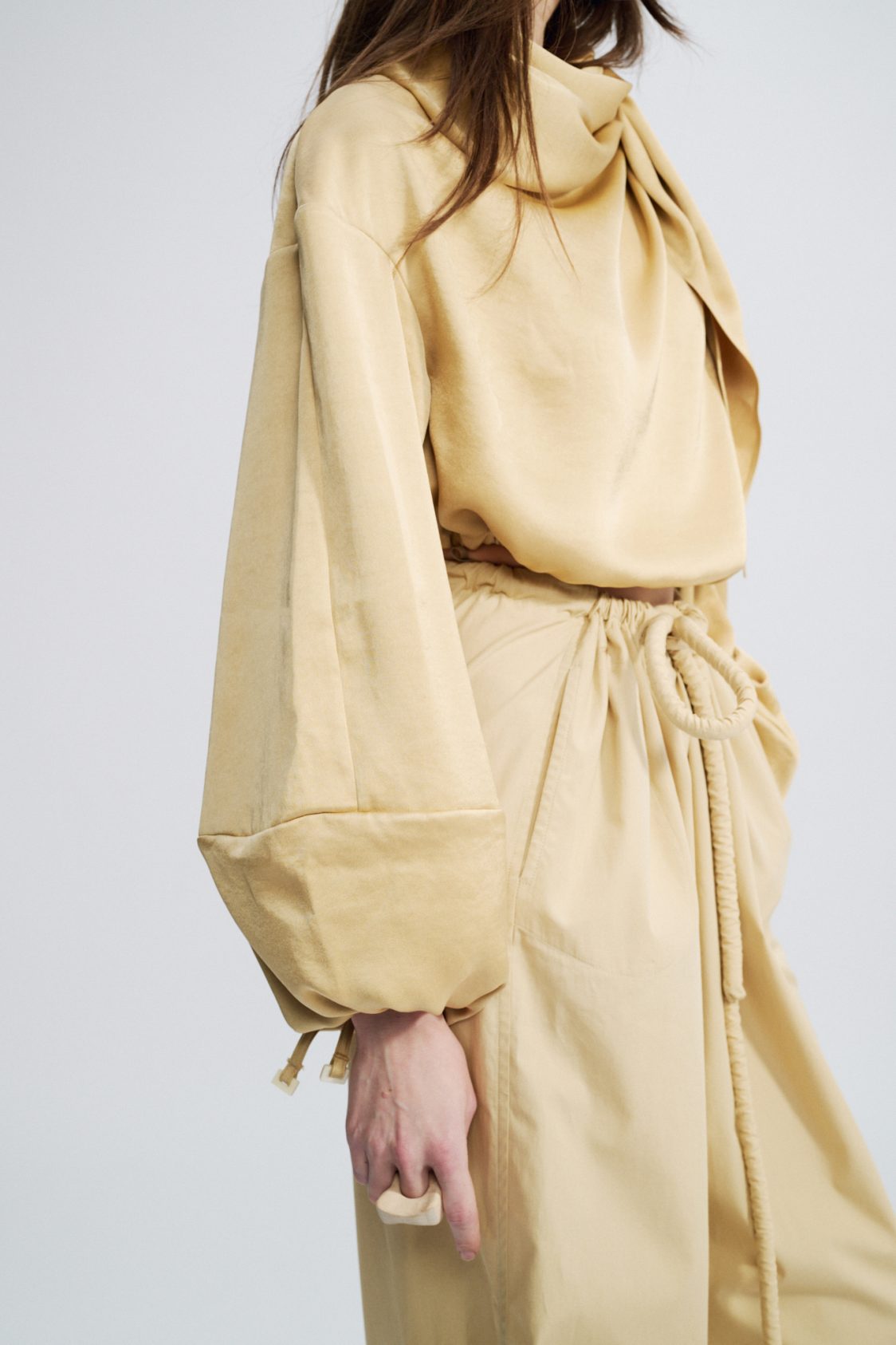 Gathered shoulder for structure — Zip opening along the shoulder — Elasticated cuffs — Adjustable drawstring at the waist — Removable scarf detail