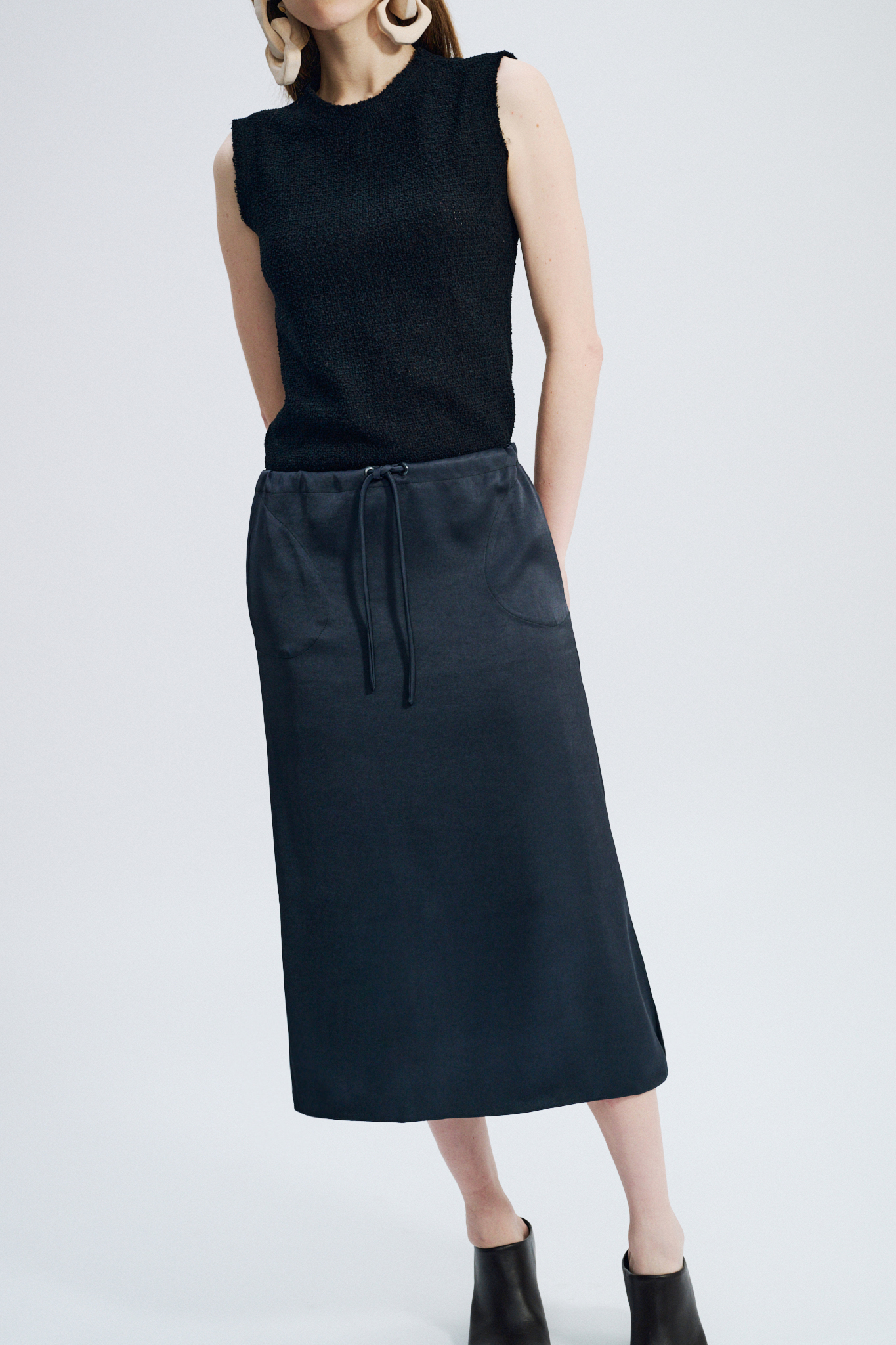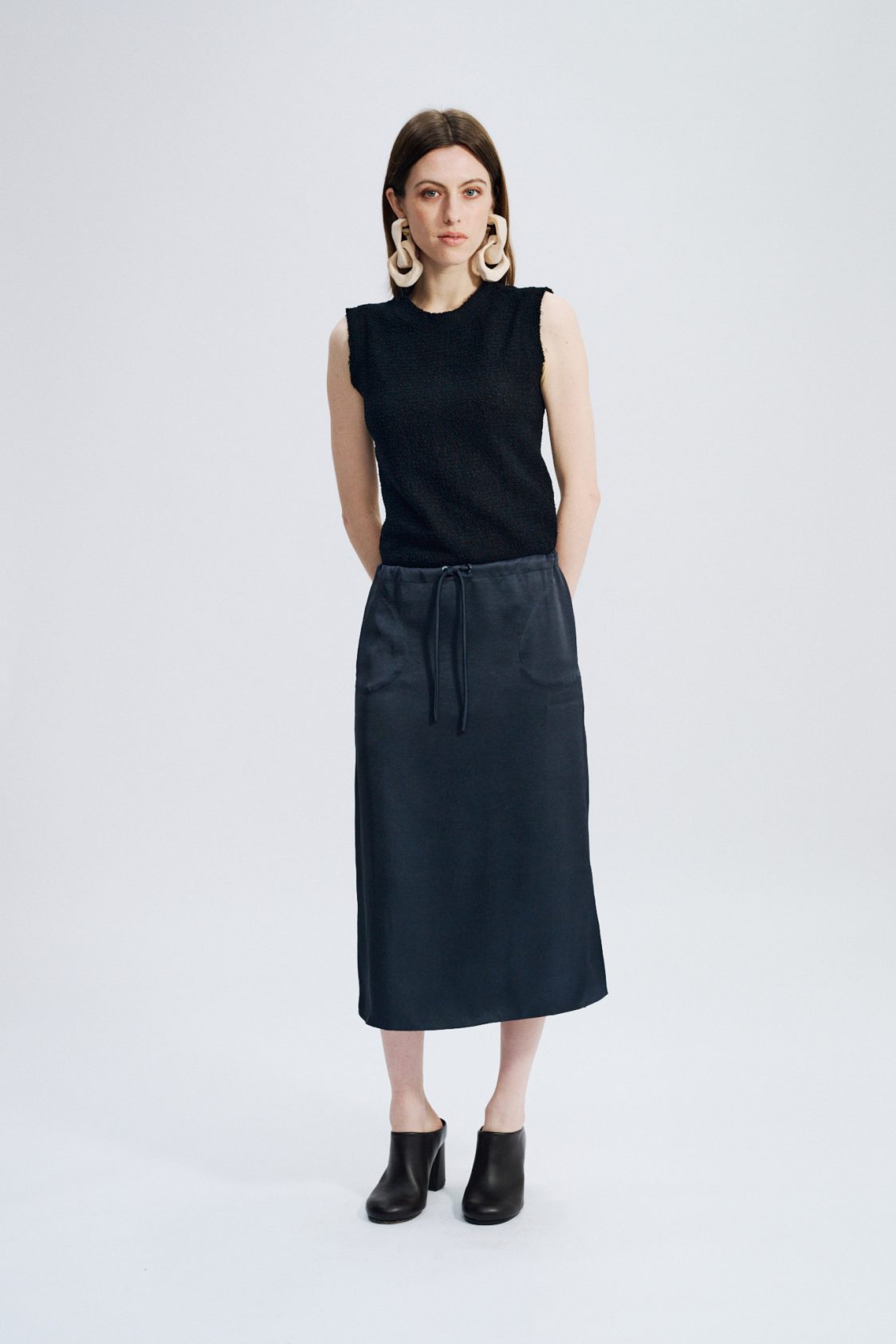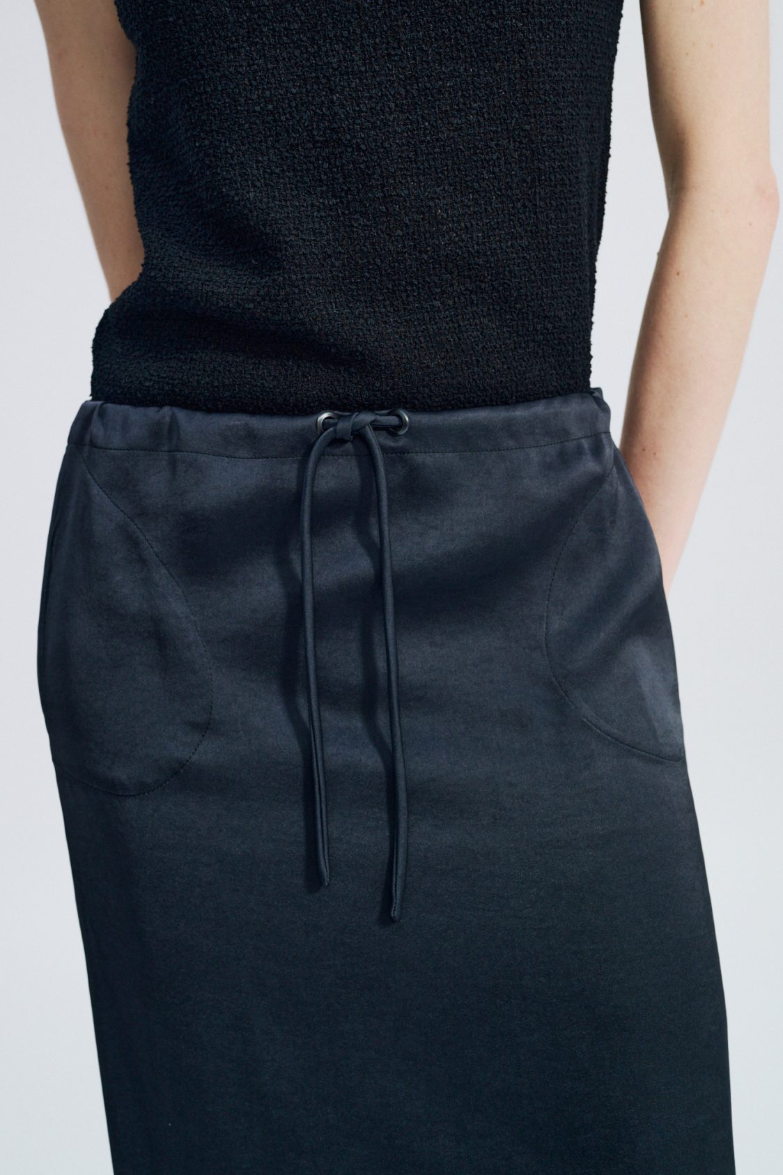 Below-the-knee length — Two side in-seam pockets — Side slits — Waist drawstring