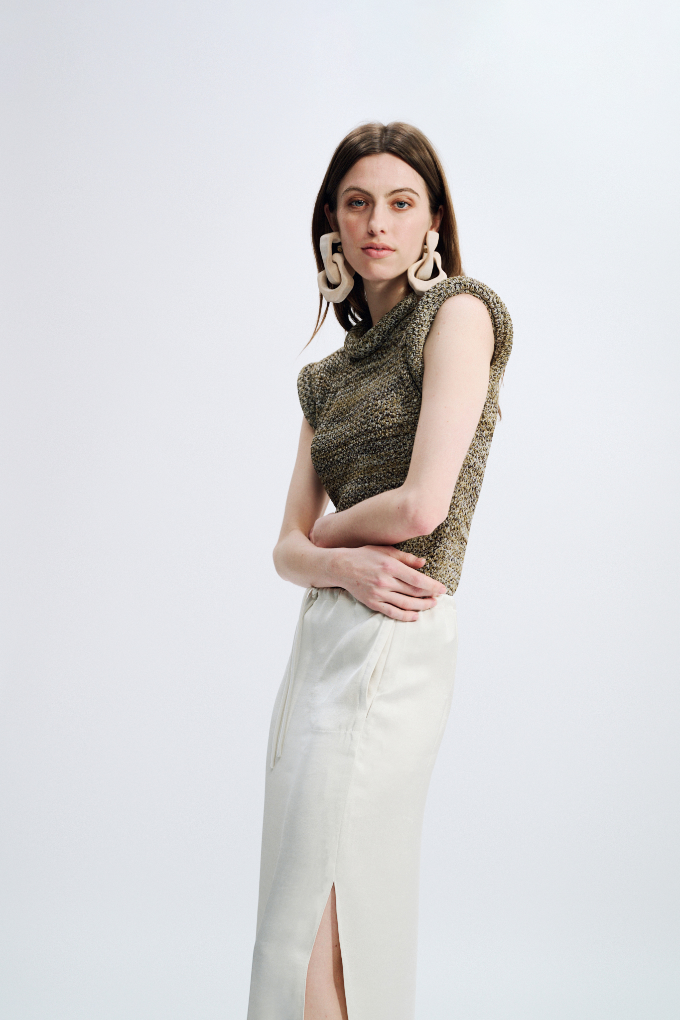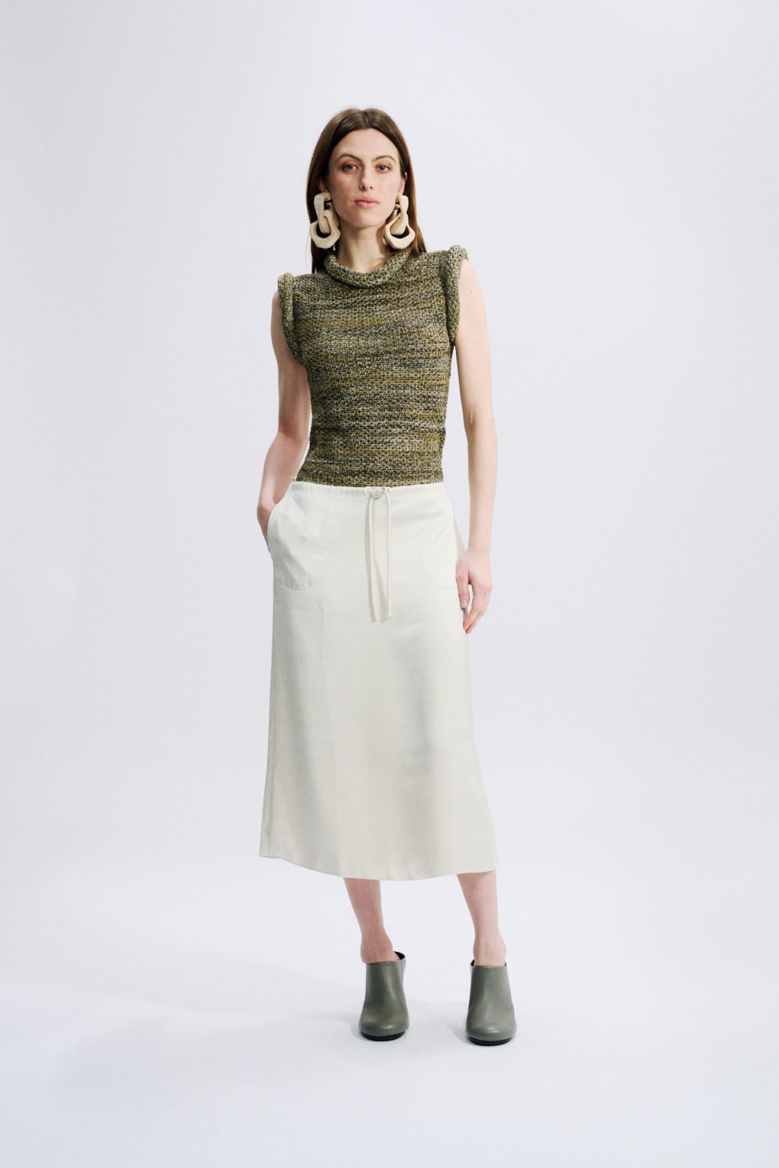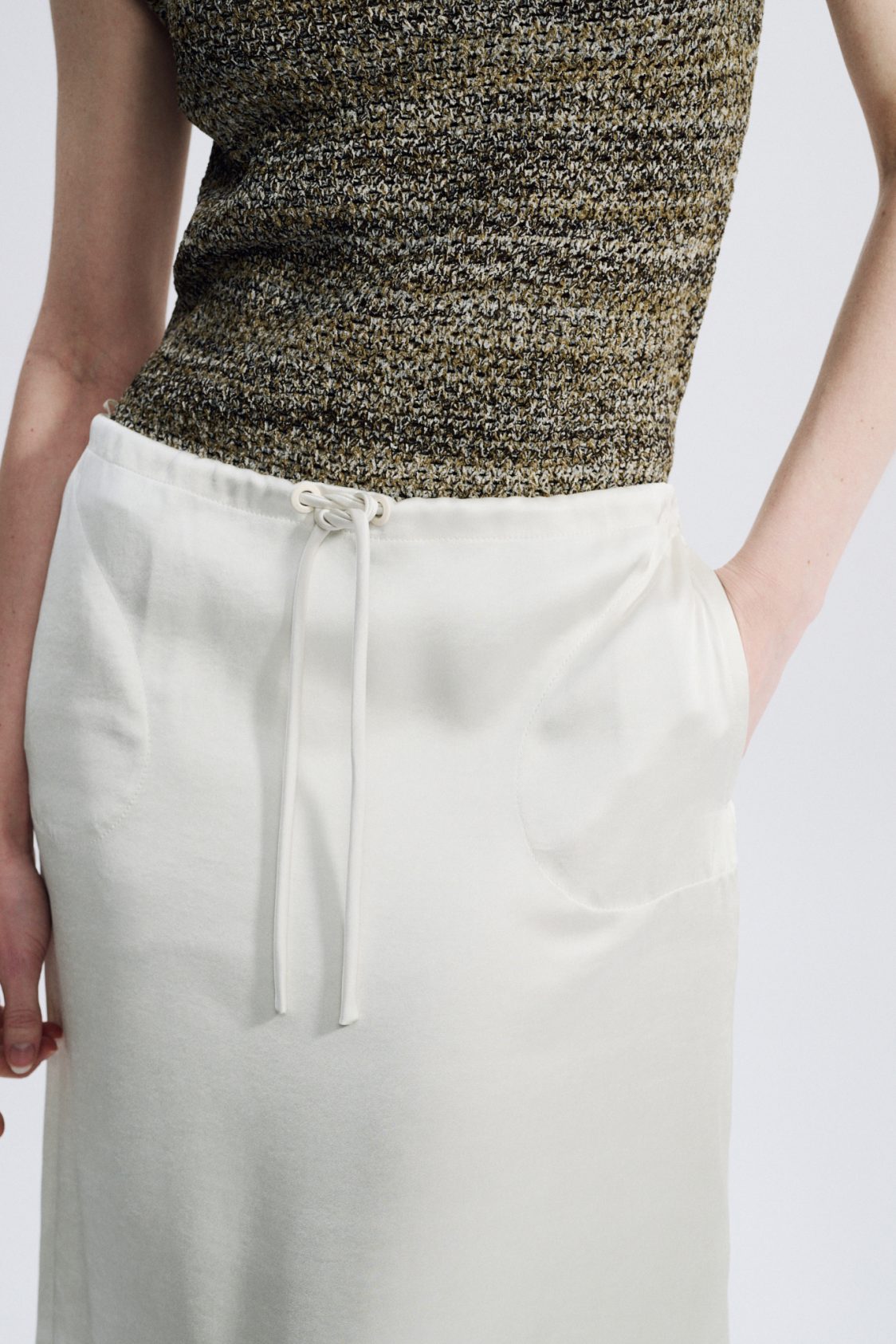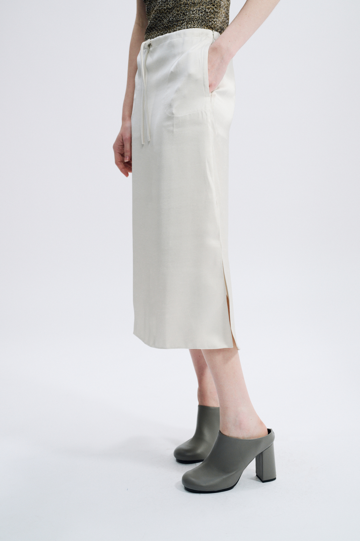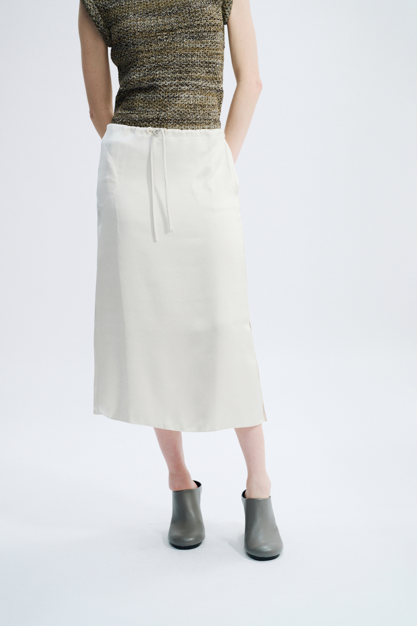 Below-the-knee length — Two side in-seam pockets — Side slits — Waist drawstring