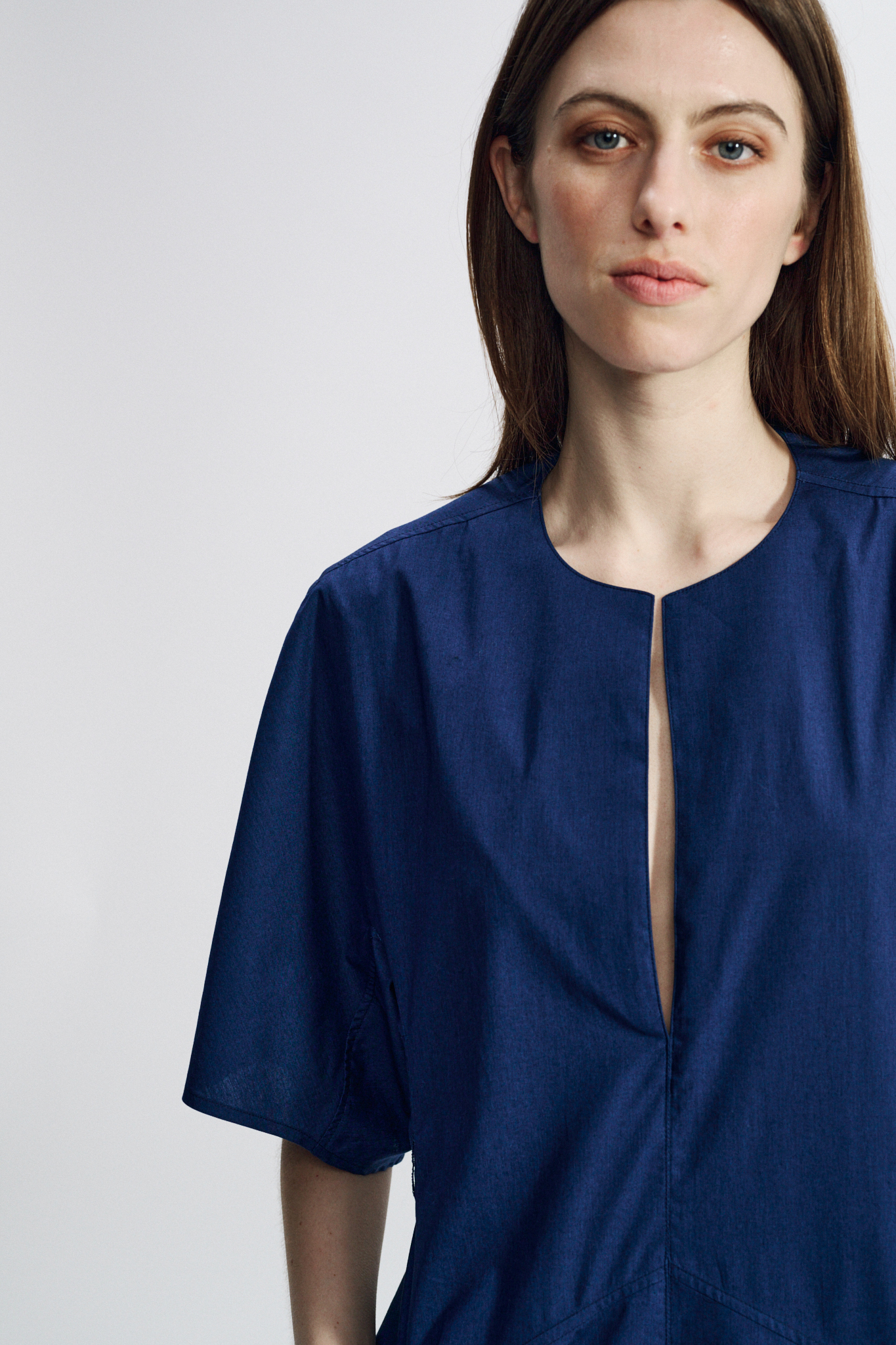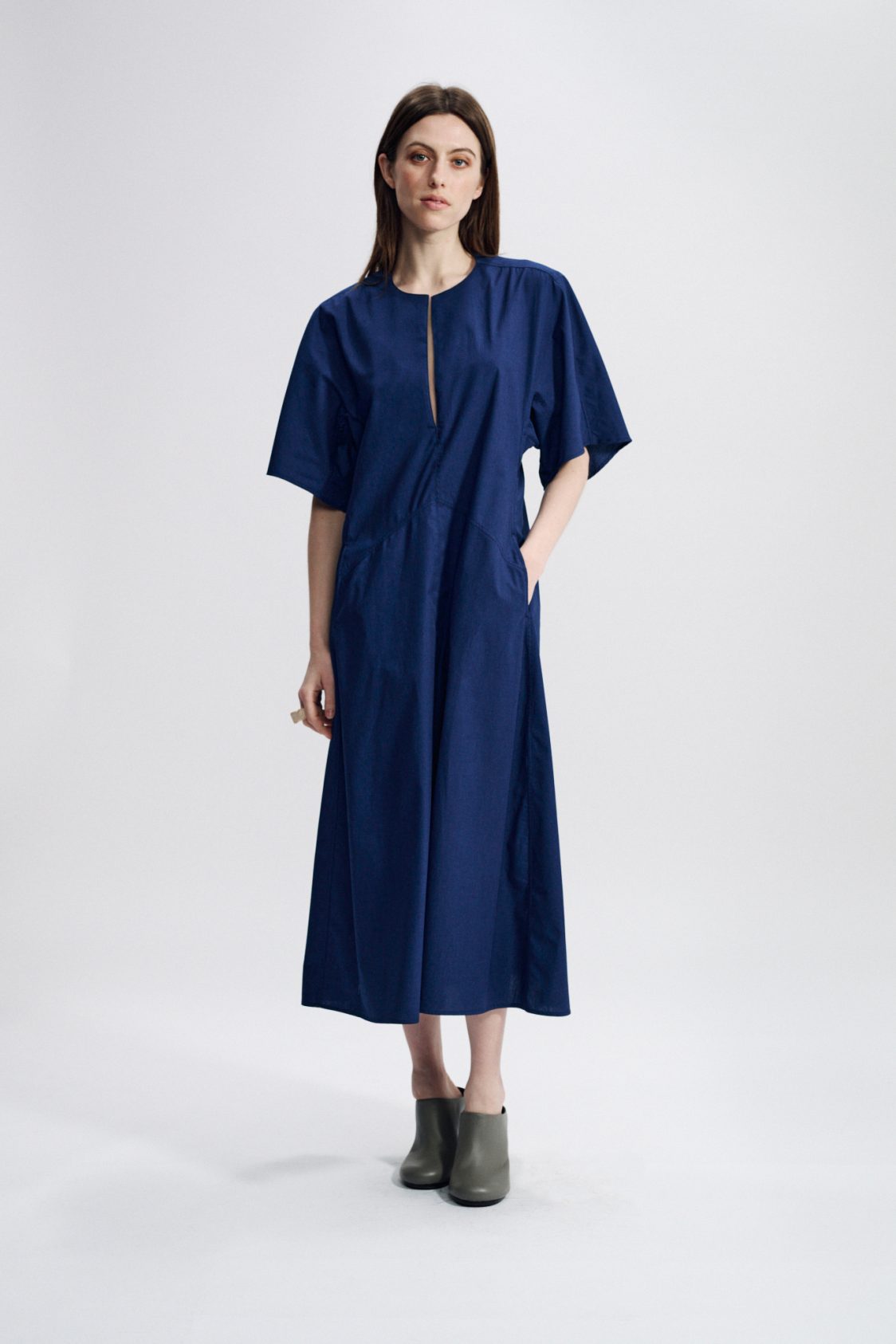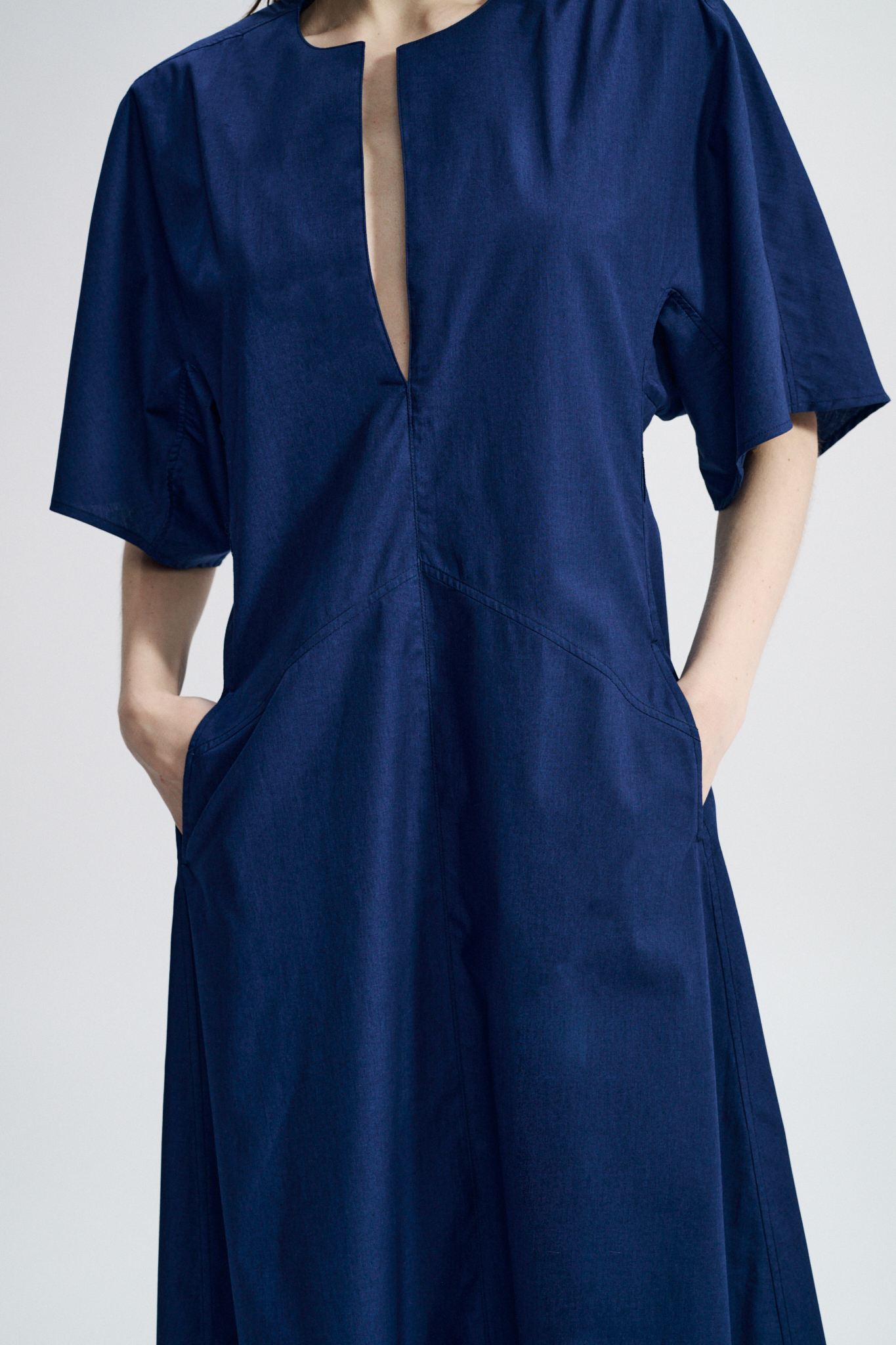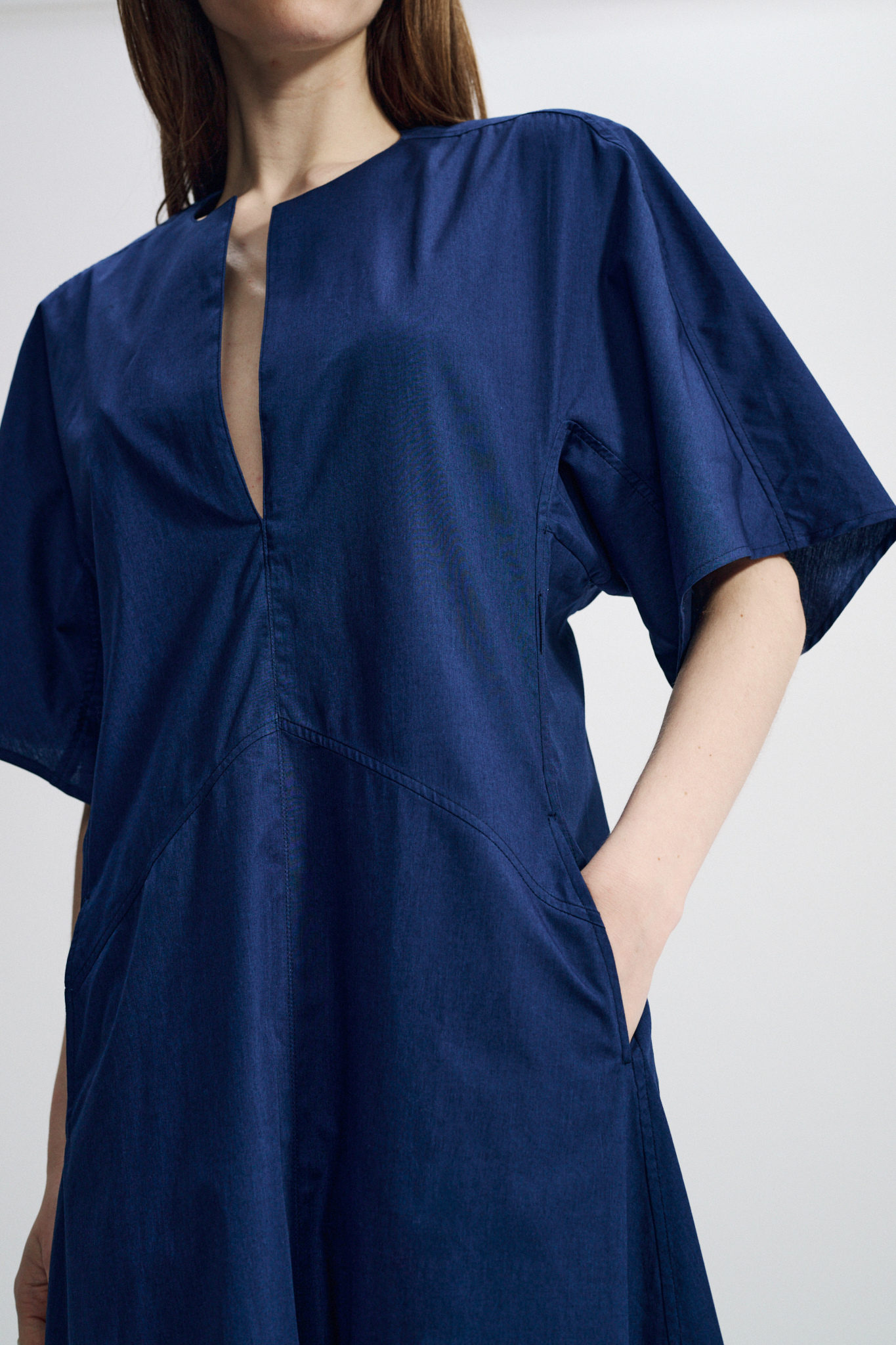 An architectural and deconstructed dress, iconic of the Véronique Leroy style, crafted from premium cotton poplin. It features a generous oversized volume, accentuated by wide short sleeves and a flared, multi-paneled skirt. The round neckline opens into a deep, clean-cut V-slit. The waist is adjustable thanks to a fine, delicate drawstring, allowing for a versatile fit. The dress is finished with functional pockets integrated into the topstitched side seams. This piece pairs perfectly with heeled mules for an elegant and minimalist silhouette.
