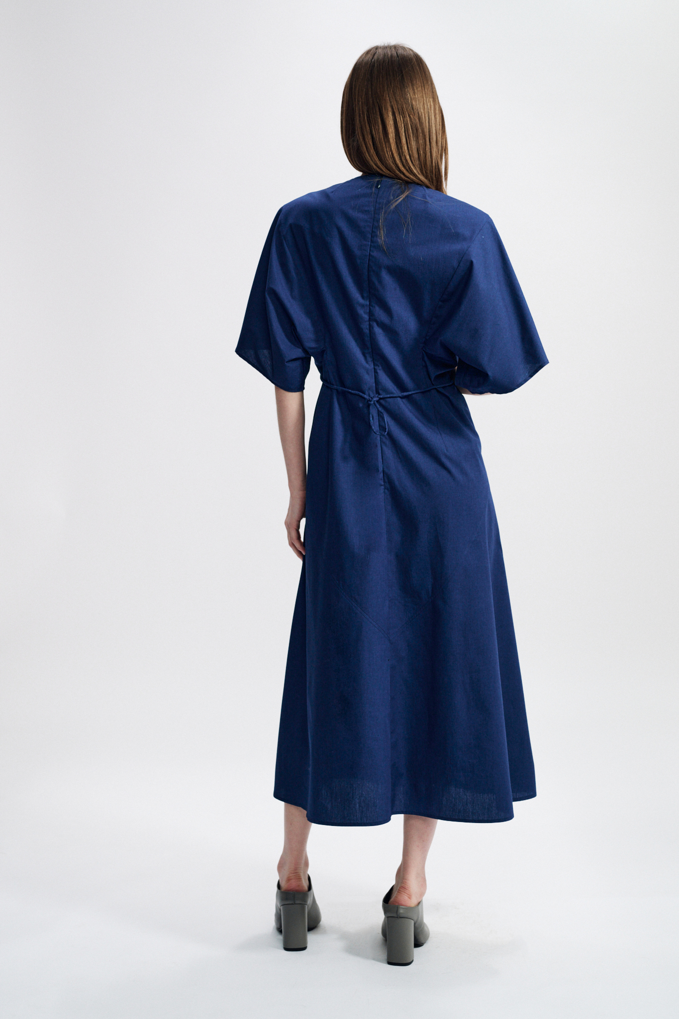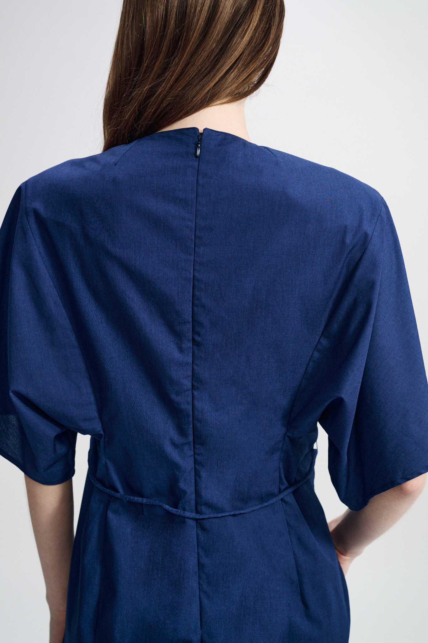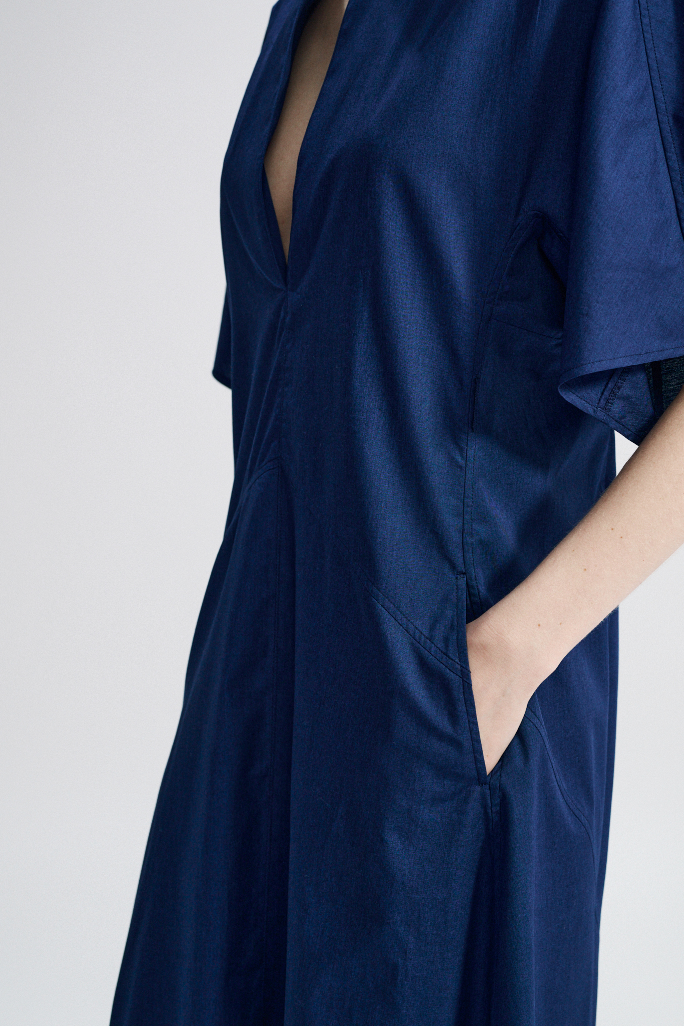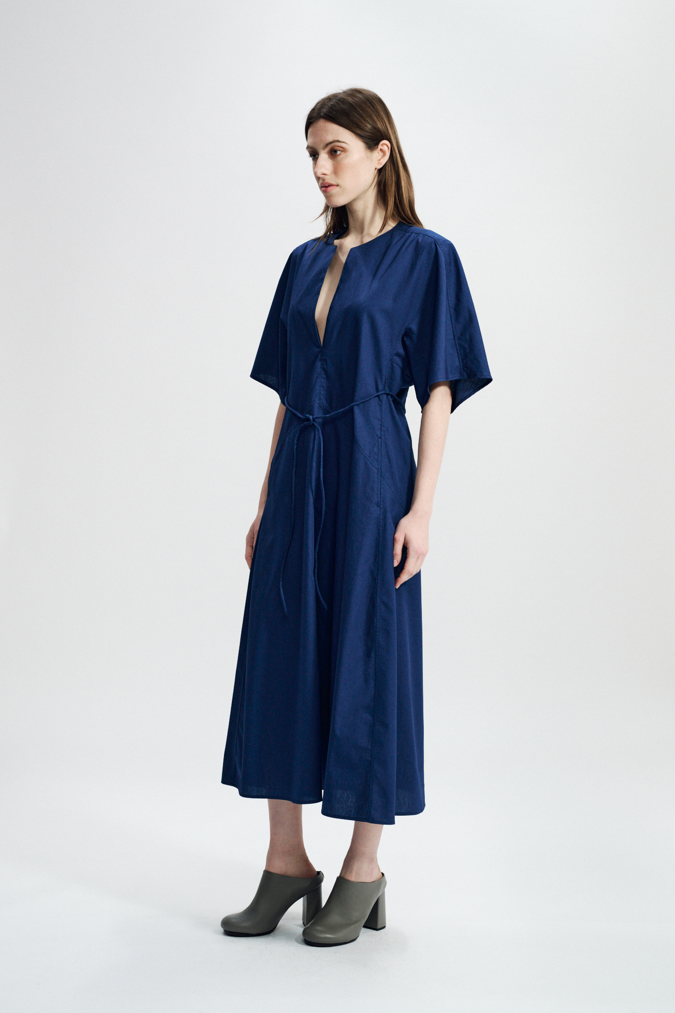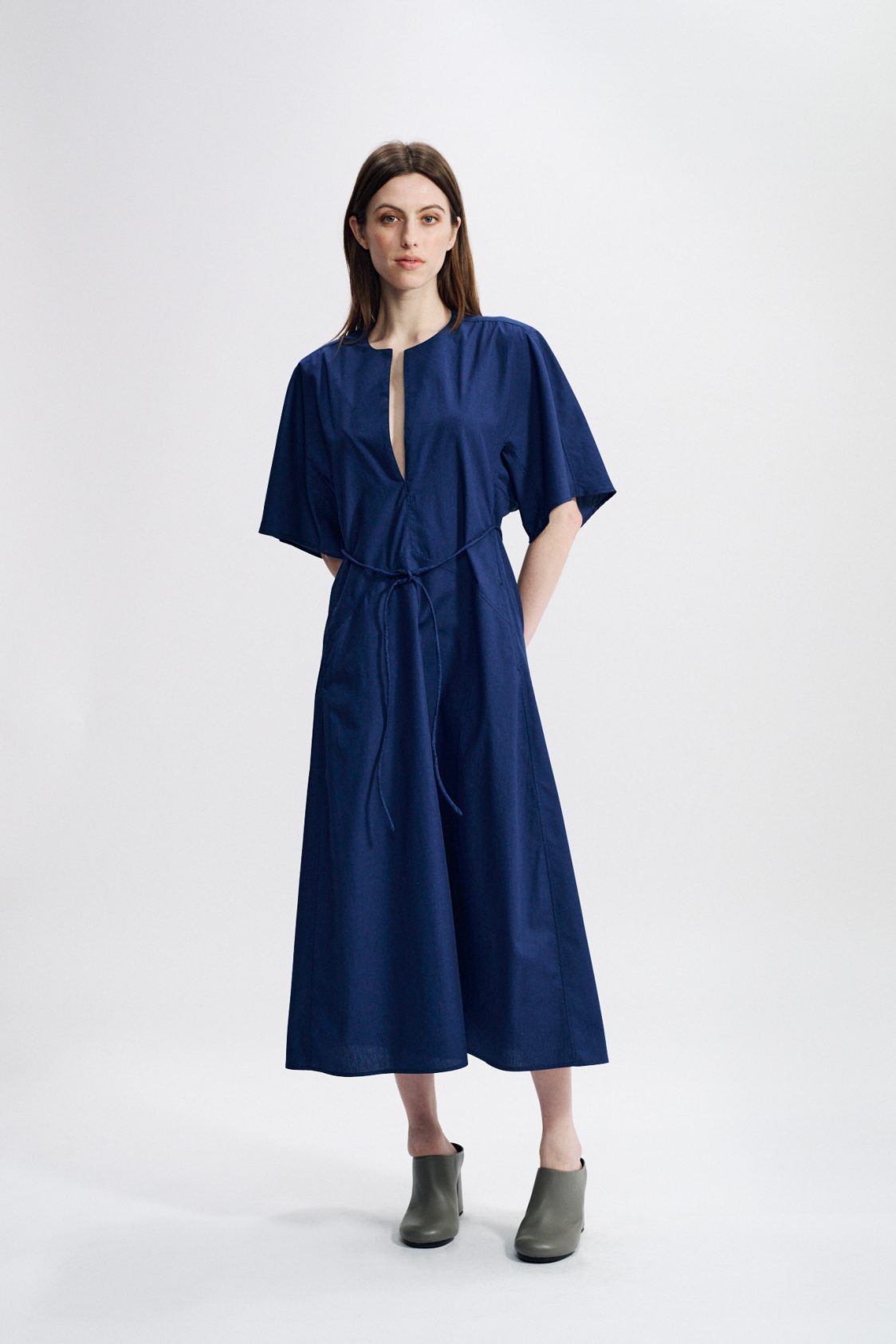 An architectural and deconstructed dress, iconic of the Véronique Leroy style, crafted from premium cotton poplin. It features a generous oversized volume, accentuated by wide short sleeves and a flared, multi-paneled skirt. The round neckline opens into a deep, clean-cut V-slit. The waist is adjustable thanks to a fine, delicate drawstring, allowing for a versatile fit. The dress is finished with functional pockets integrated into the topstitched side seams. This piece pairs perfectly with heeled mules for an elegant and minimalist silhouette.