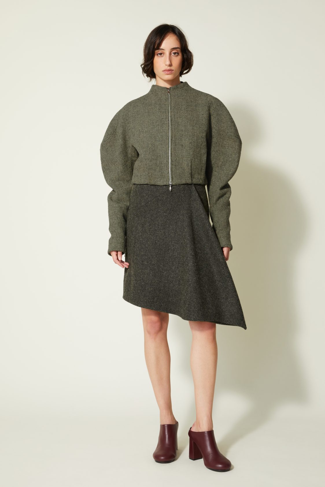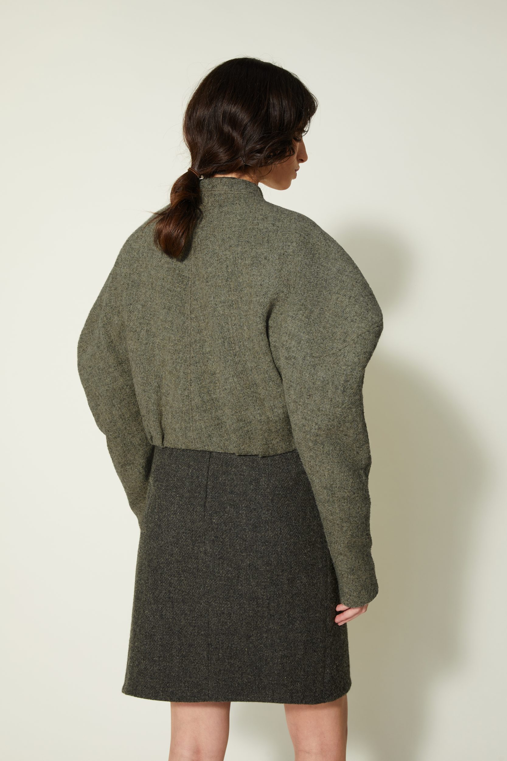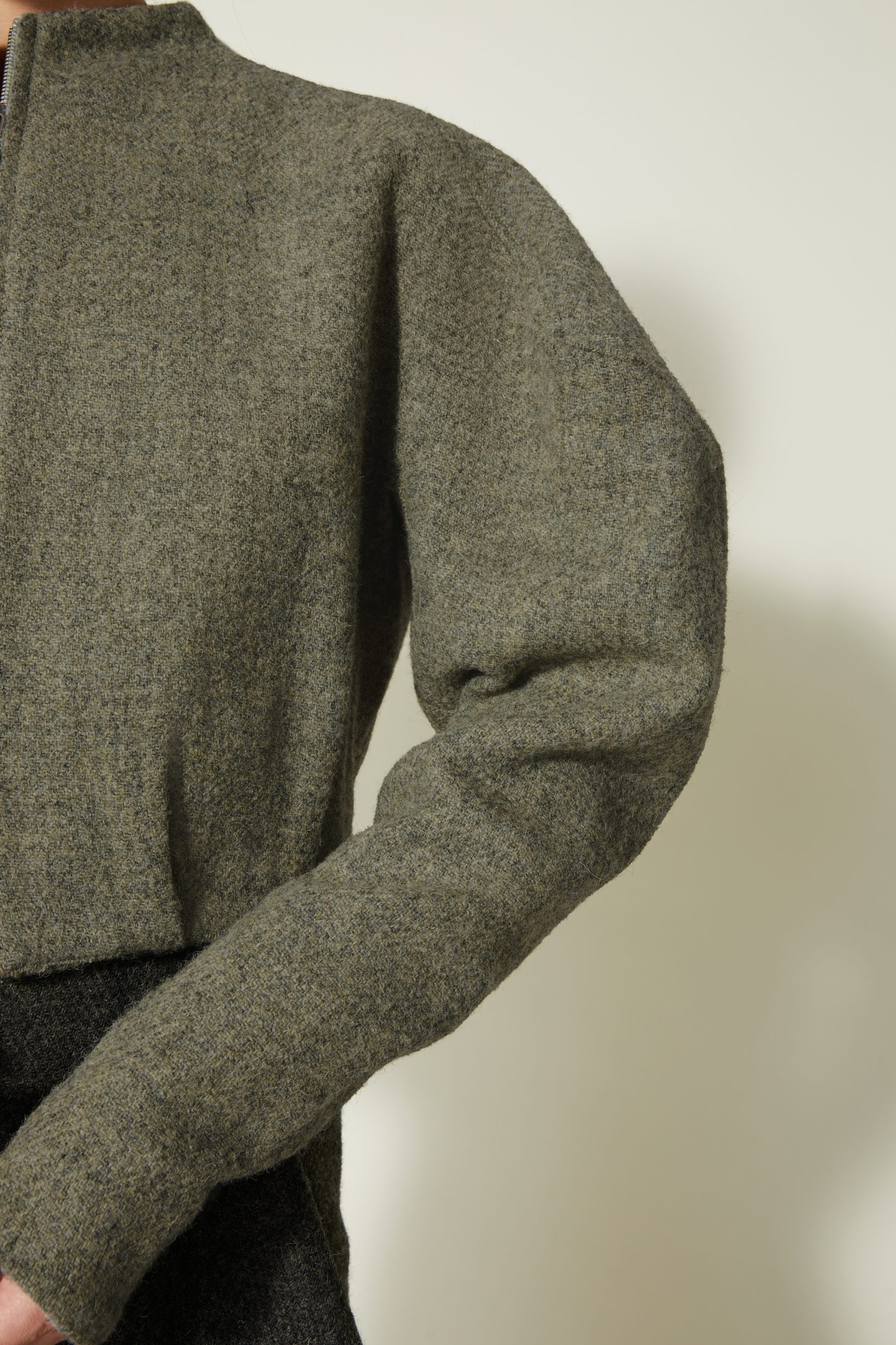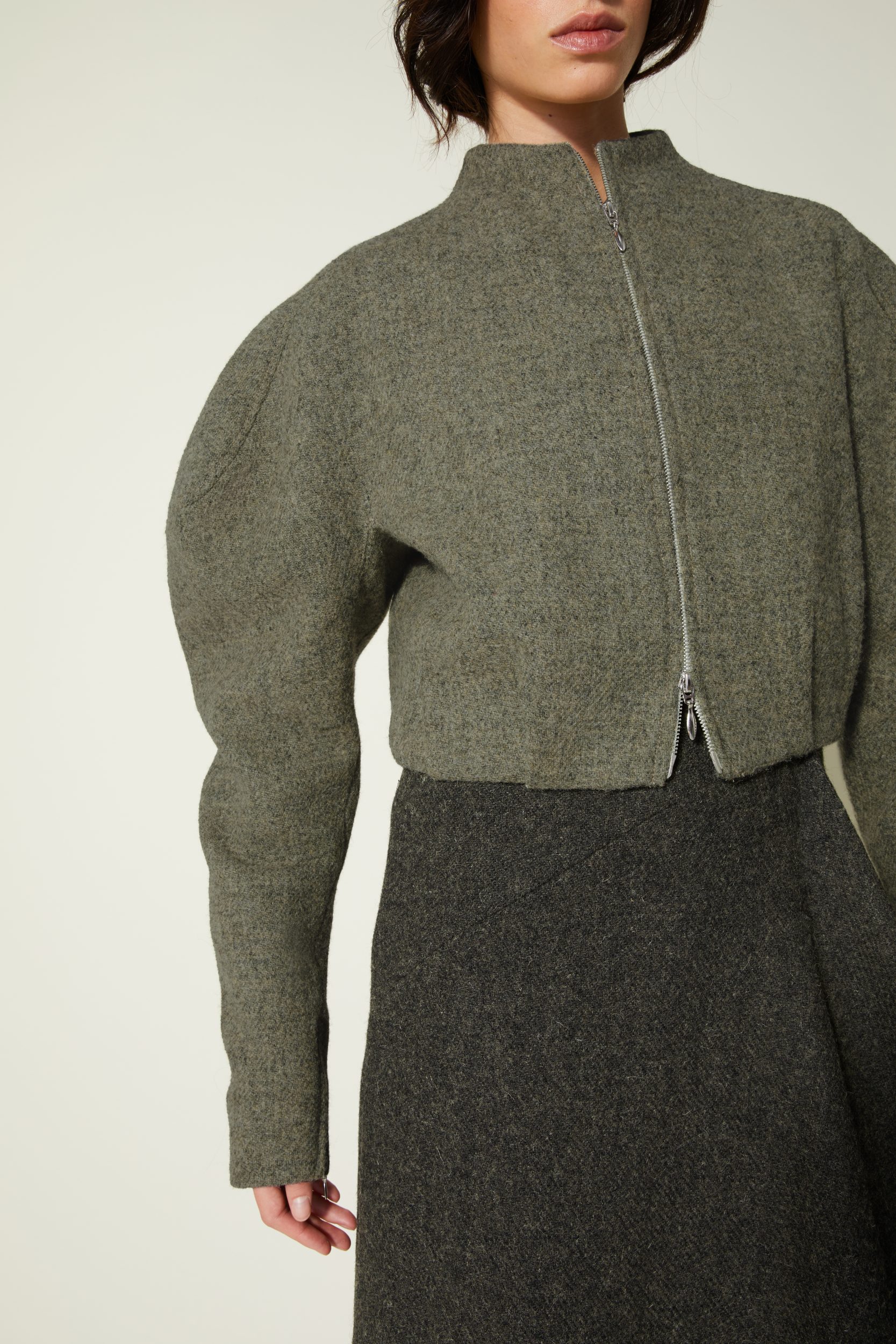 Jacket crafted in genuine Harris Tweed. The sleeves are sculpted — a prominent shape of the season — and taper toward the zipped cuff. Double-slider zipper at the front.