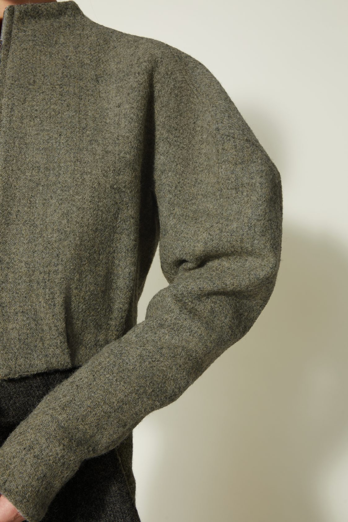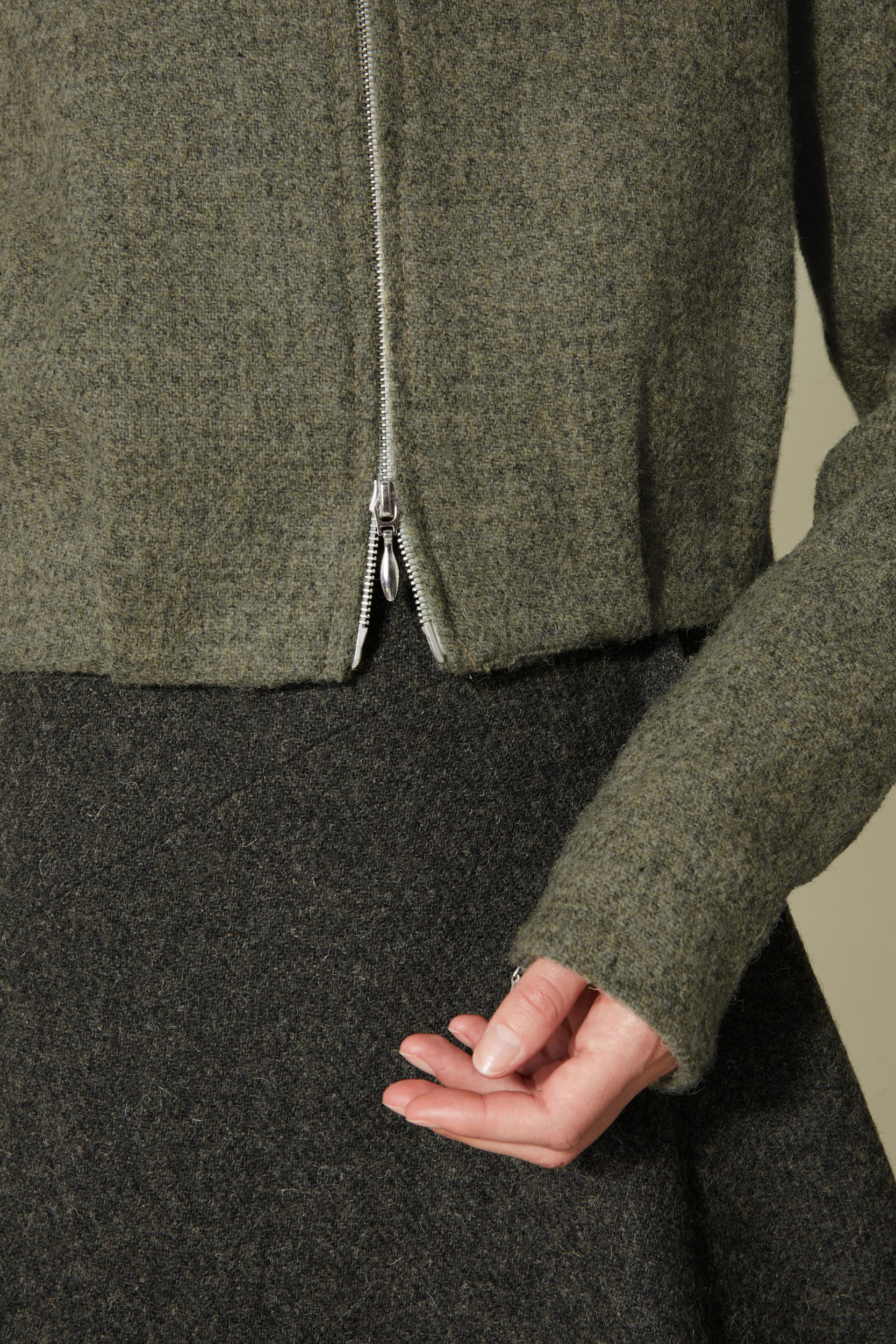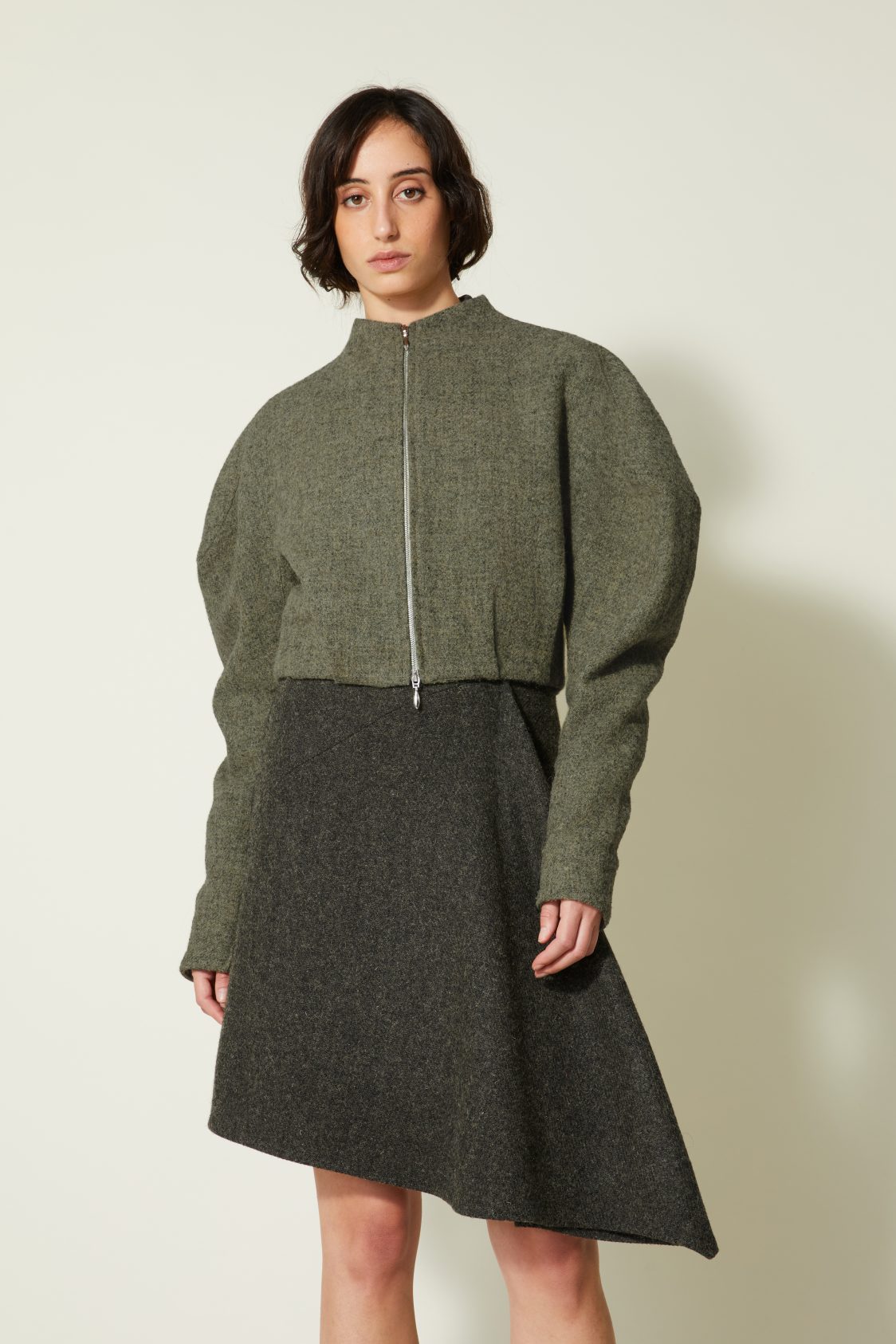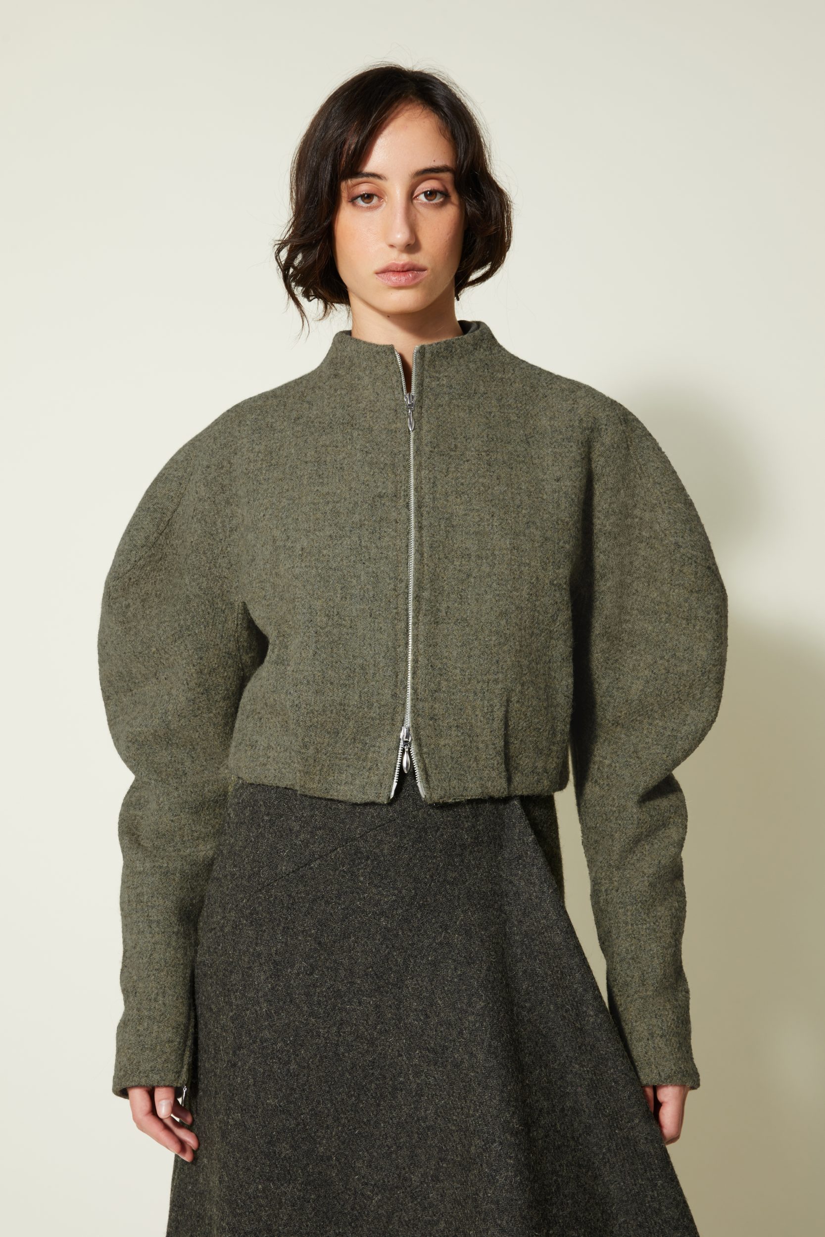 Jacket crafted in genuine Harris Tweed. The sleeves are sculpted — a prominent shape of the season — and taper toward the zipped cuff. Double-slider zipper at the front.