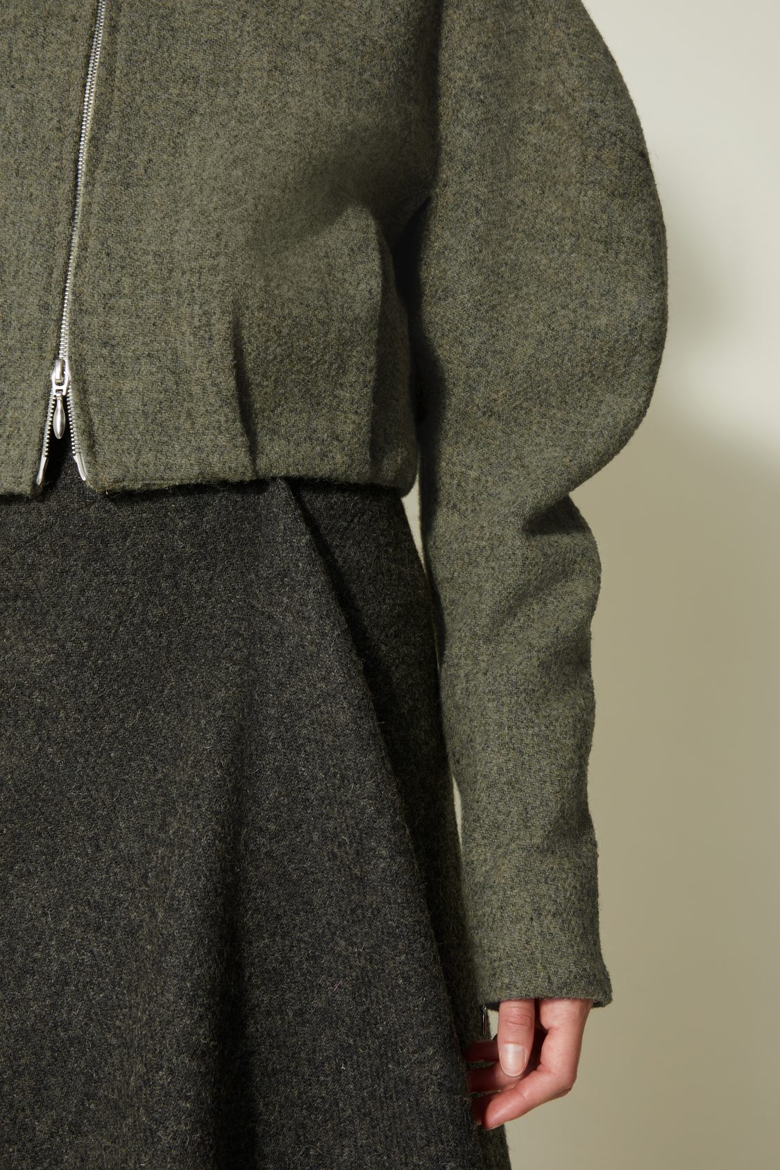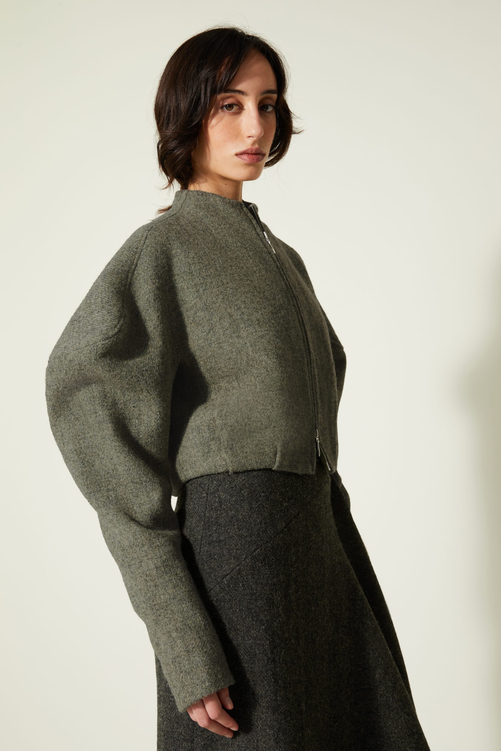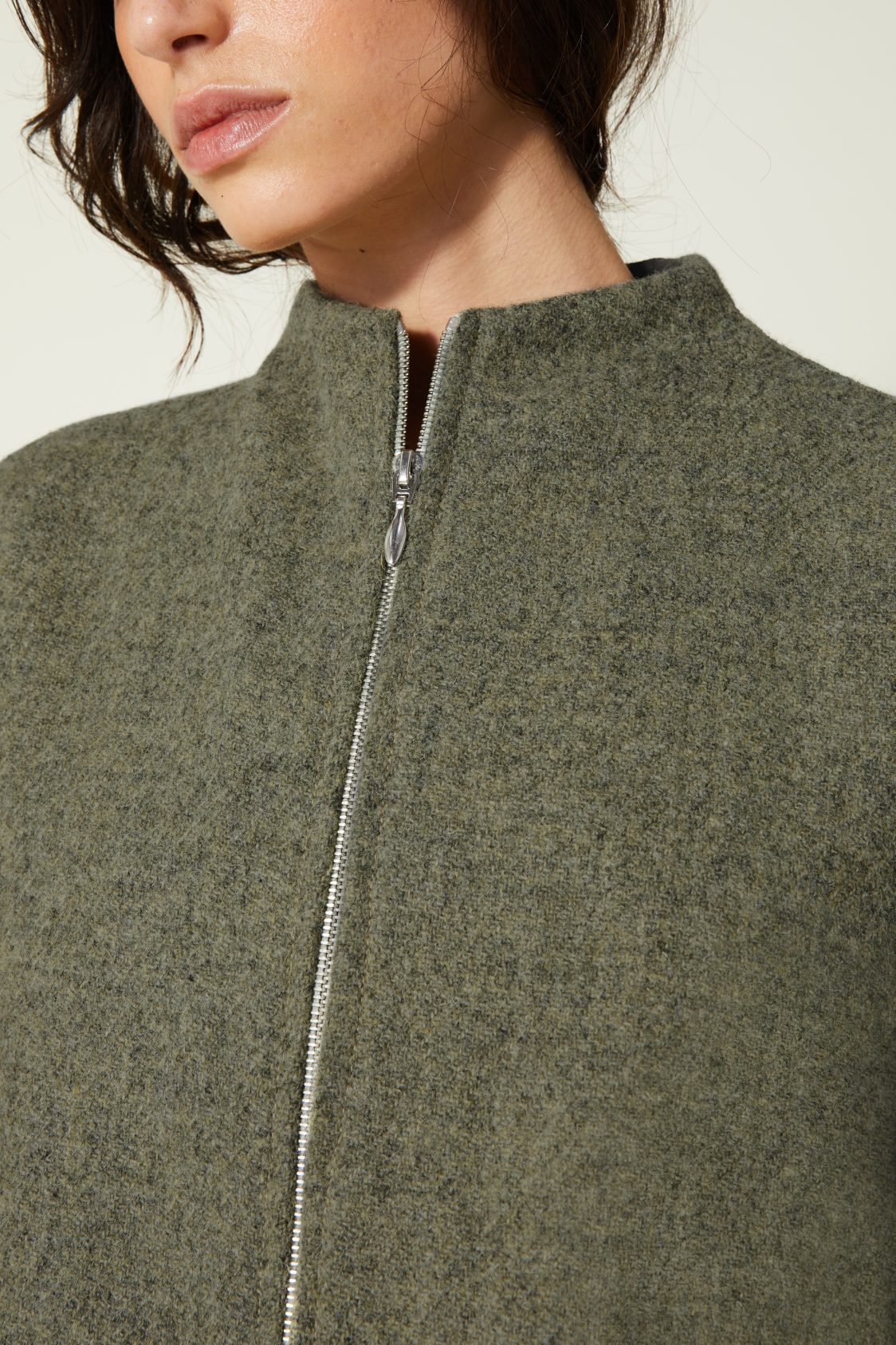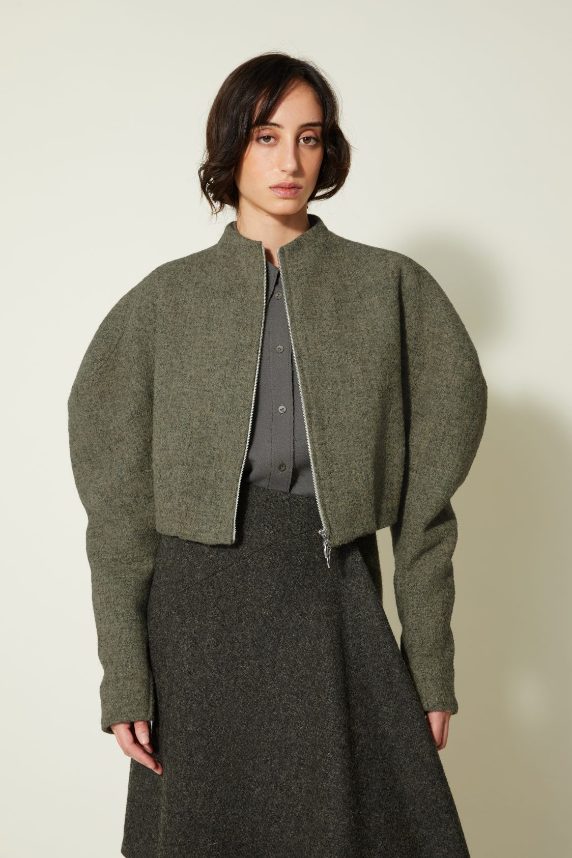 Jacket crafted in genuine Harris Tweed. The sleeves are sculpted — a prominent shape of the season — and taper toward the zipped cuff. Double-slider zipper at the front.