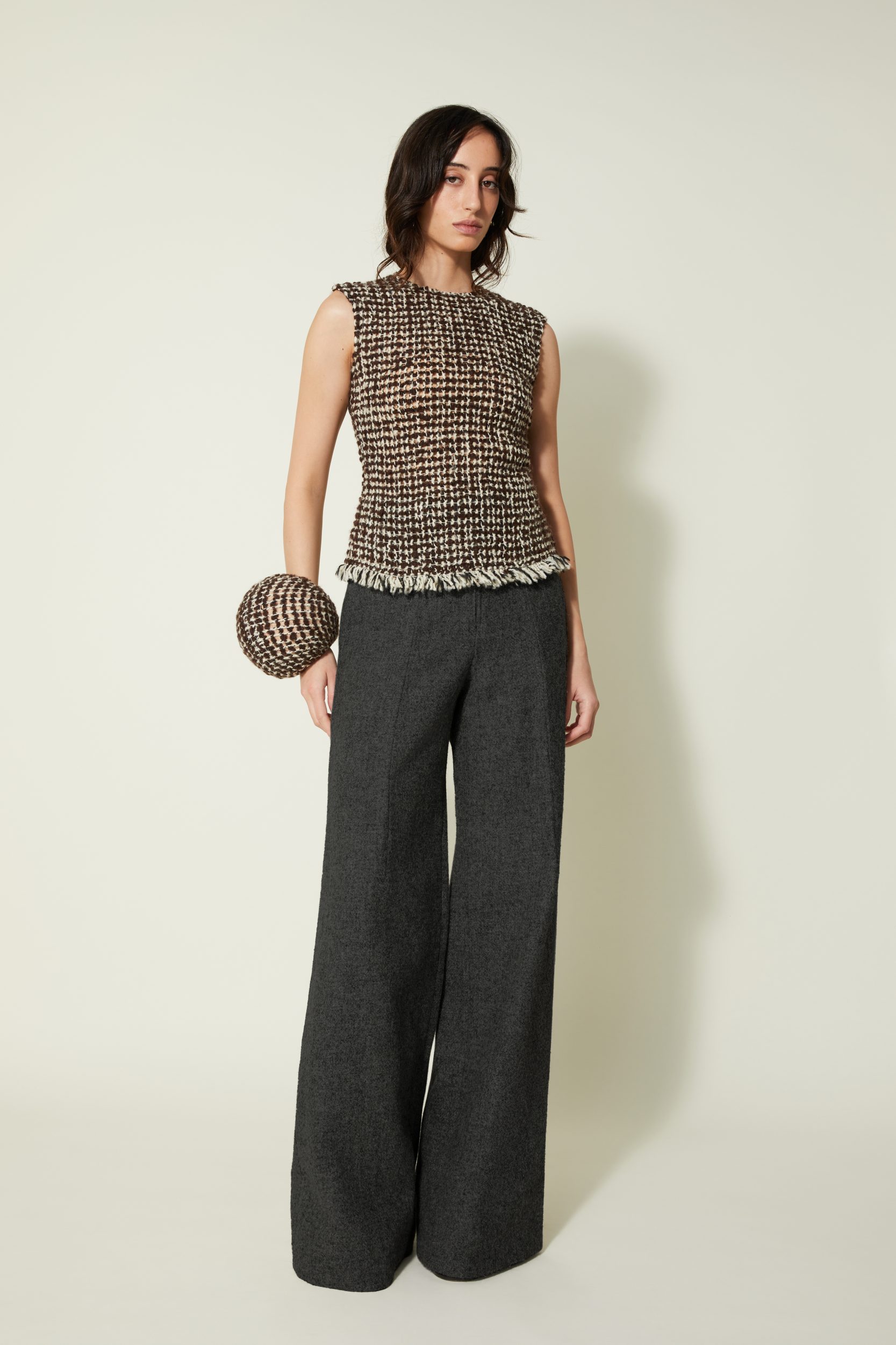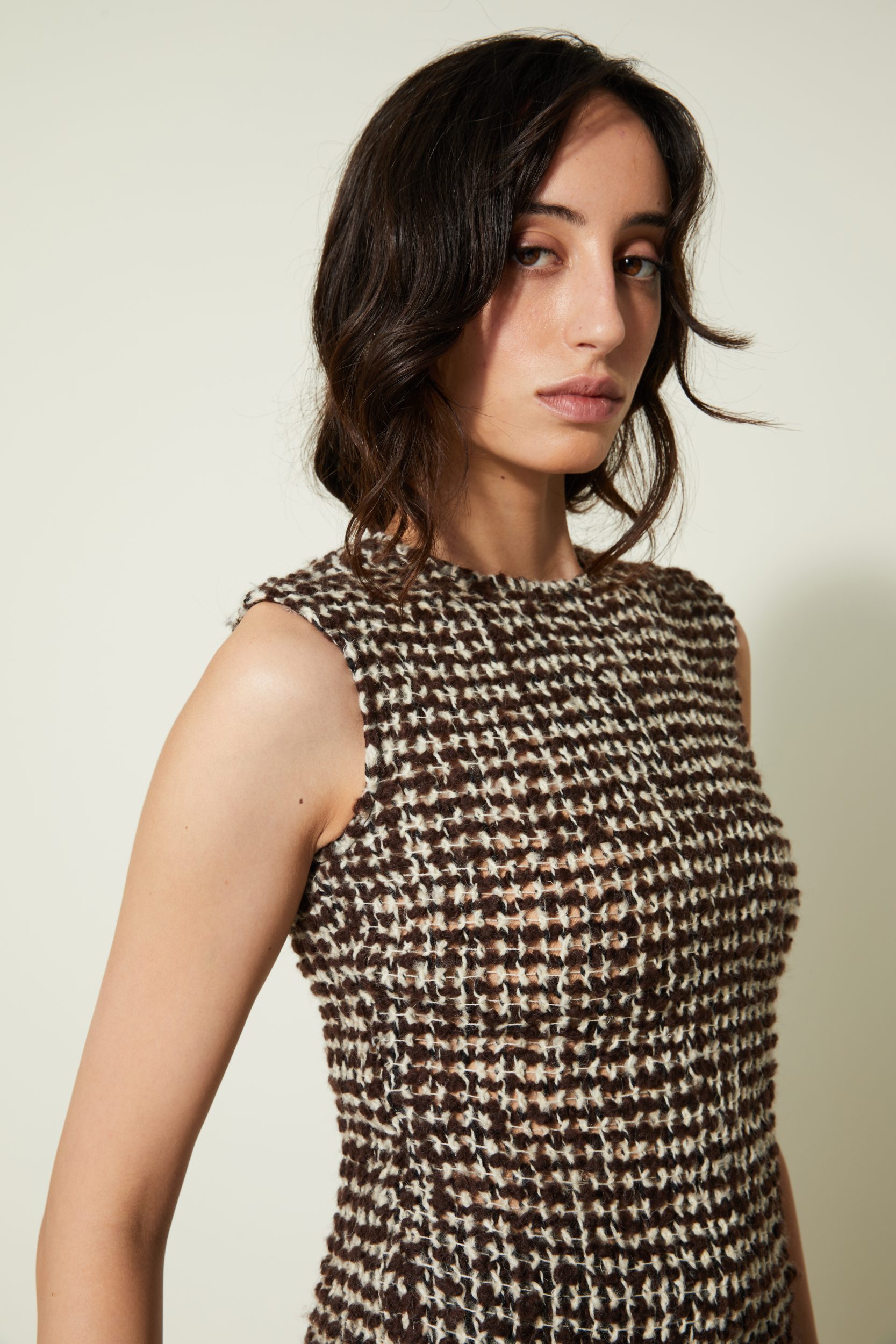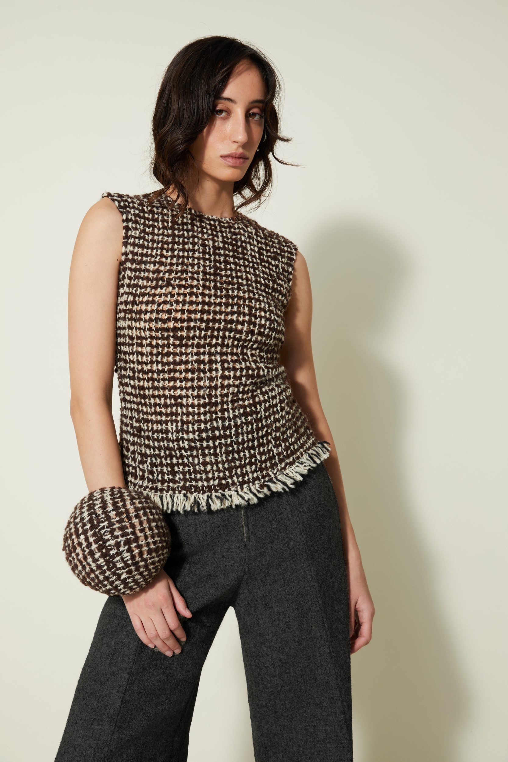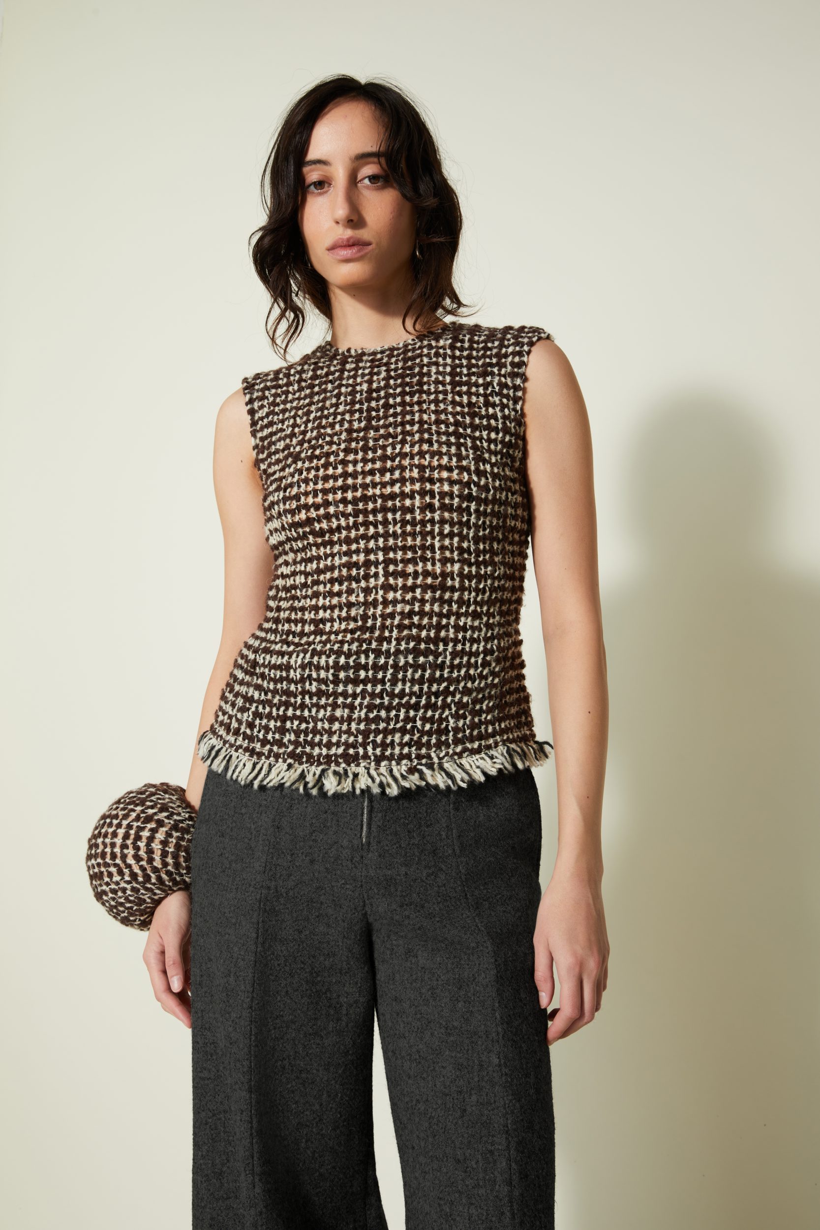 Sleeveless top crafted from a luxurious, artisanally produced fabric — a wool macro-tweed. Raw-edge finishes highlight the fabric’s natural texture.