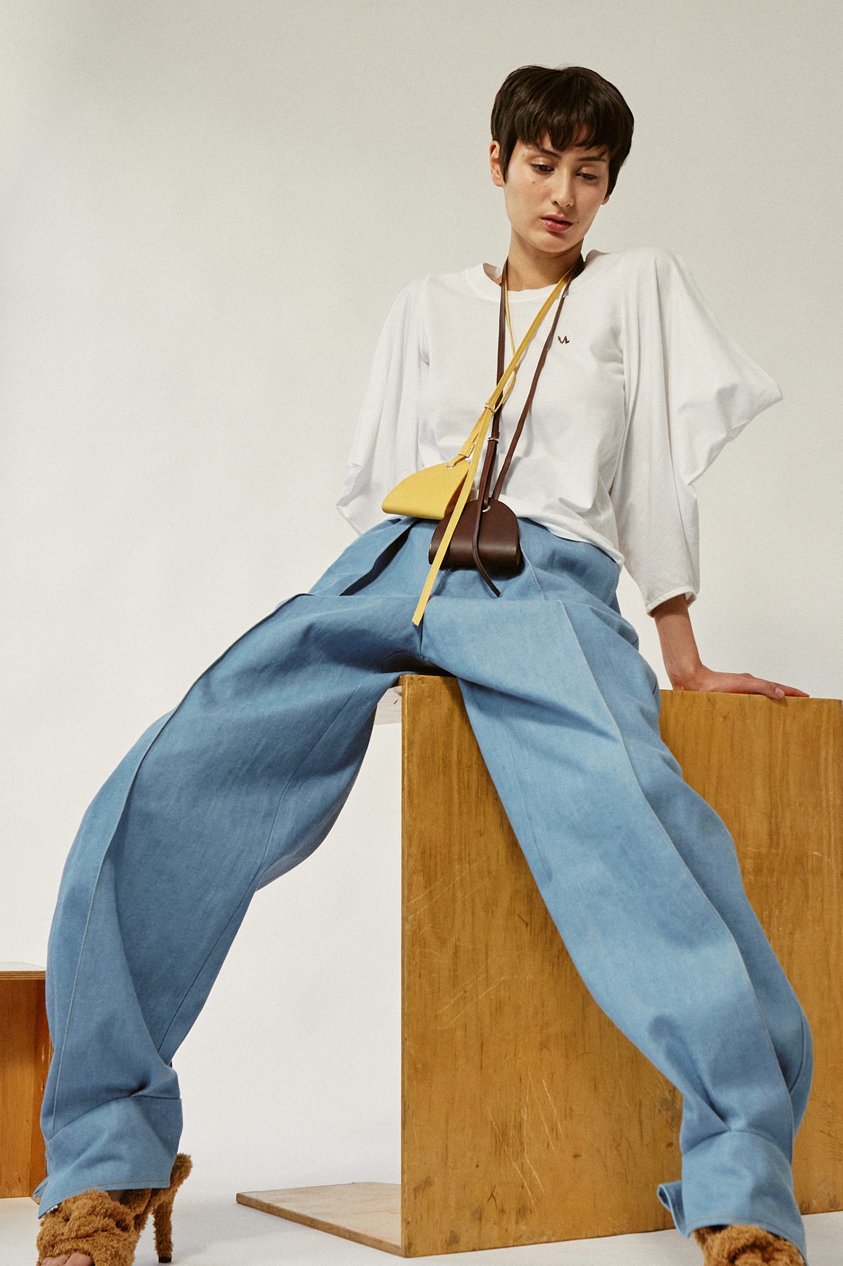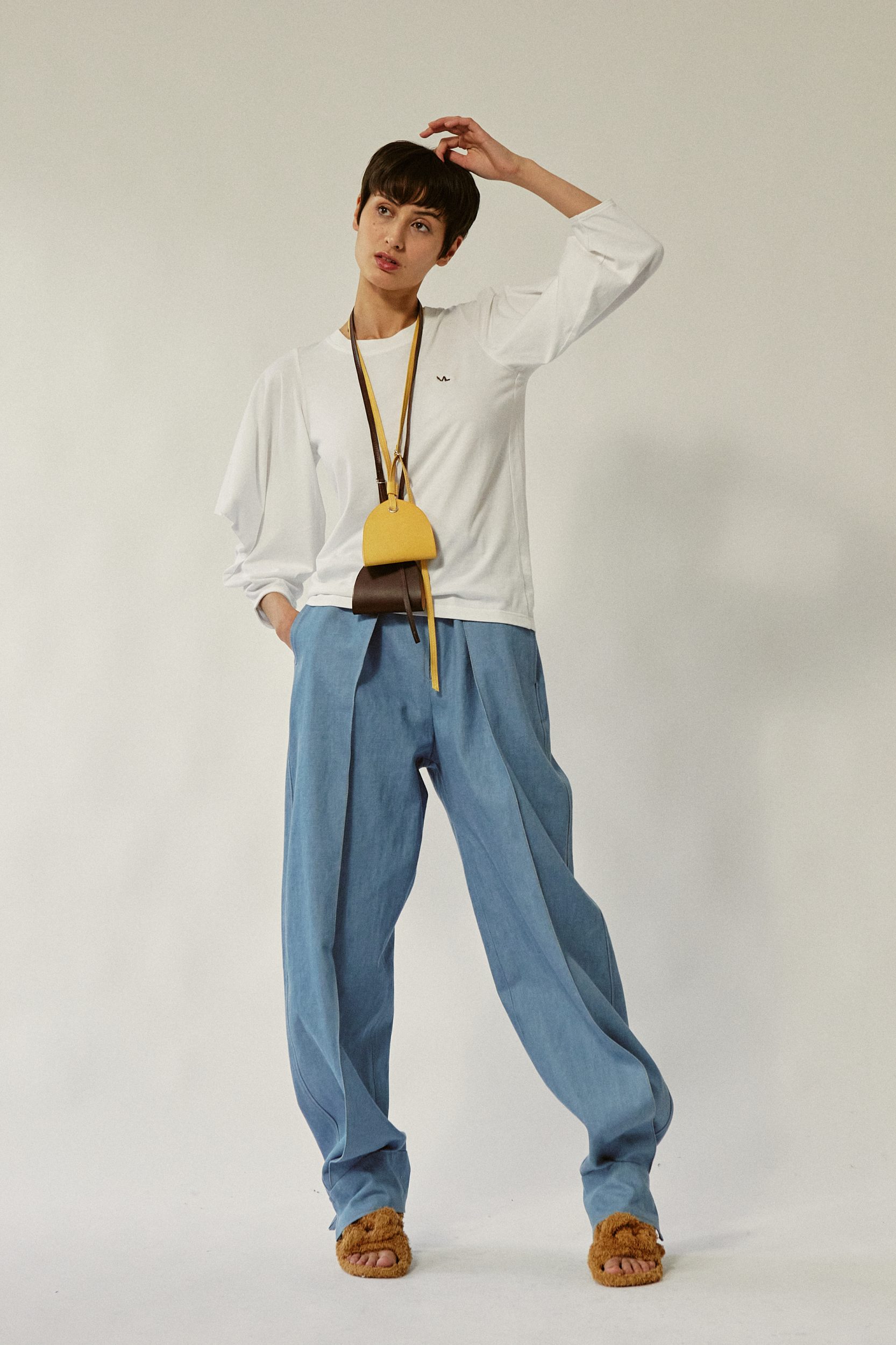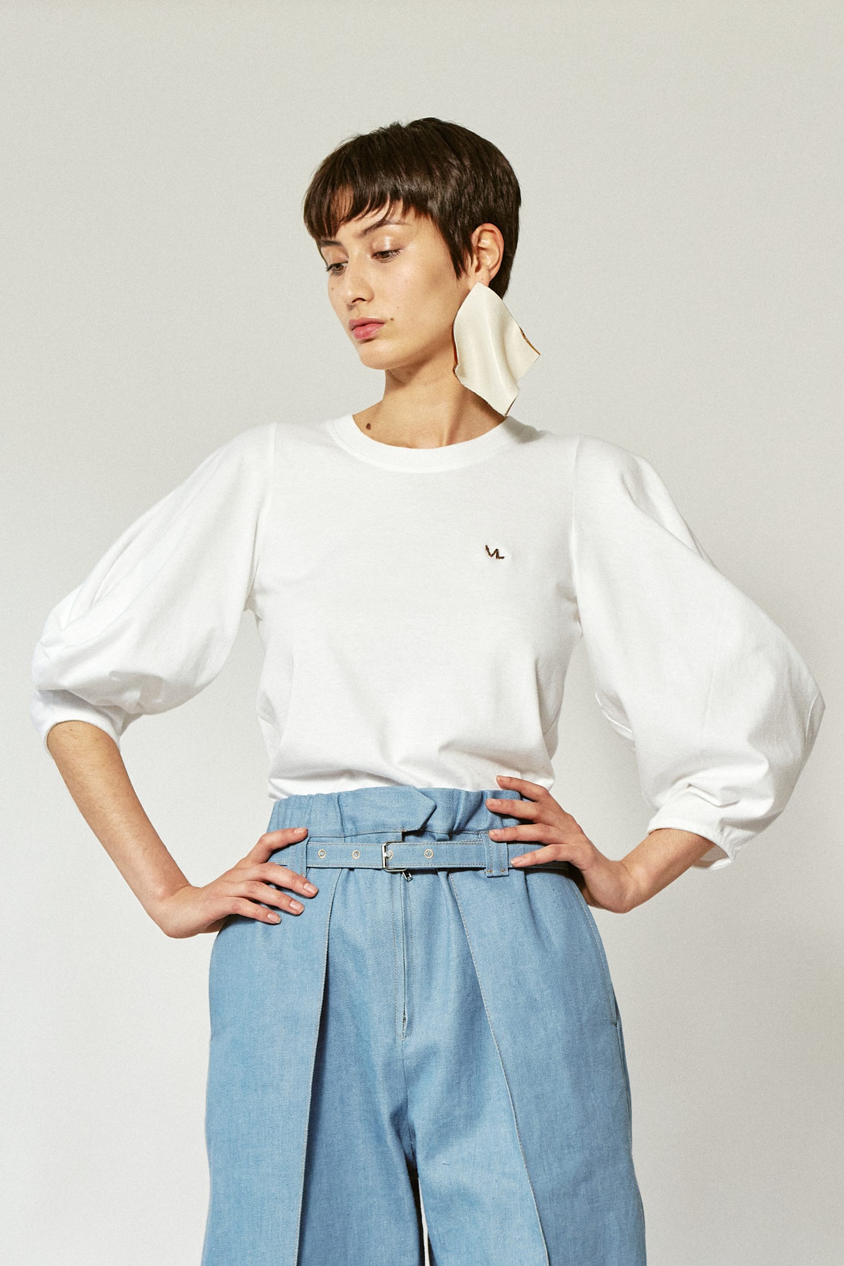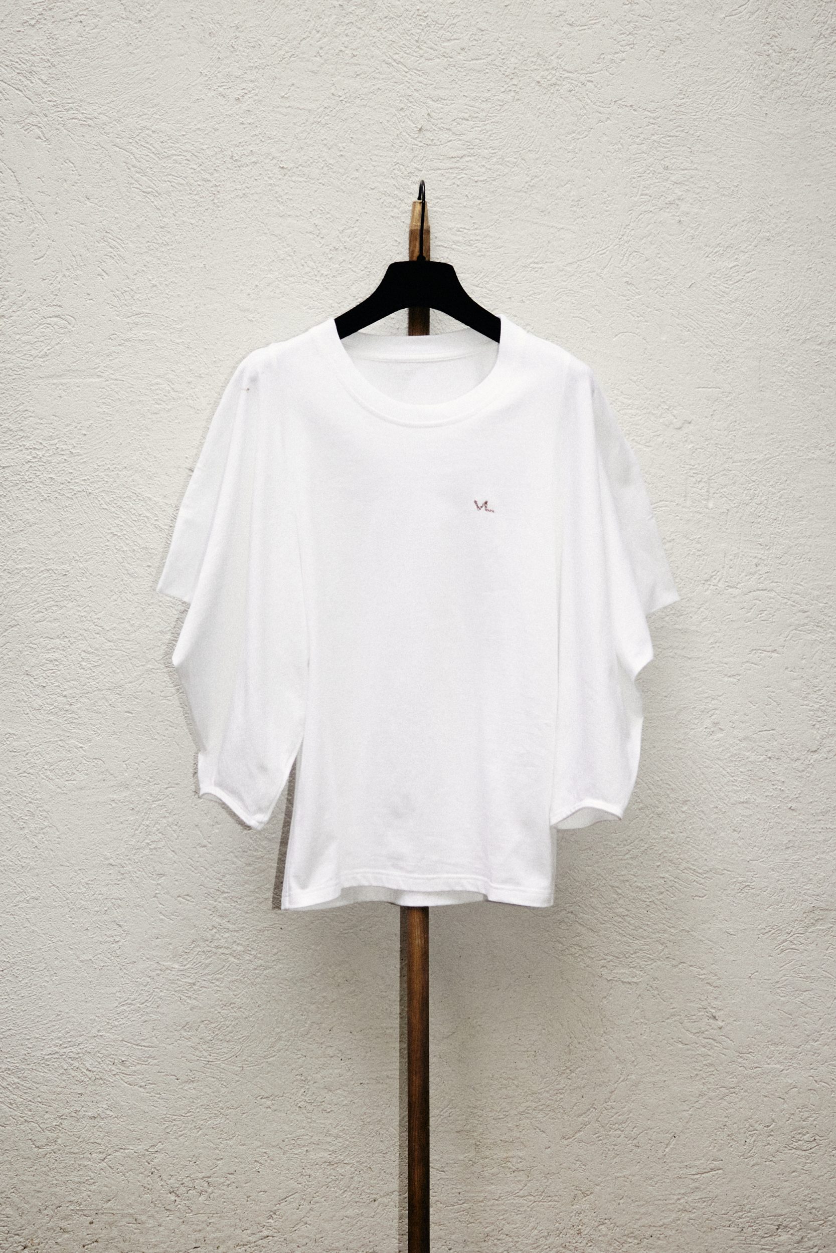 100% cotton Jersey T-Shirt — Rather wide crew neck — Triangle sleeves — Cuff tightened by a hidden piece of fabric for the sleeve to remain in place — Brown chain stitch “VL” embroidery