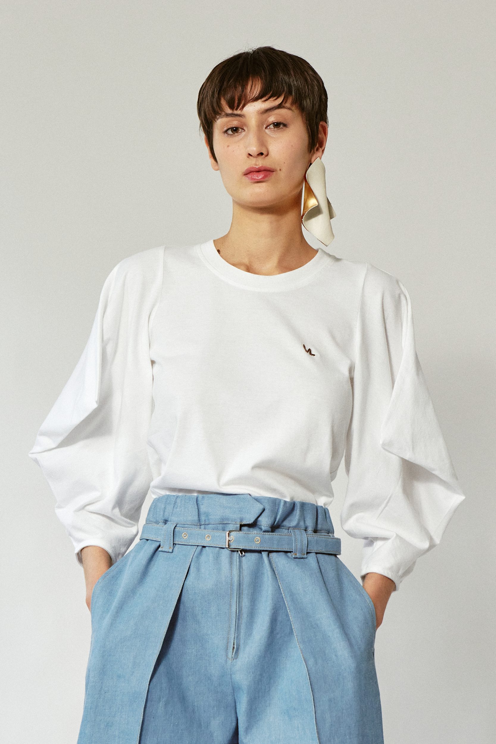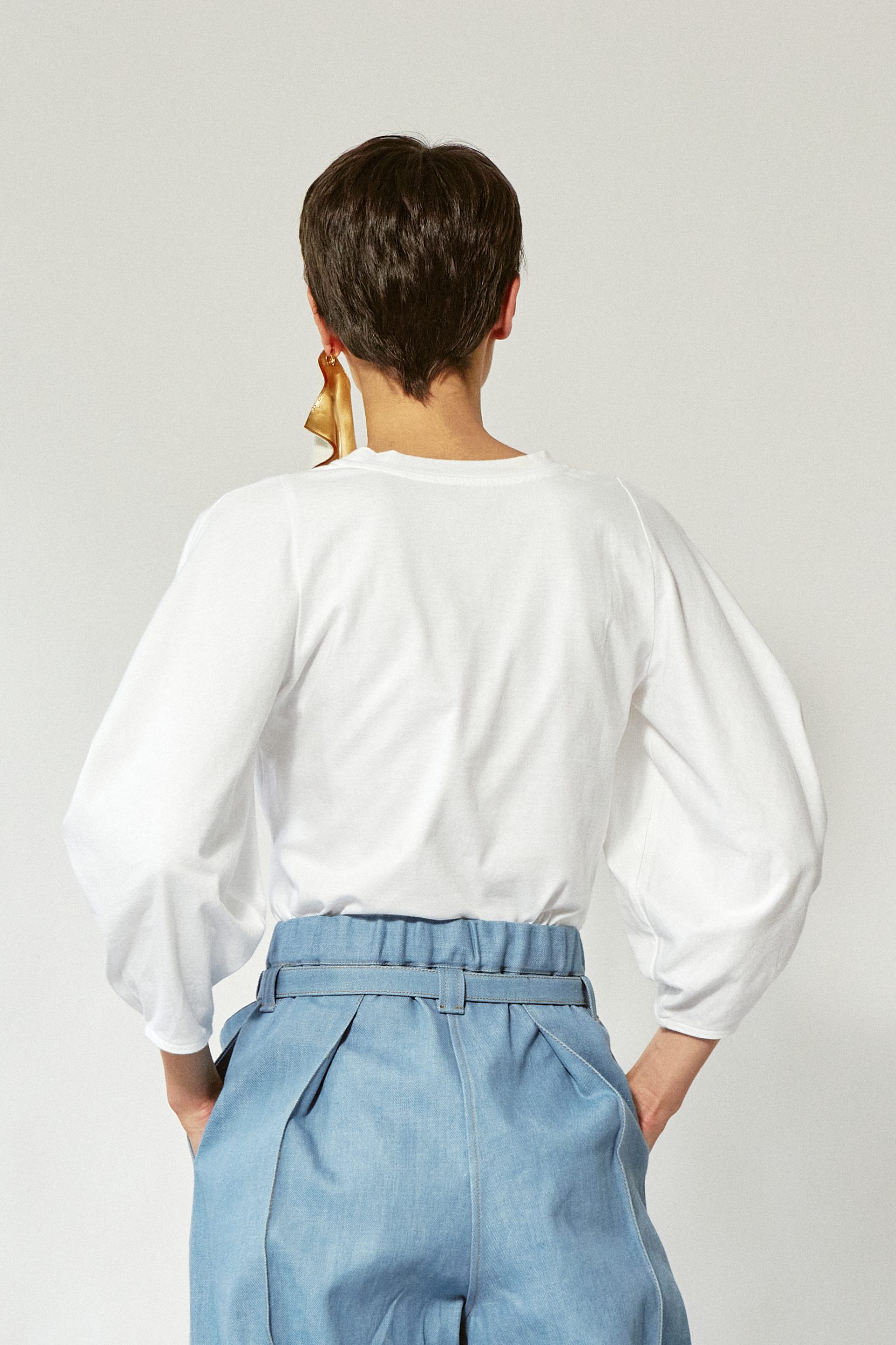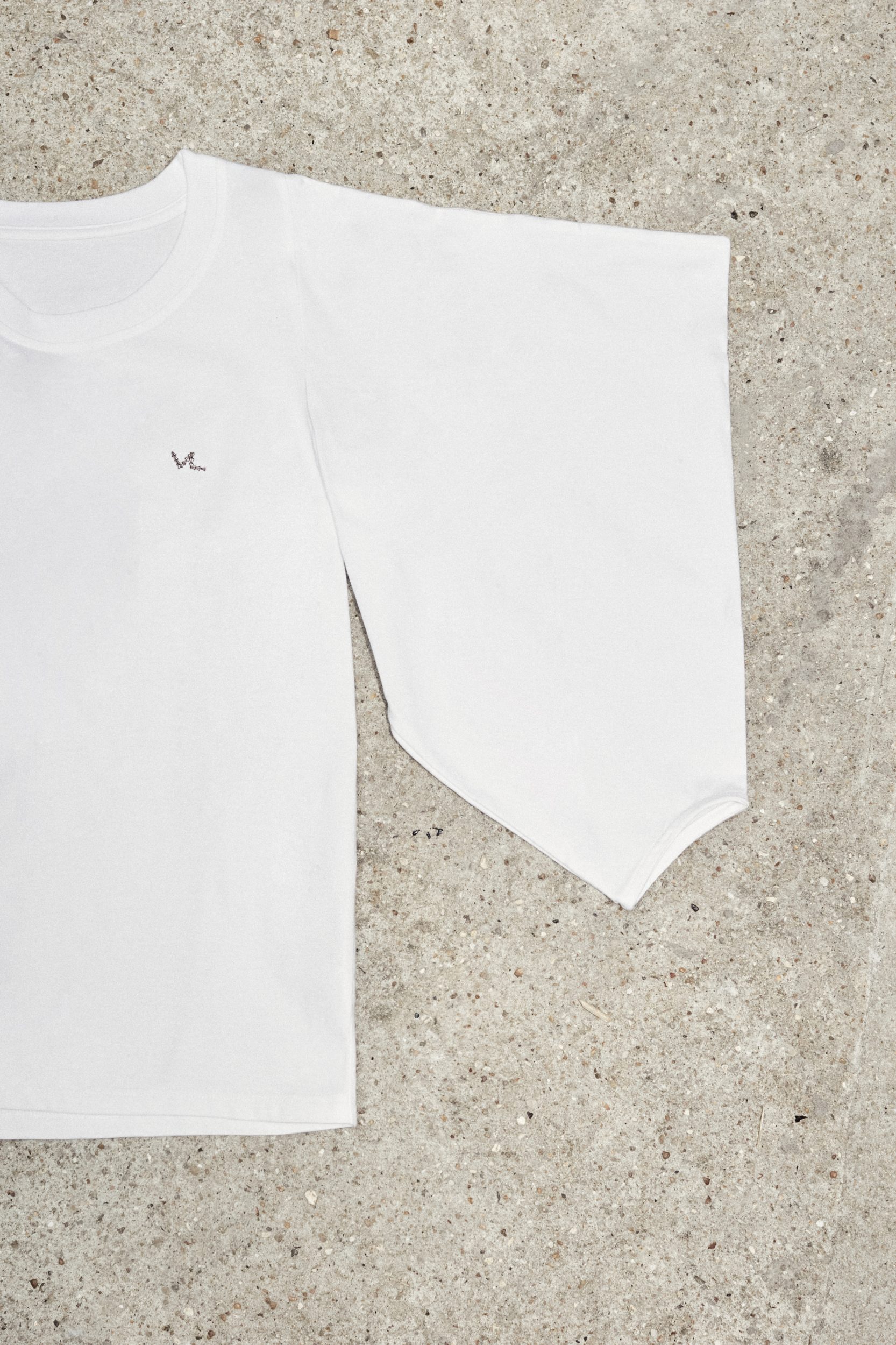 The iconic Veronique Leroy T-Shirt: white and simple, with structural shoulders and sleeves which can be worn two ways: with triangular clean shoulders, or with the shoulders folded inwards to create a sleeve with curved shapes.