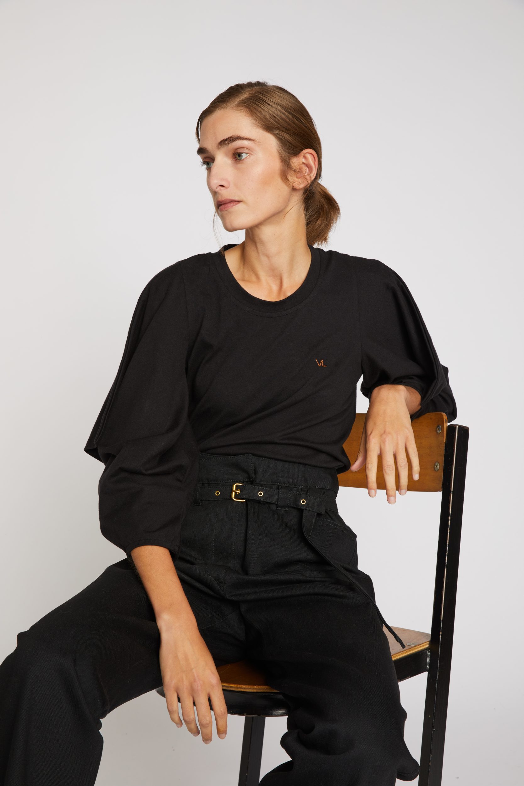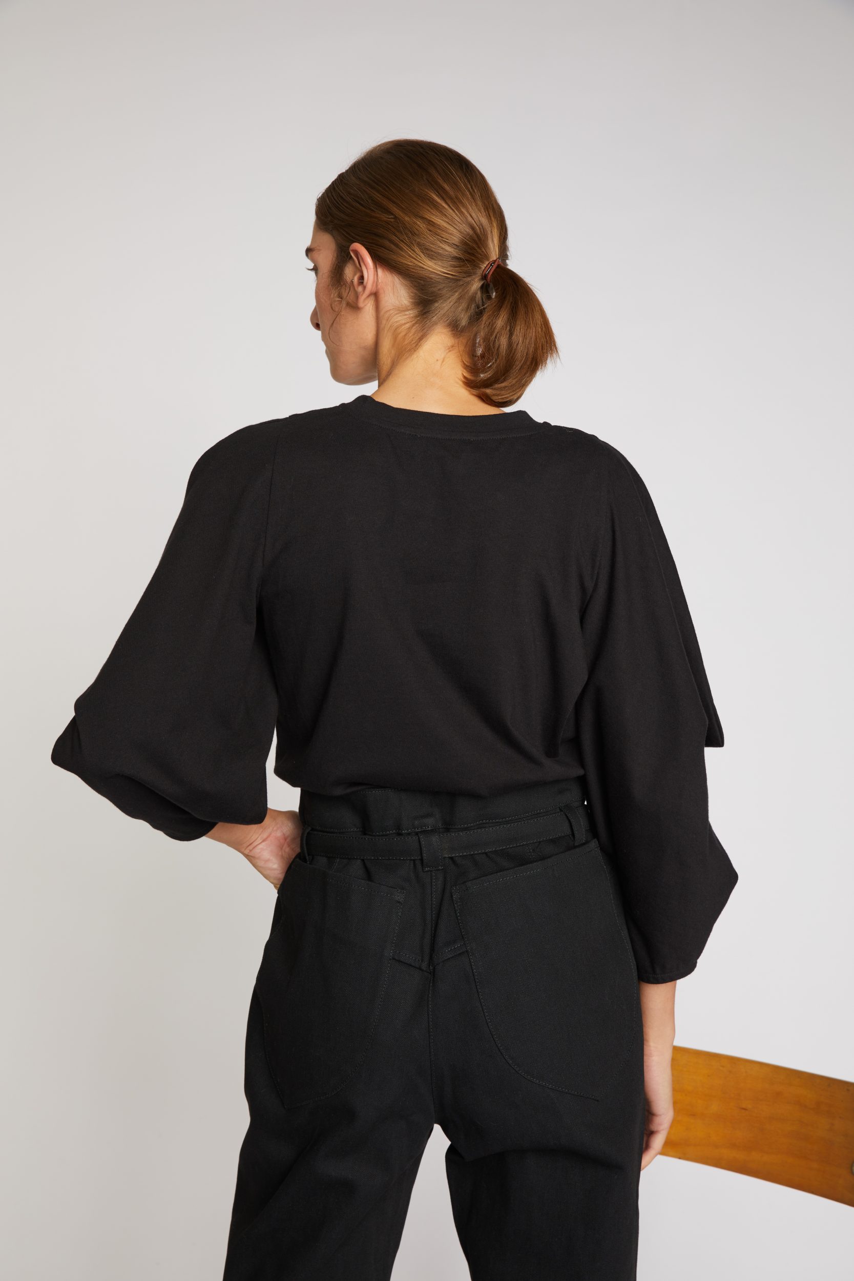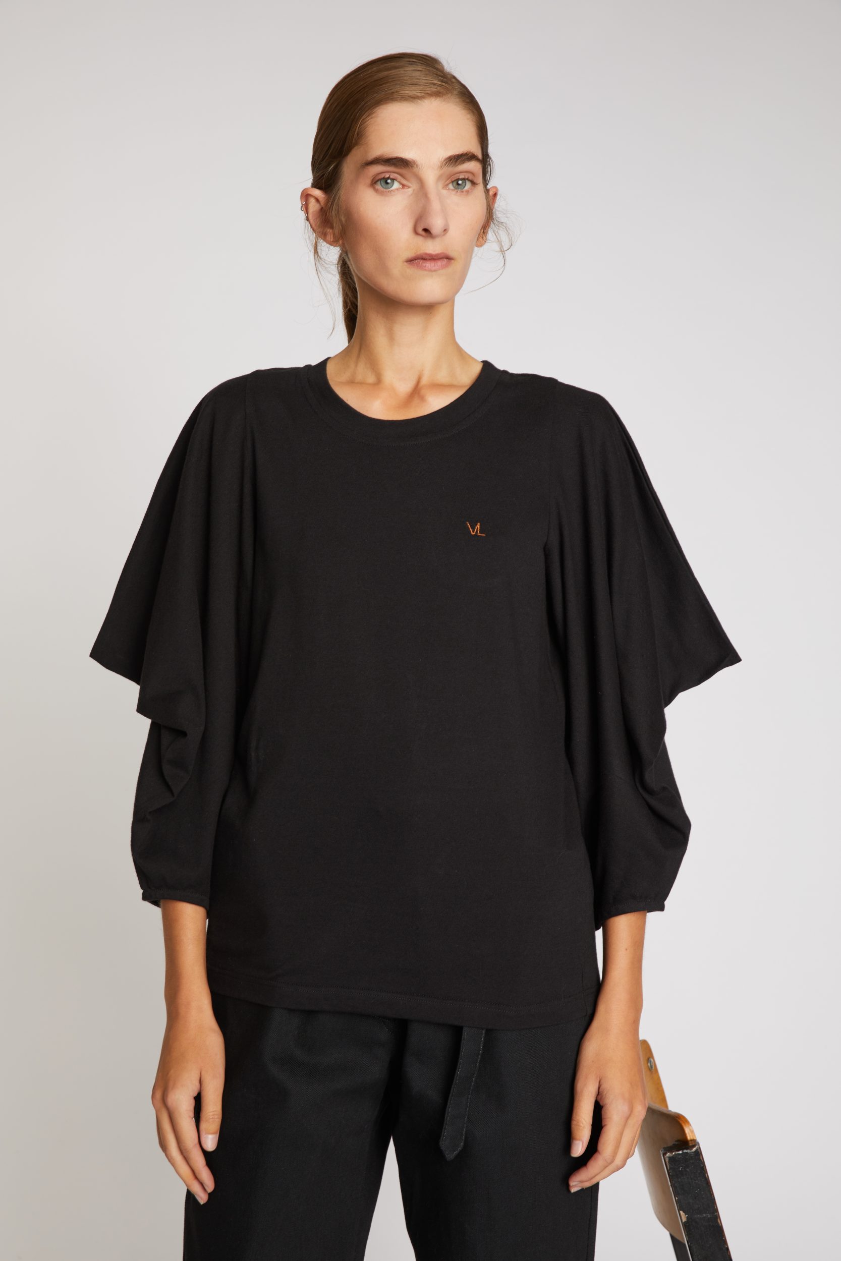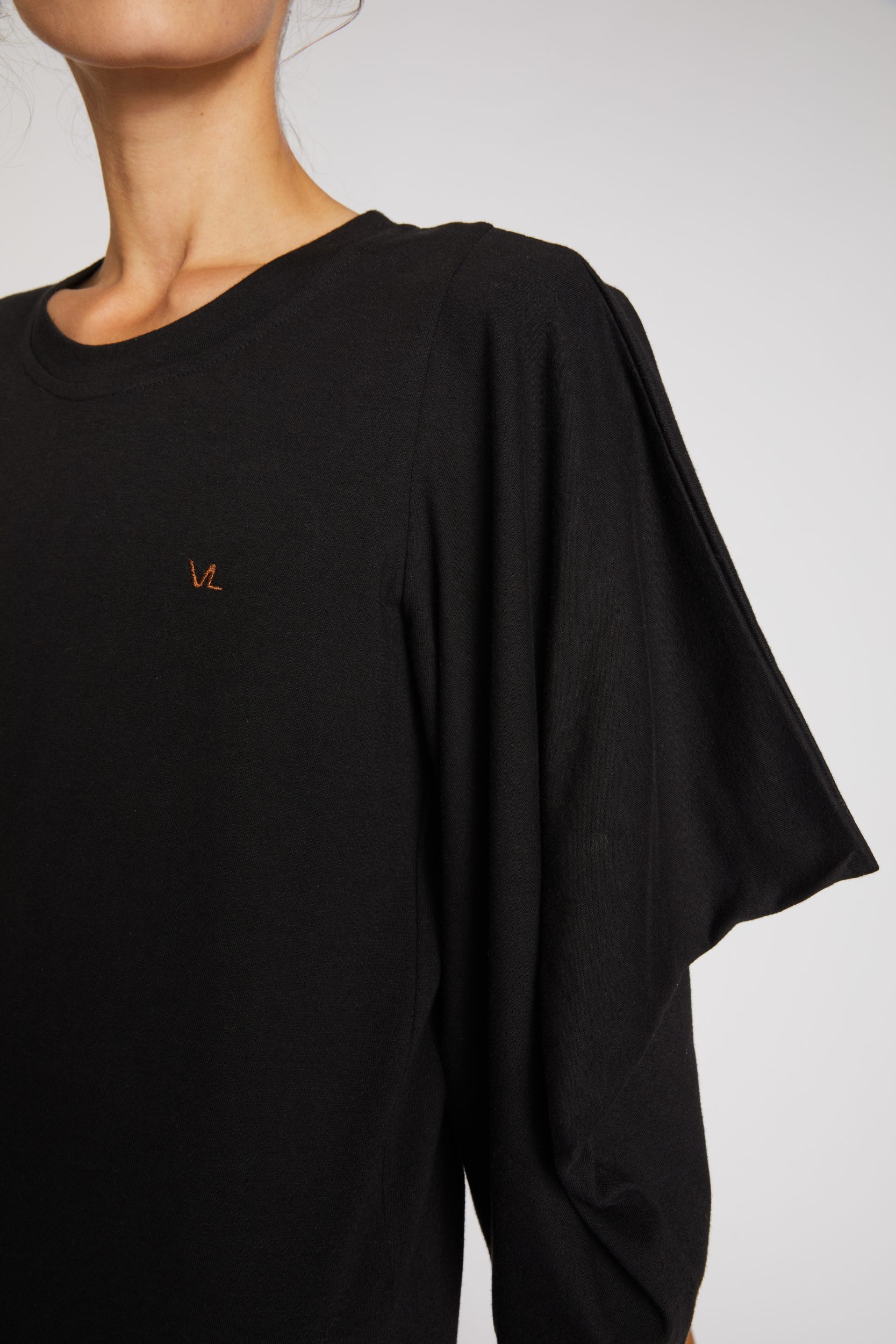 The iconic Veronique Leroy T-Shirt: black and simple, with structural shoulders and sleeves which can be worn two ways: with triangular clean shoulders, or with the shoulders folded inwards to create a sleeve with curved shapes.