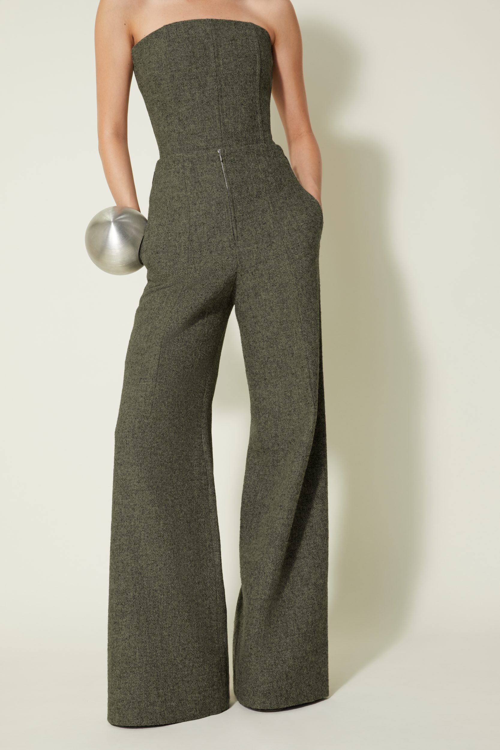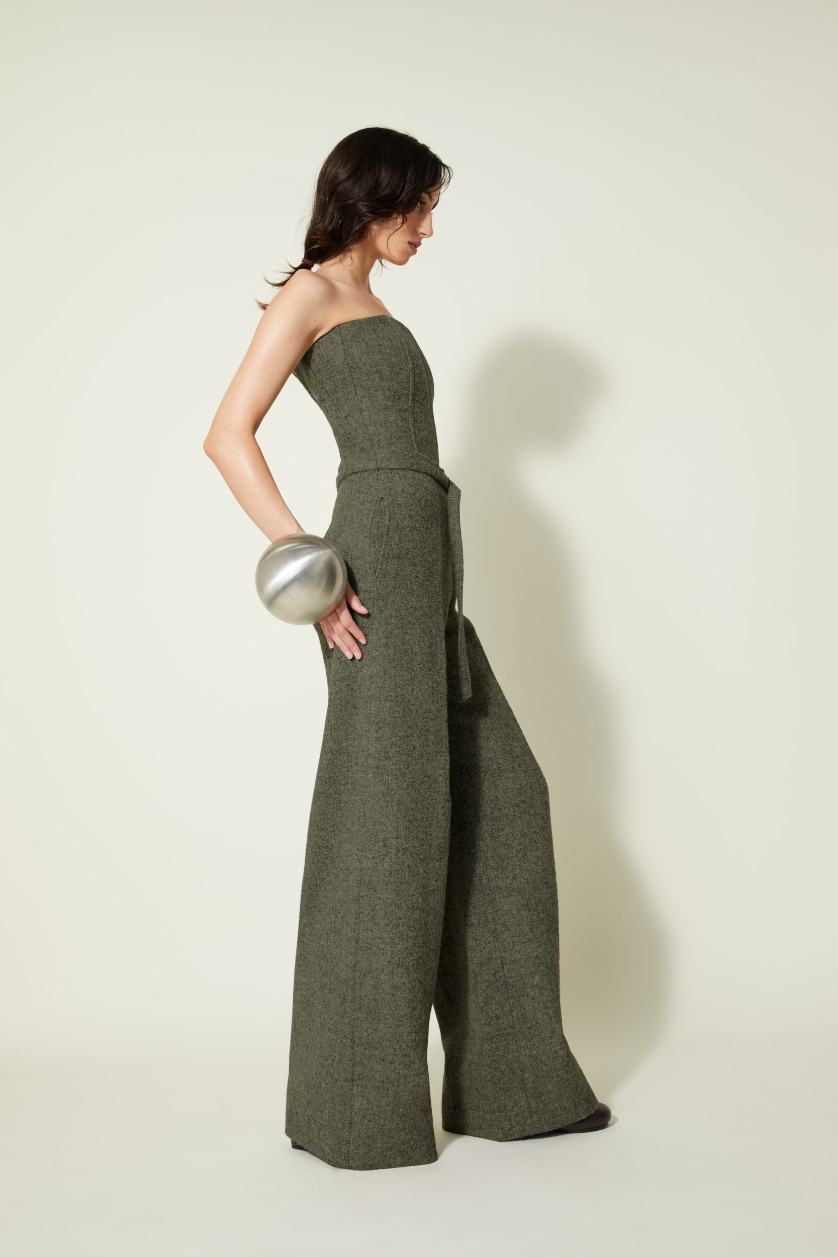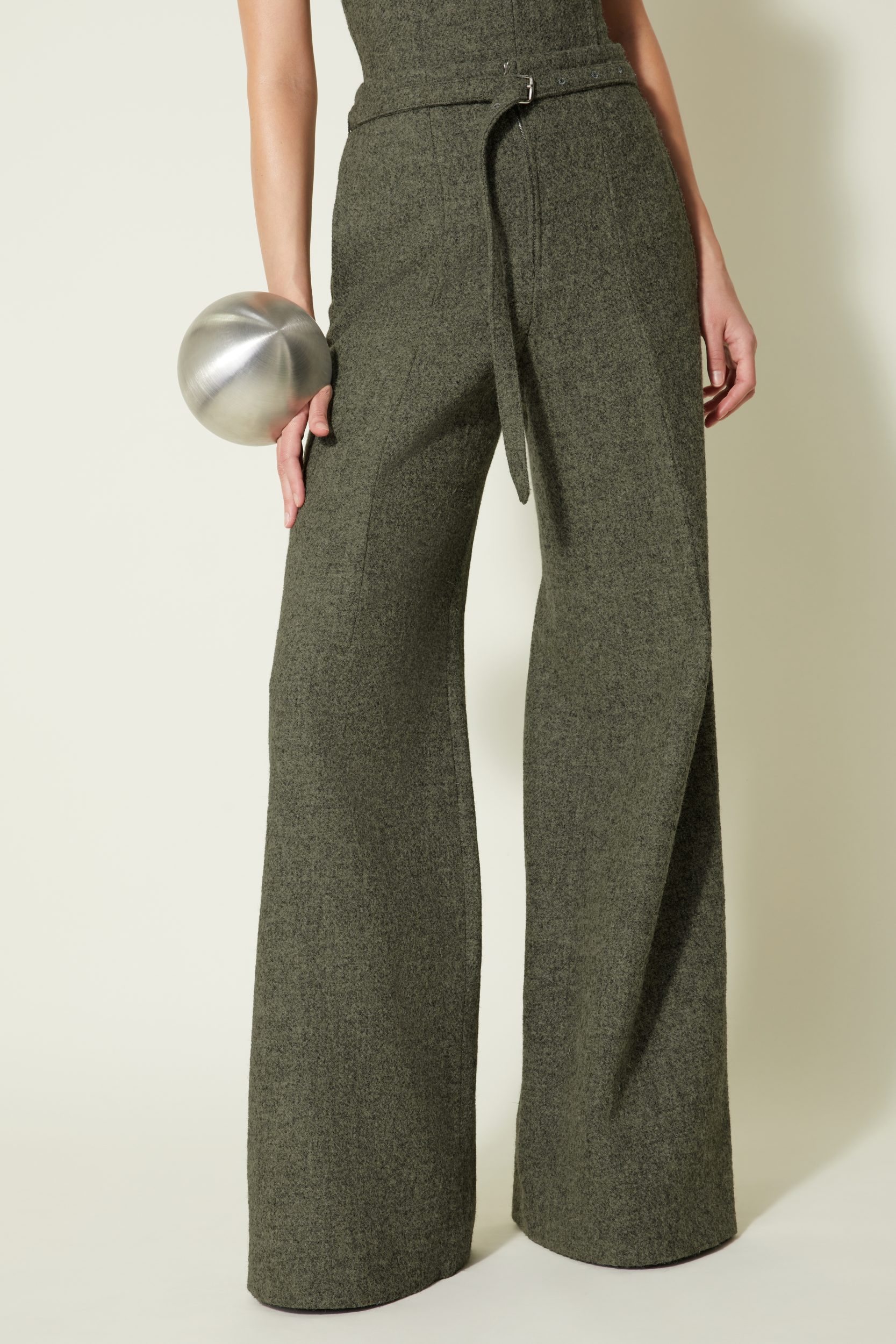 This high-waisted trouser embodies a structured yet effortless elegance. Crafted from genuine Harris Tweed pure virgin wool, it elongates the silhouette with its wide-leg cut. A matching belt accentuates the waist, while discreet in-seam pockets add functionality without disrupting the purity of the line.