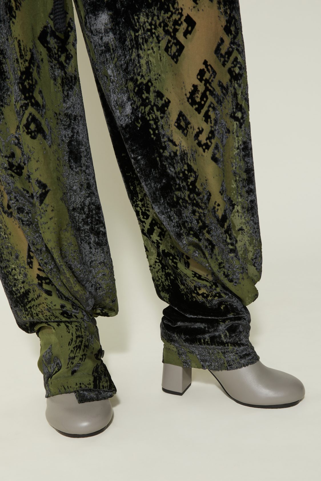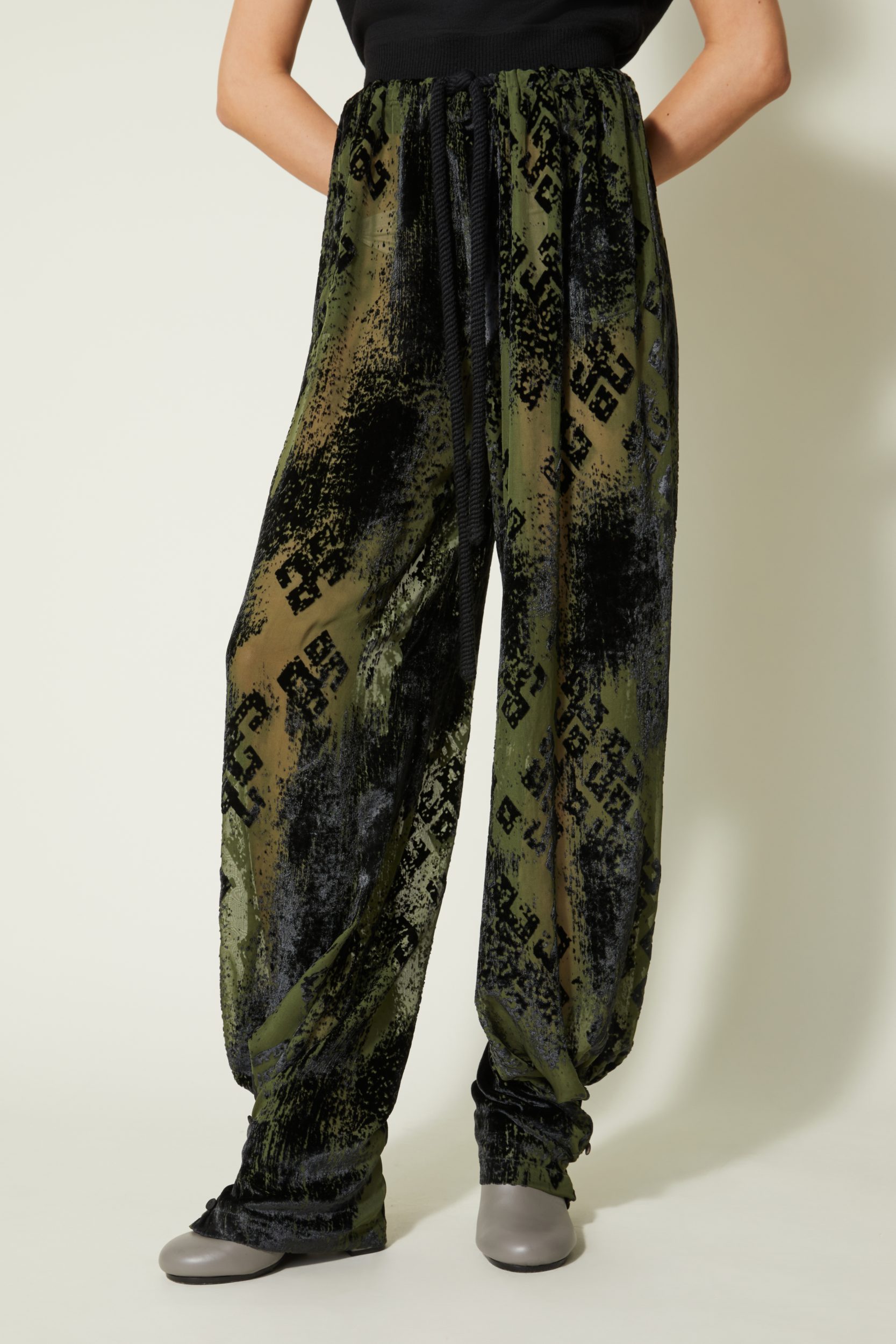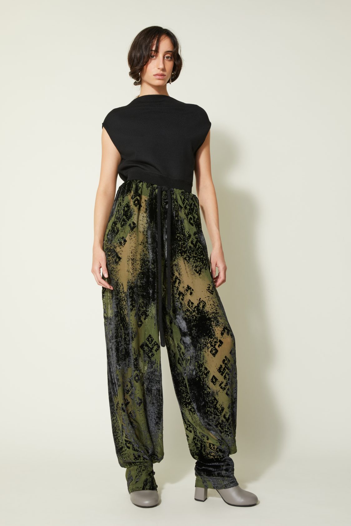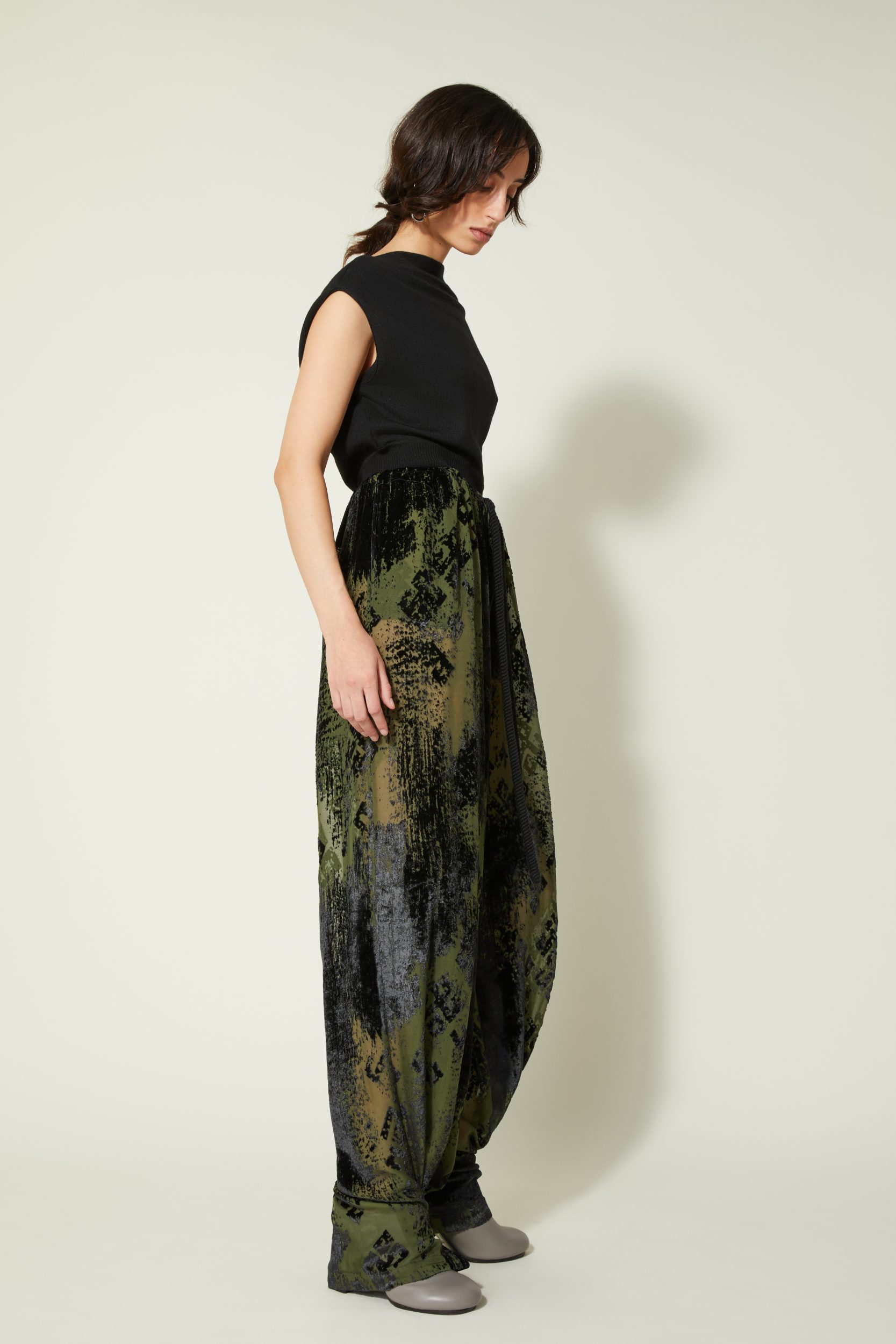 Wide, majestic legs, structured with adjustable gathers at the waist. The “boudin” belt is also gathered — a quintessentially “Véronique Leroy” pair of trousers. Shown here in a silk-viscose devoré velvet designed for the Fall/Winter 2025 runway.