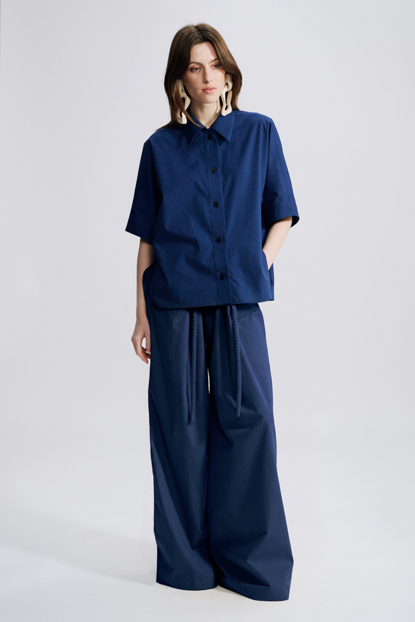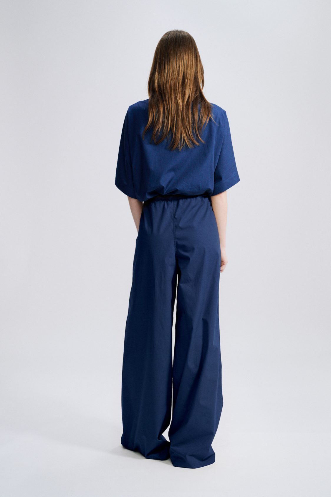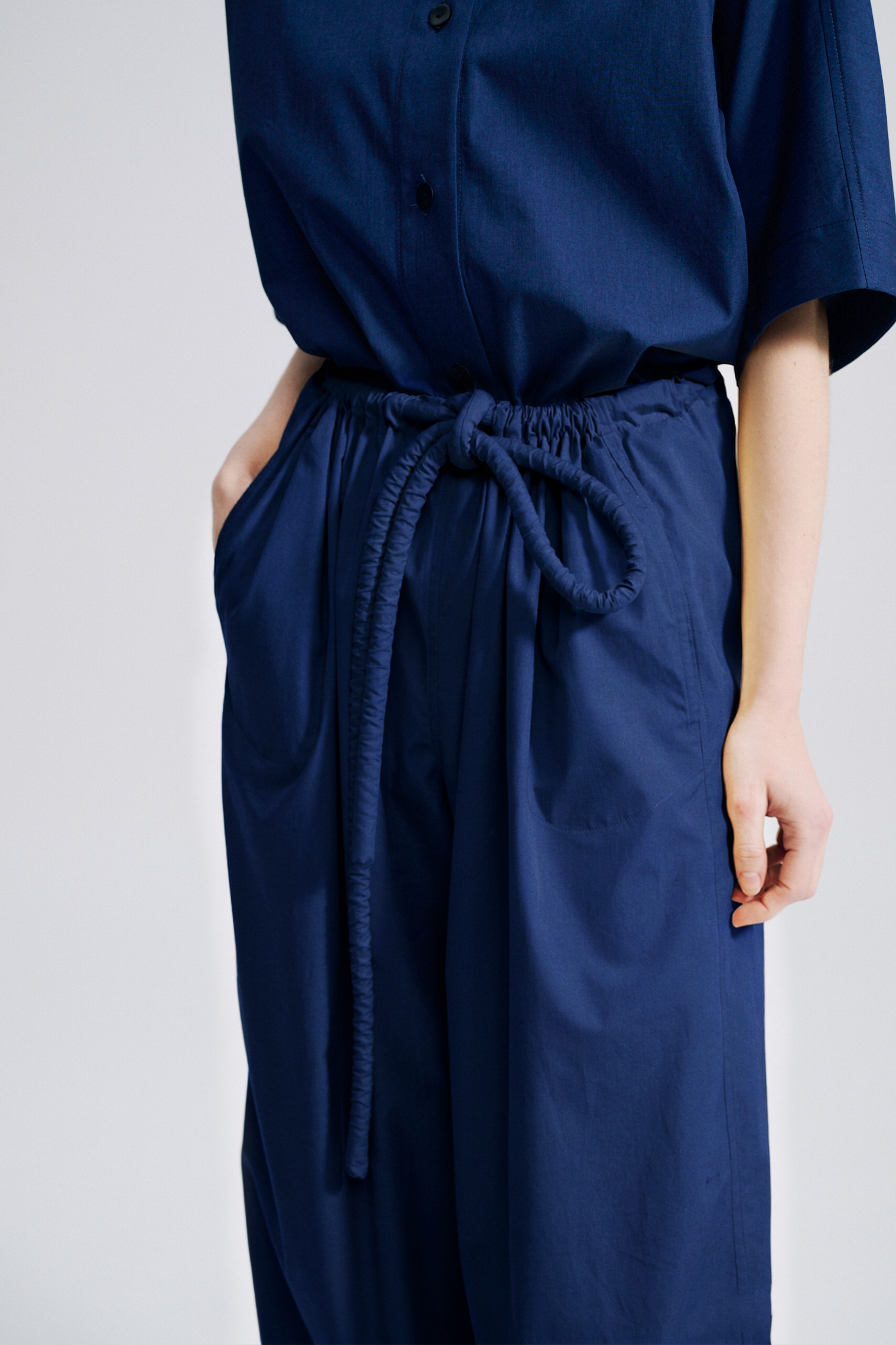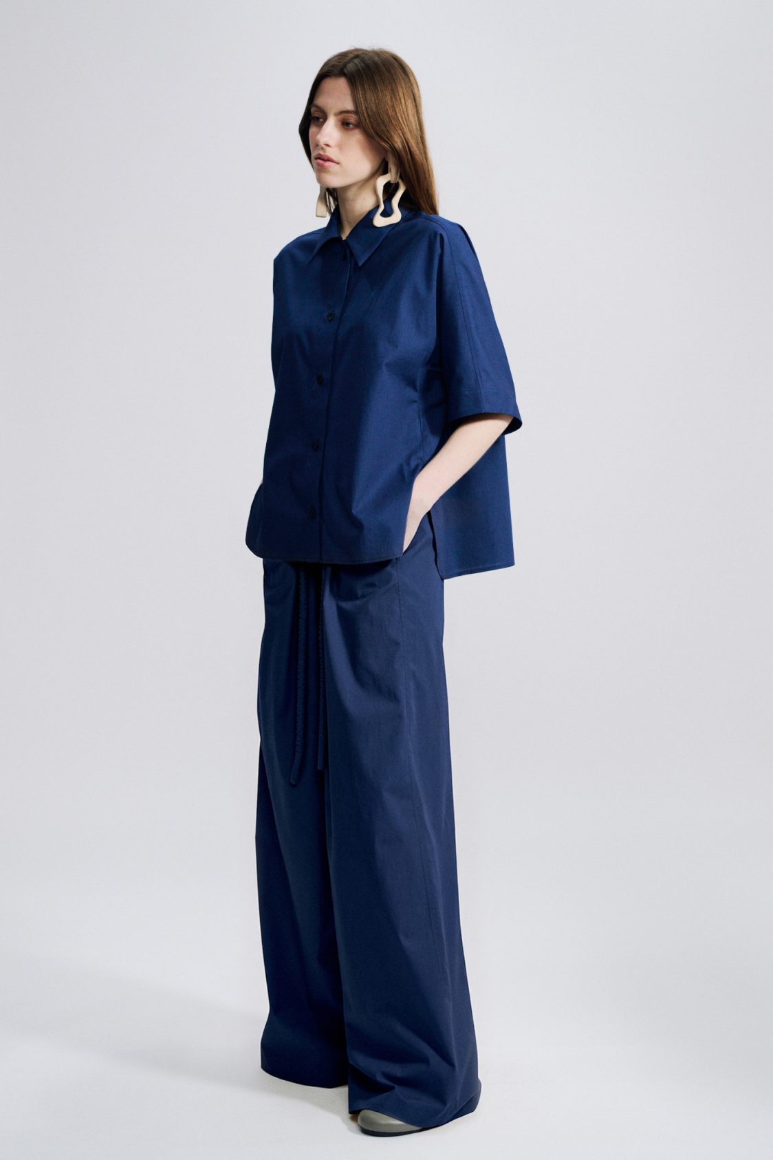 Very wide statement legs, with adjustable gather on the front and on the back to give them structure, on a fitted waist with a crinkled tubular cord: very “Véronique Leroy”.