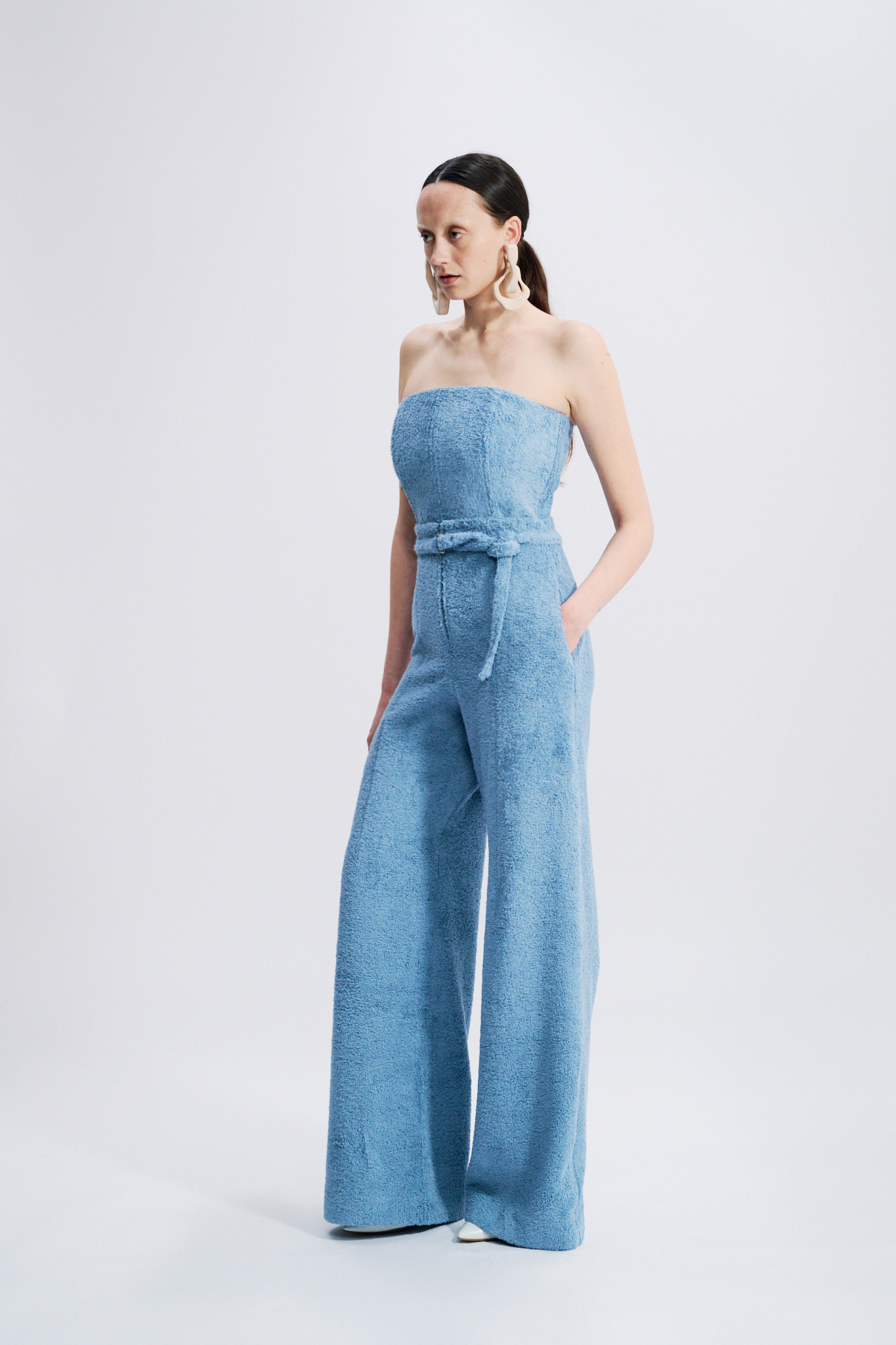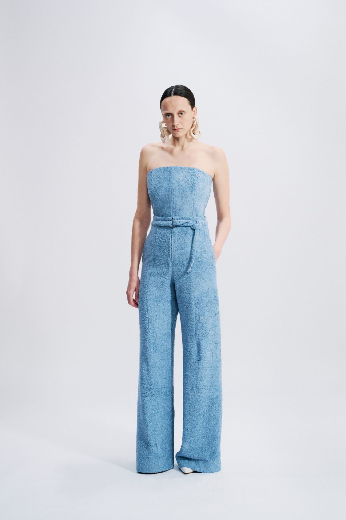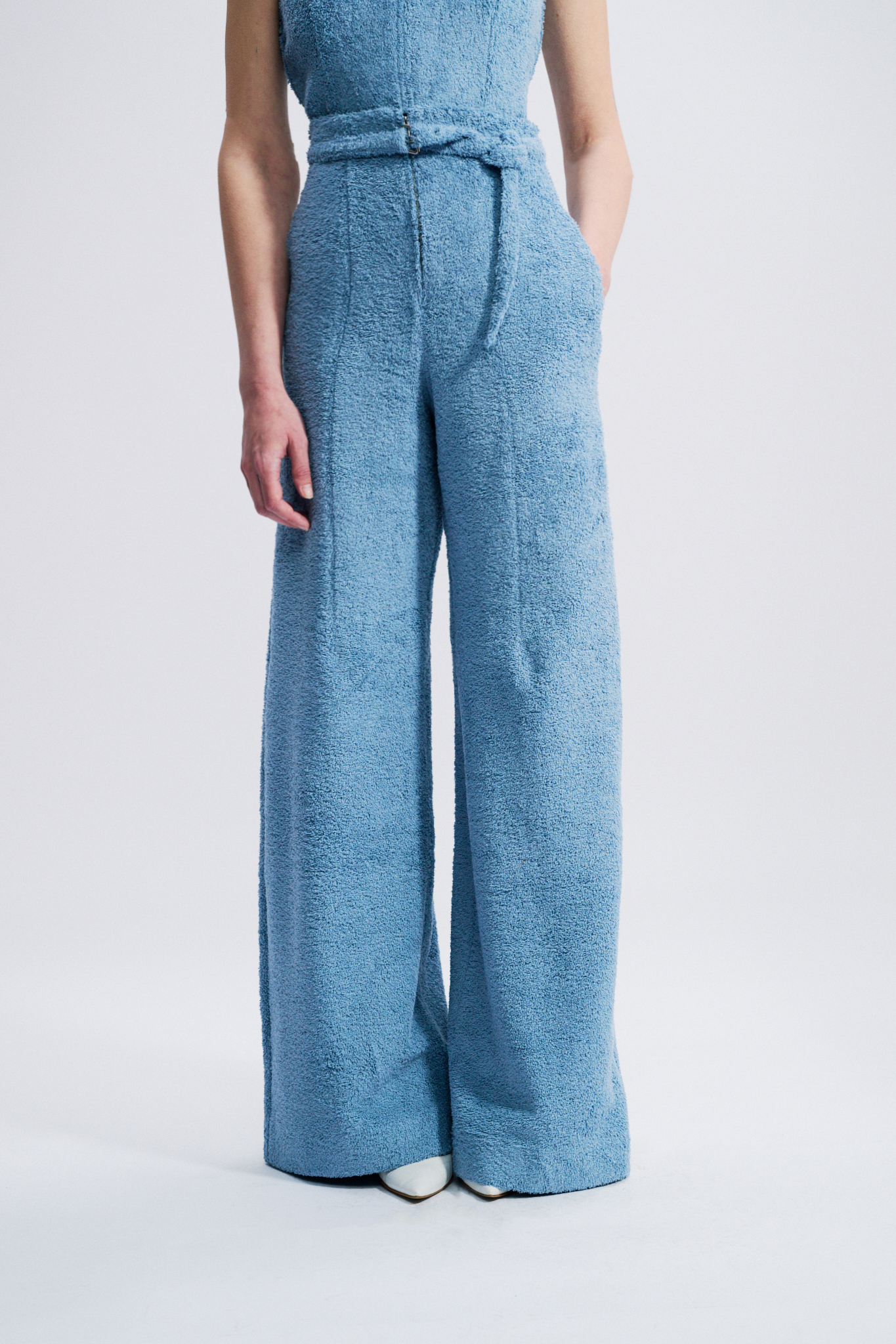 This high-waisted trouser embodies a structured yet effortless elegance. Crafted from cotton terry, it elongates the silhouette with its wide-leg cut. A matching belt accentuates the waist, while discreet in-seam pockets add functionality without disrupting the purity of the line.