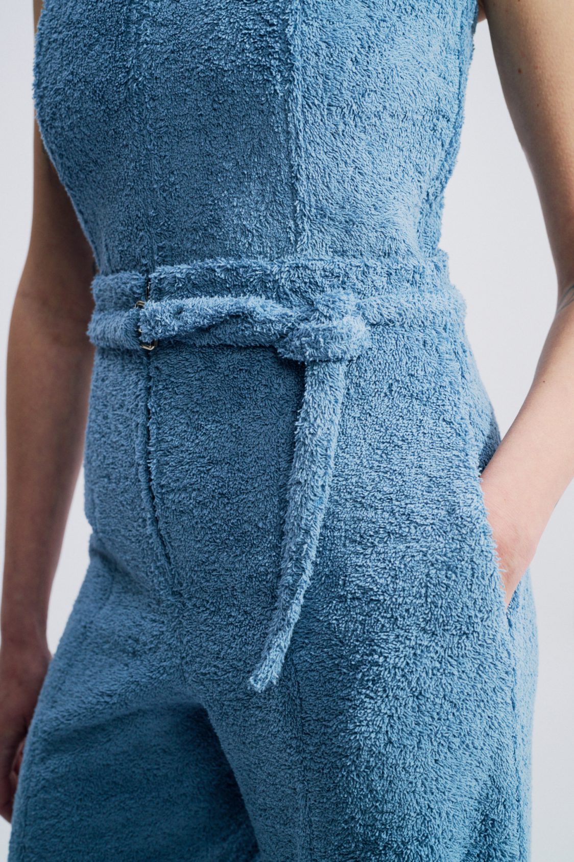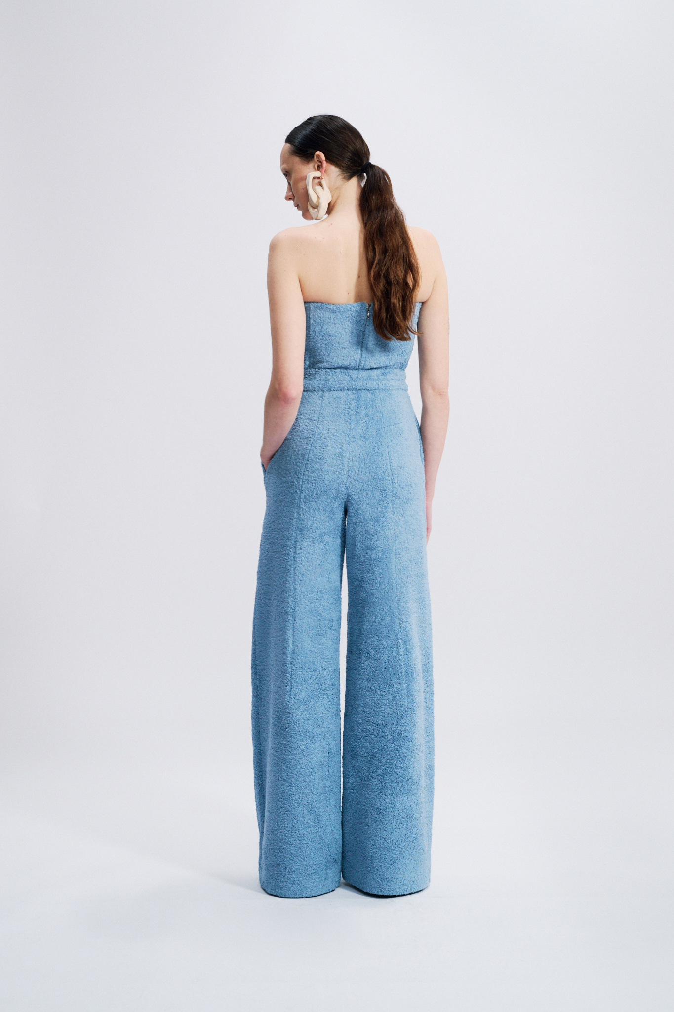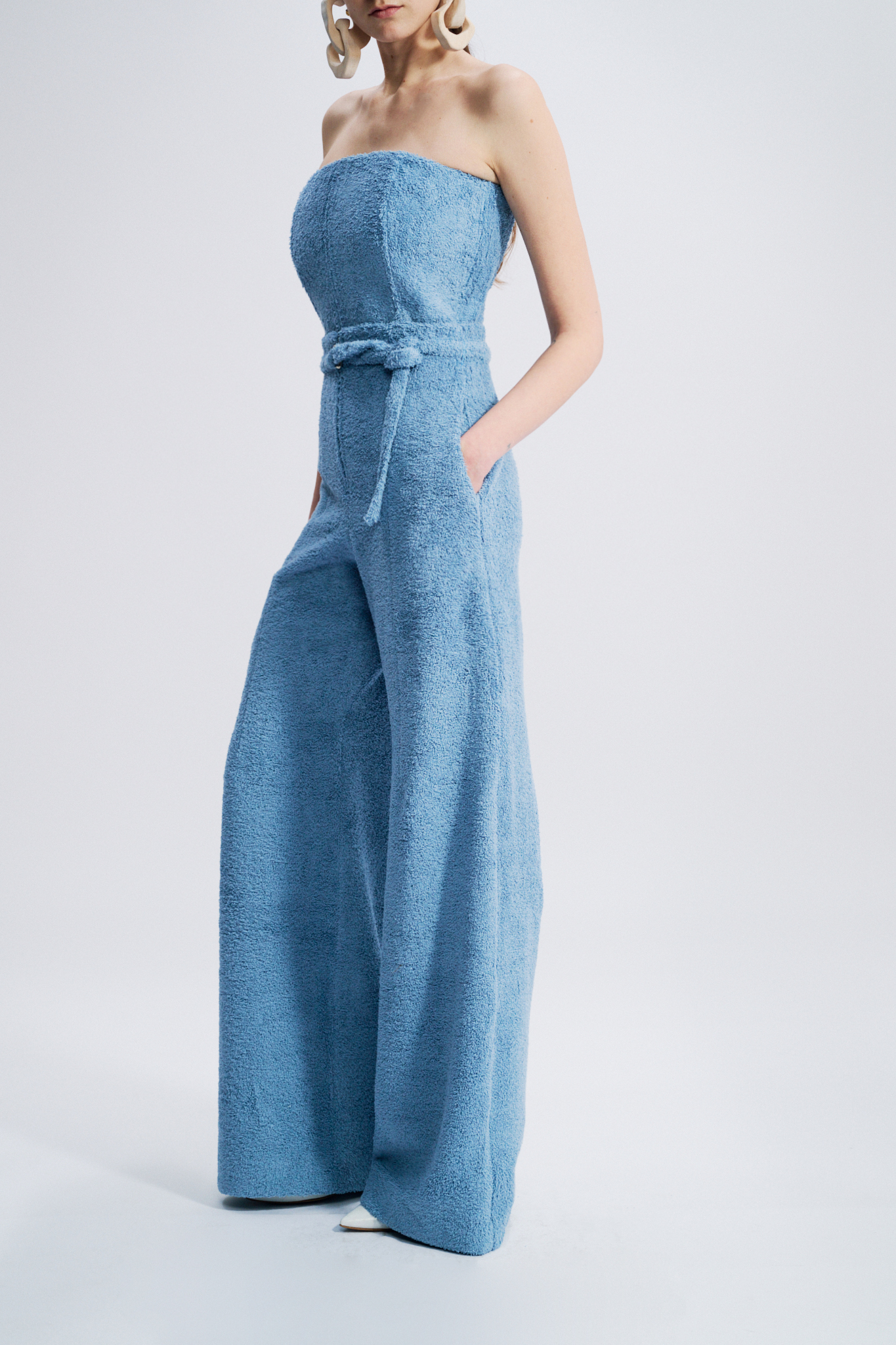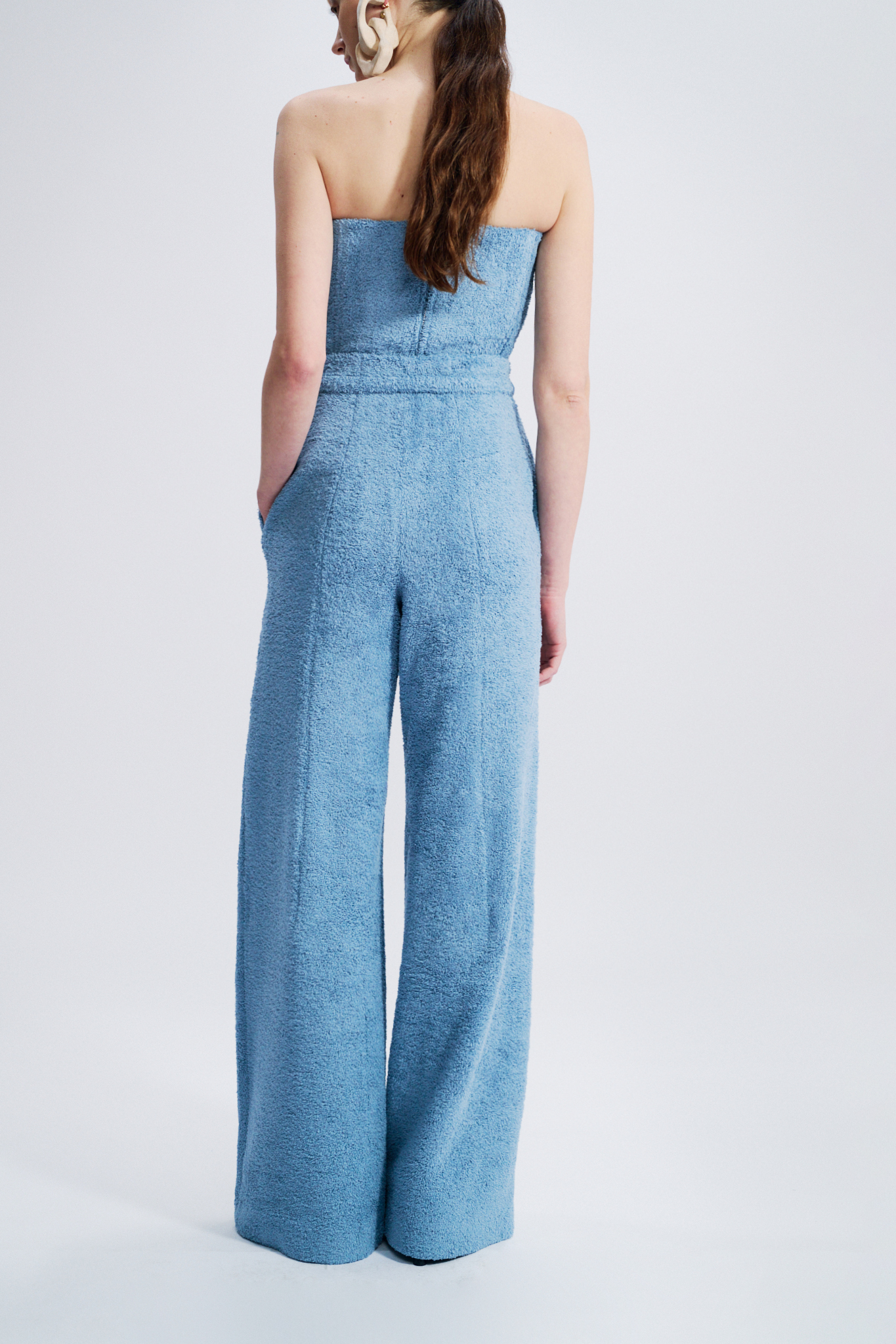 This high-waisted trouser embodies a structured yet effortless elegance. Crafted from cotton terry, it elongates the silhouette with its wide-leg cut. A matching belt accentuates the waist, while discreet in-seam pockets add functionality without disrupting the purity of the line.