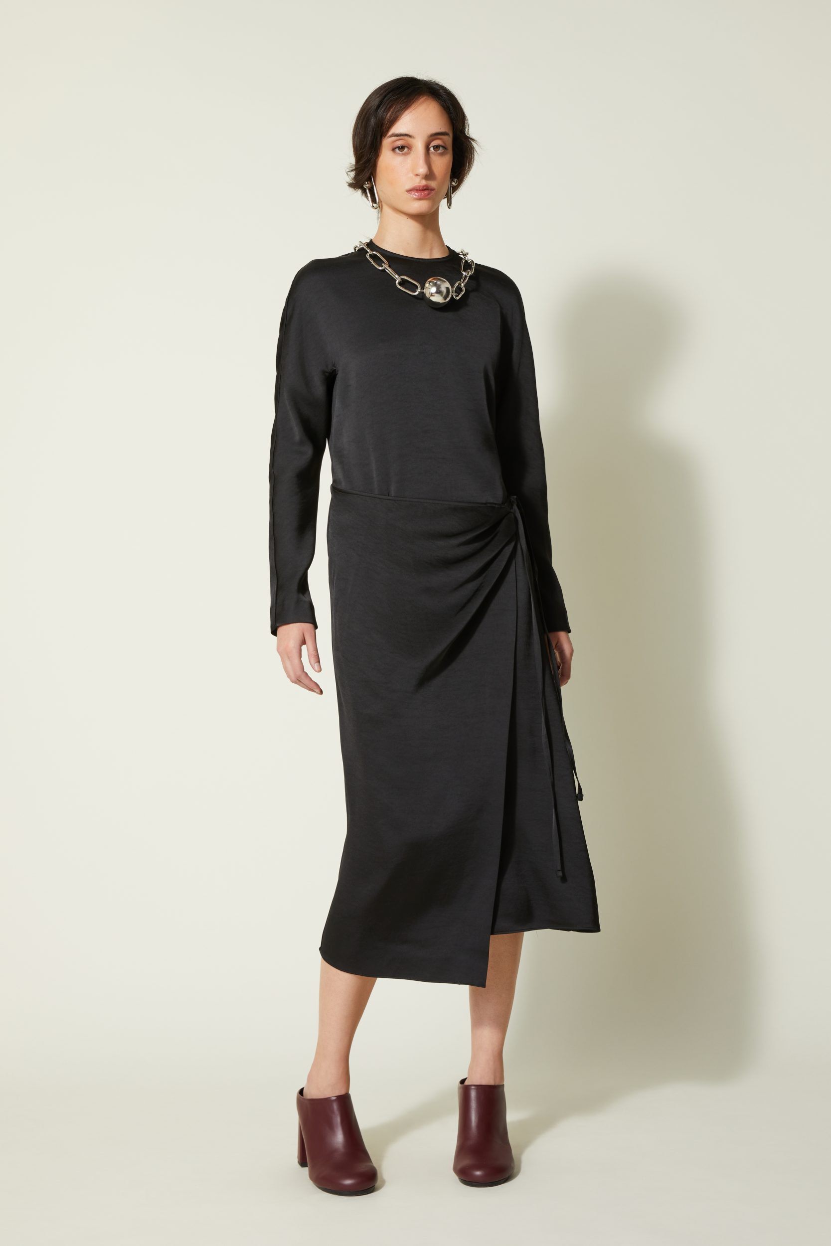 A hybrid piece with a refined silhouette, merging the structure of a straight top and the fluidity of a draped skirt to create a wrap dress cut from fluid satin.
