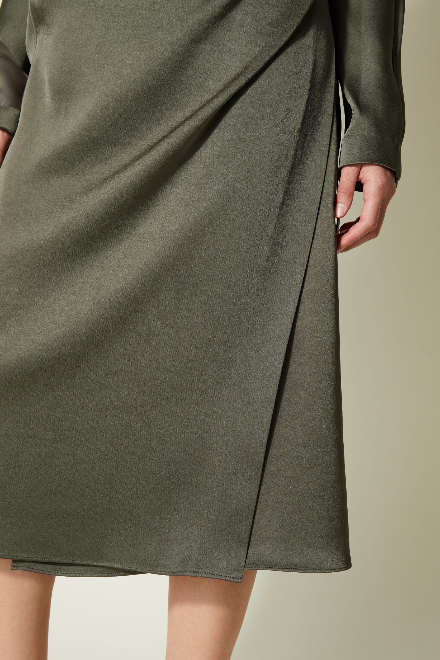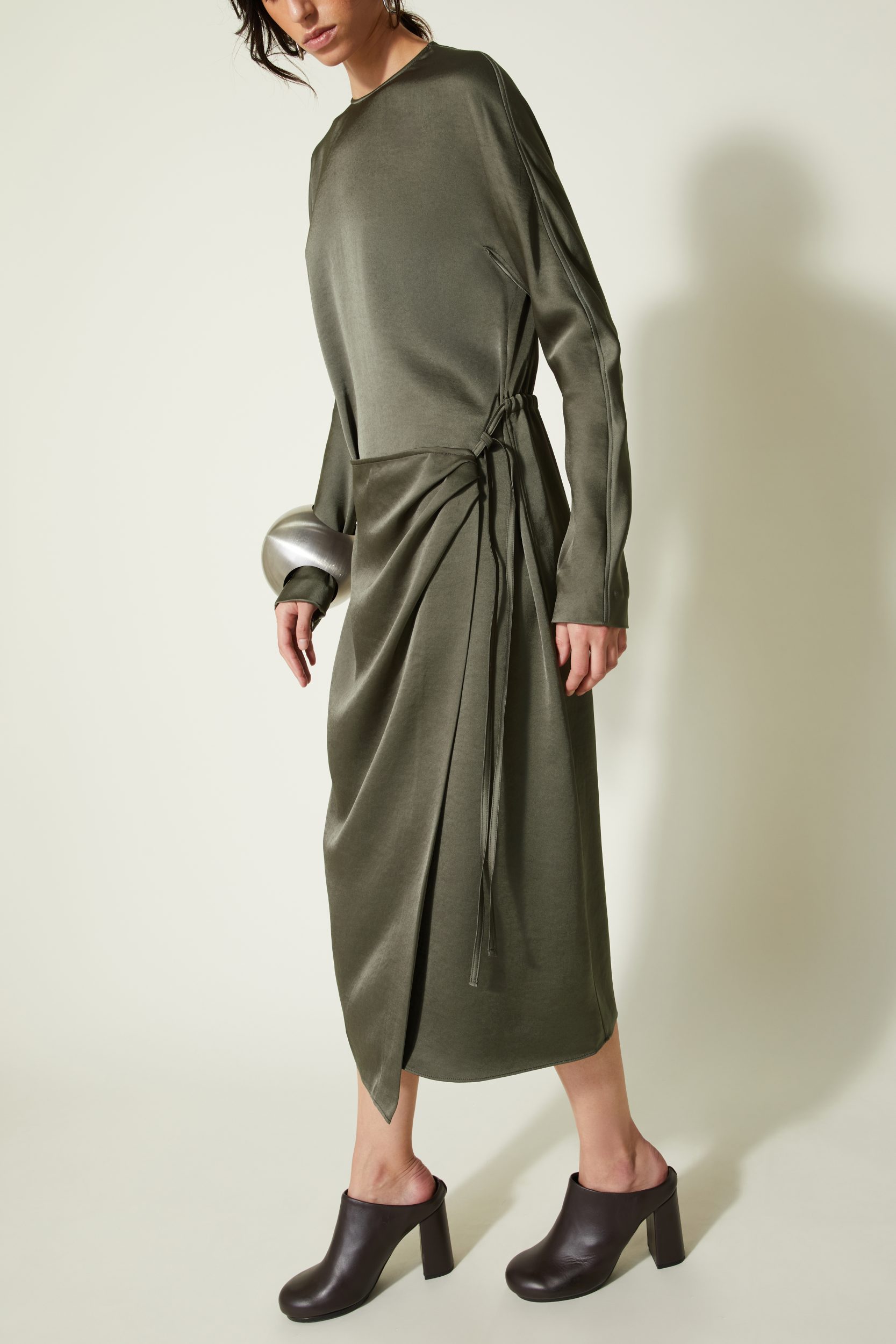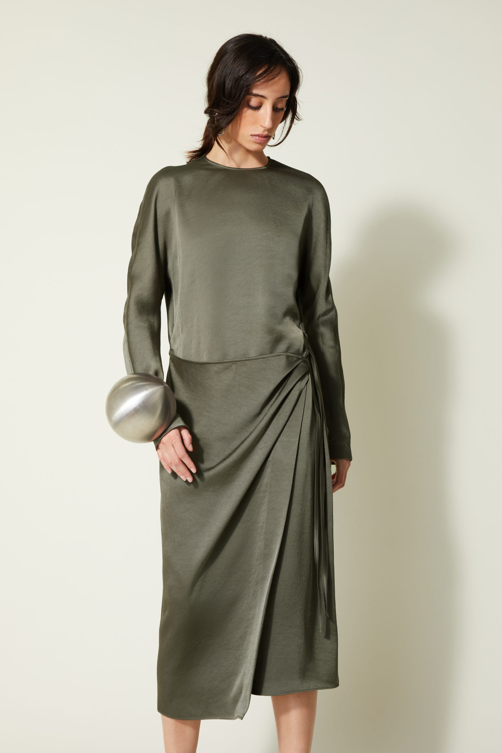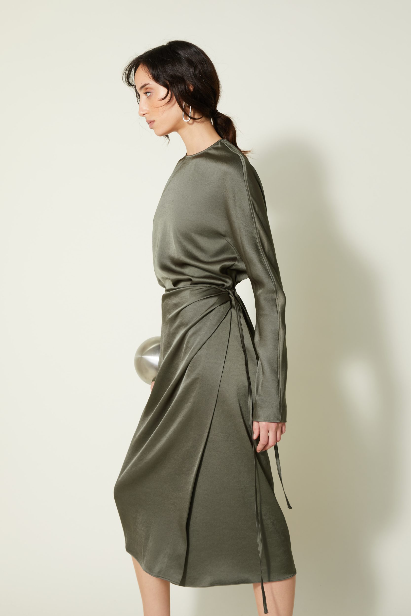 A hybrid piece with a refined silhouette, merging the structure of a straight top and the fluidity of a draped skirt to create a wrap dress cut from fluid satin.