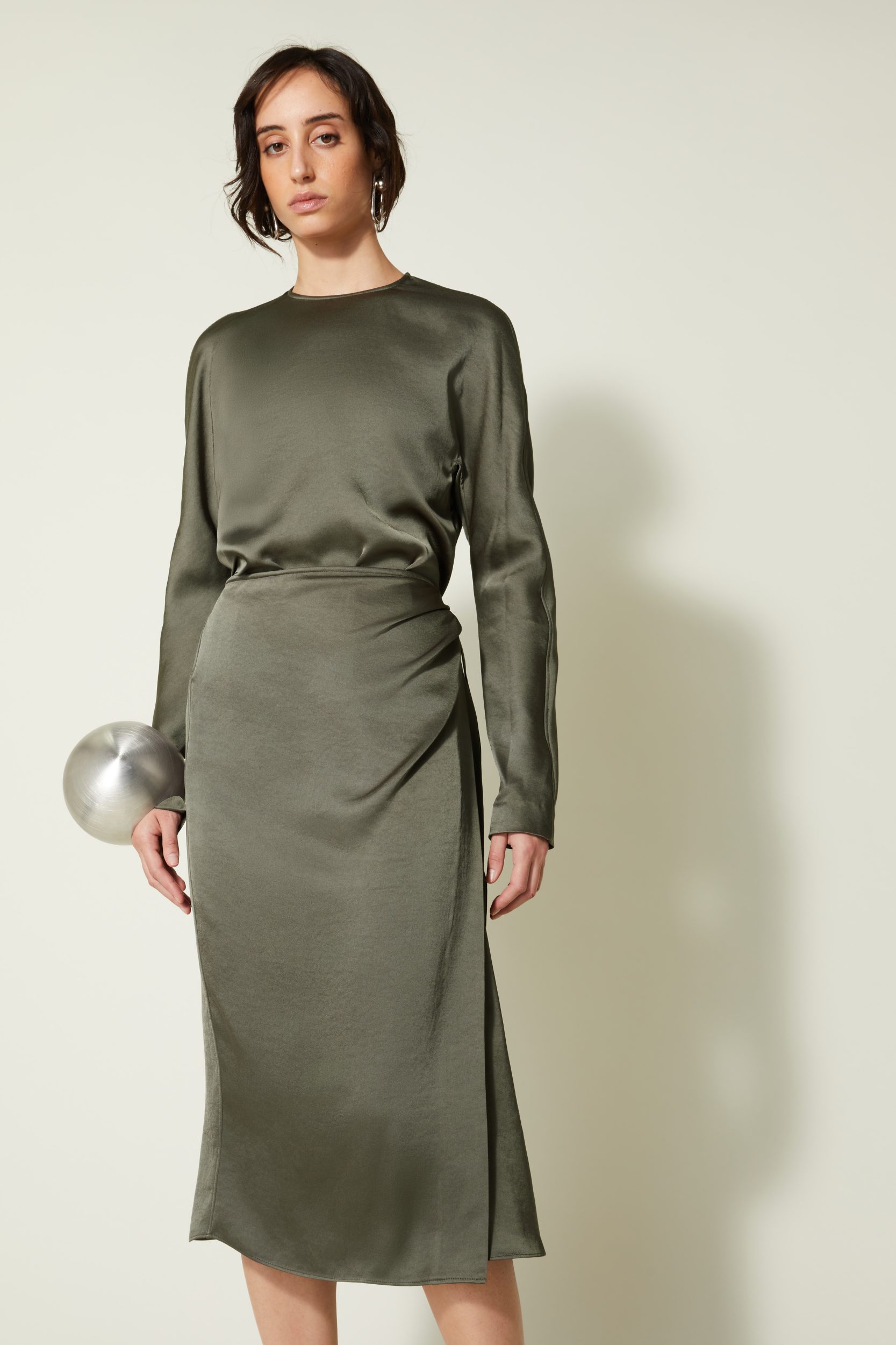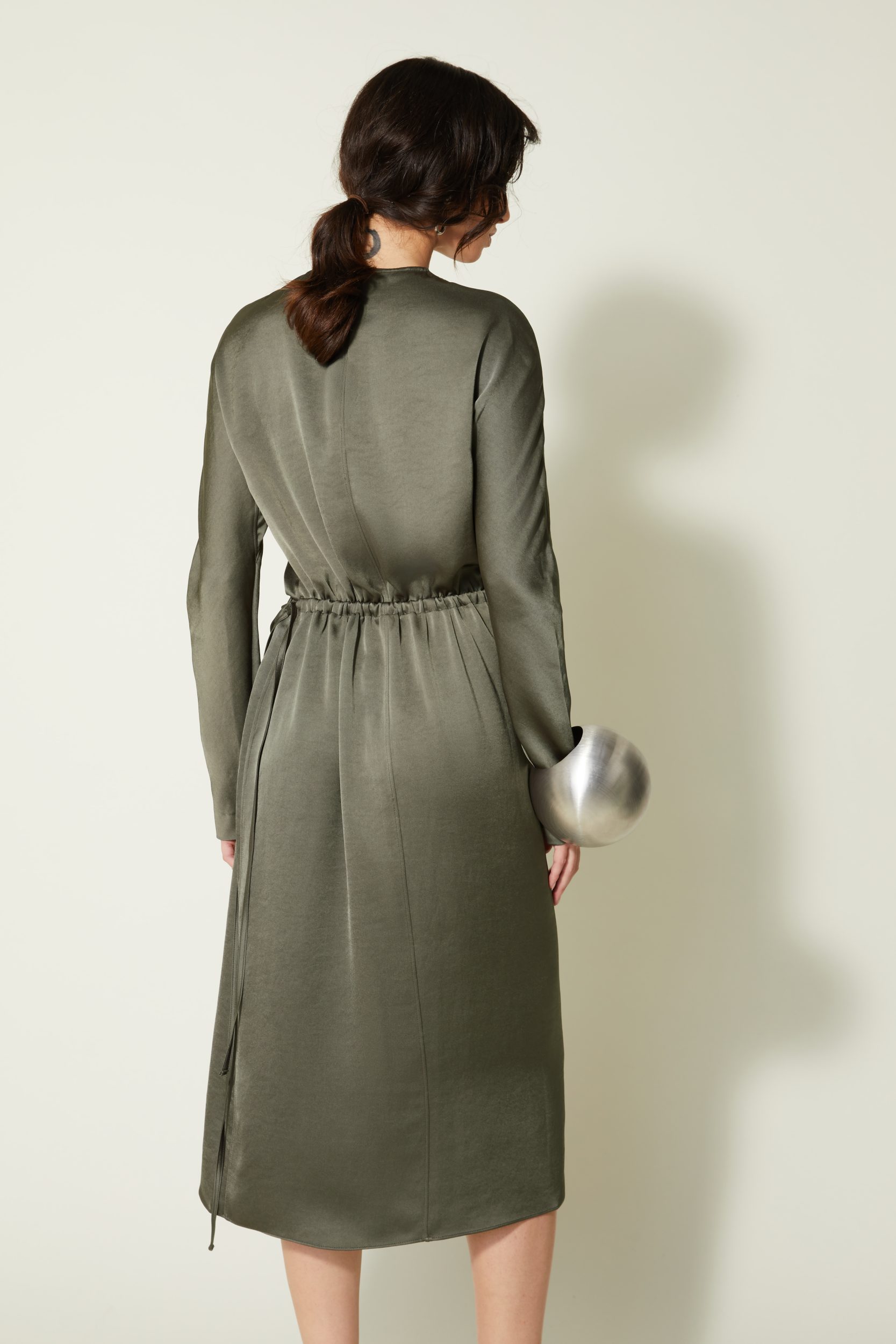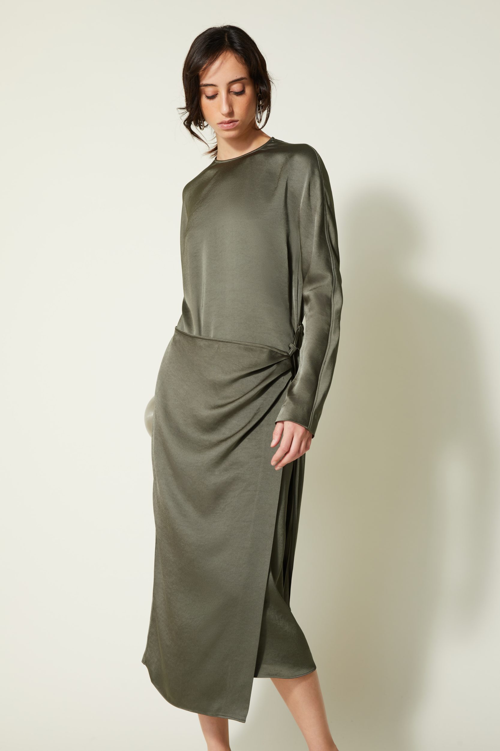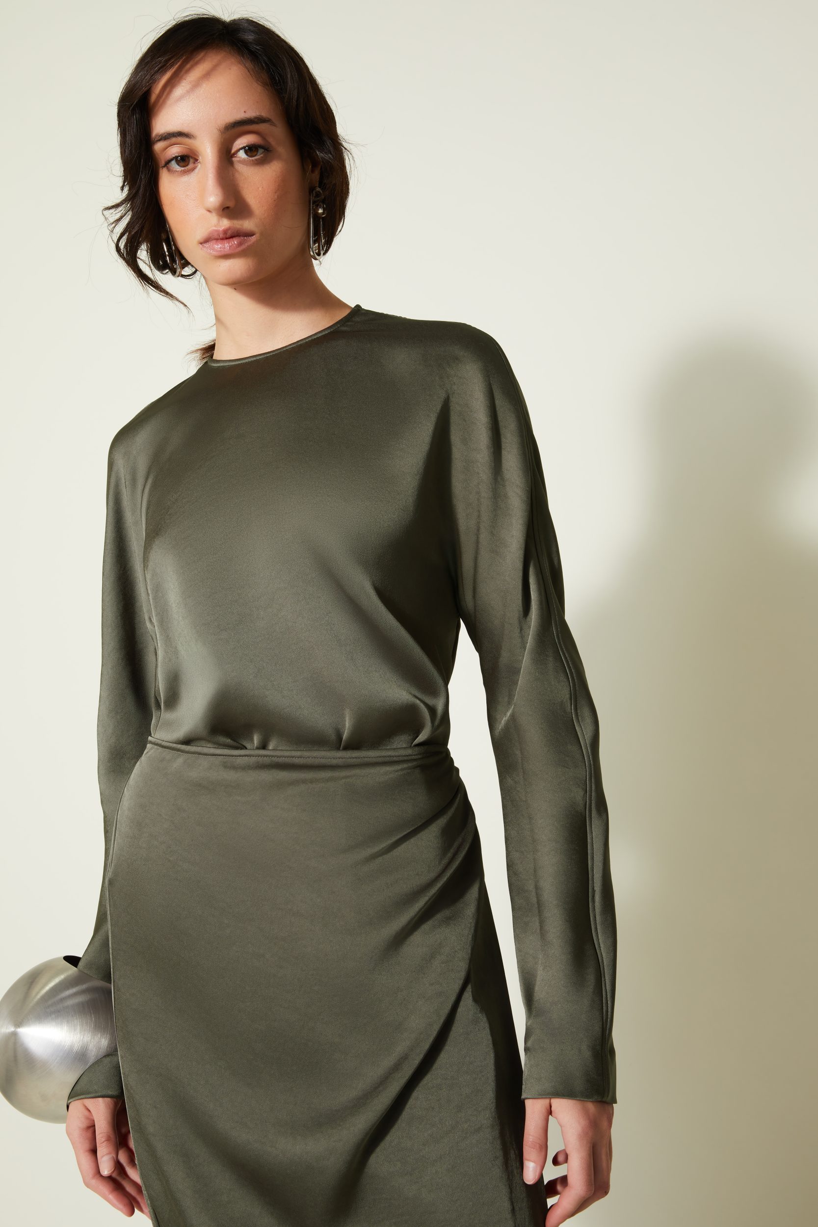 A hybrid piece with a refined silhouette, merging the structure of a straight top and the fluidity of a draped skirt to create a wrap dress cut from fluid satin.