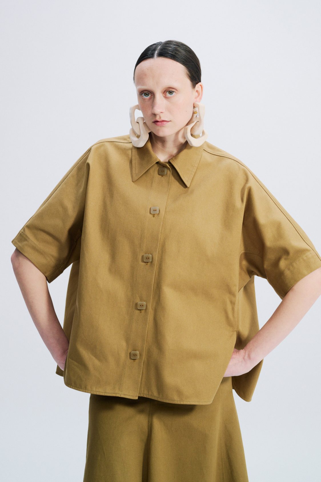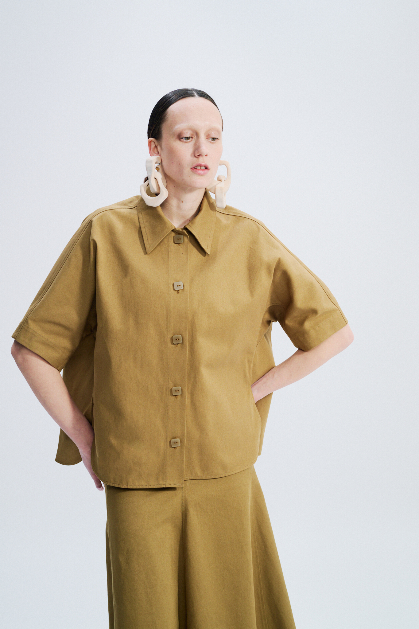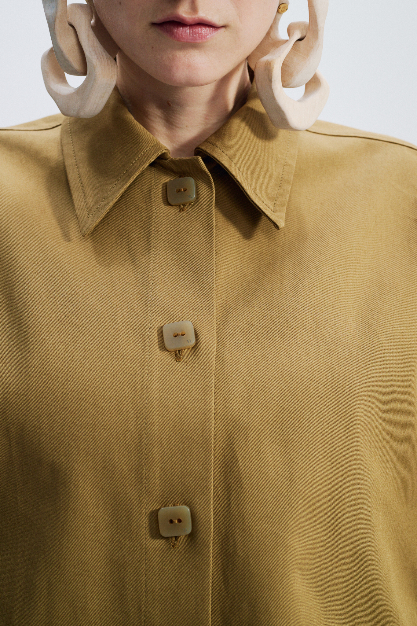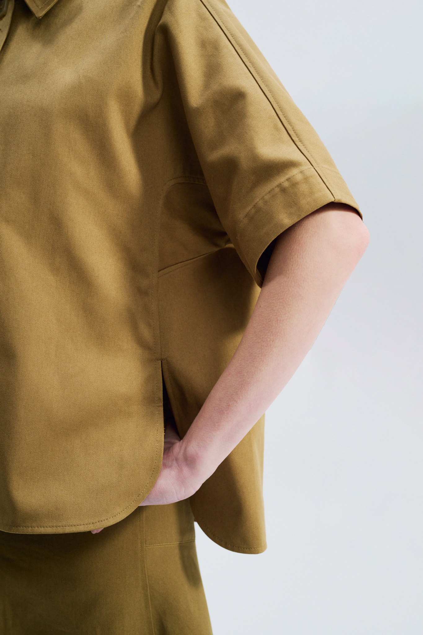 Une chemise/surchemise au look féminin/masculin légèrement déstructuré, en gabardine de coton.