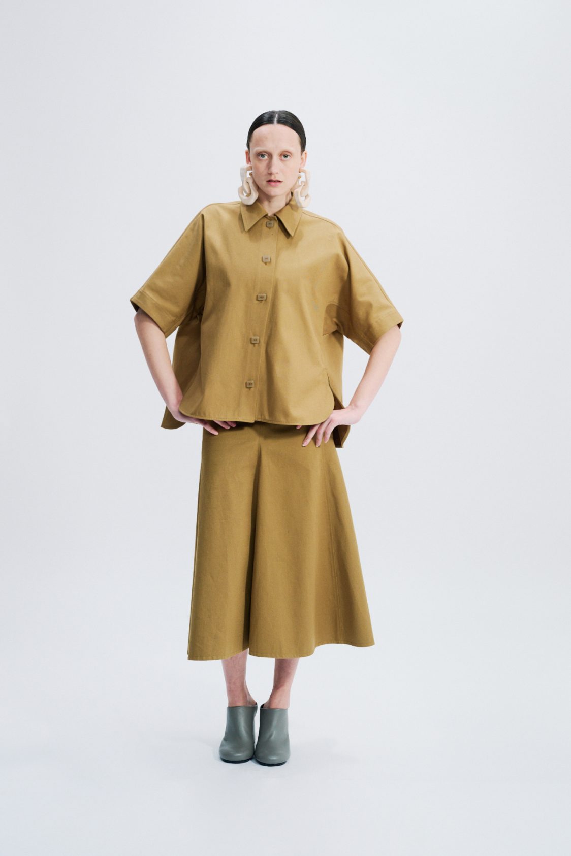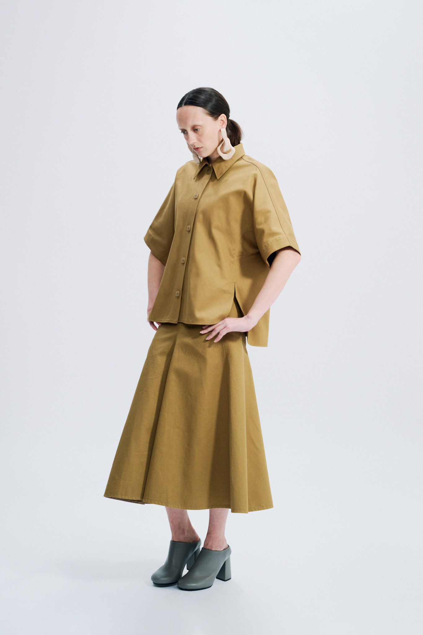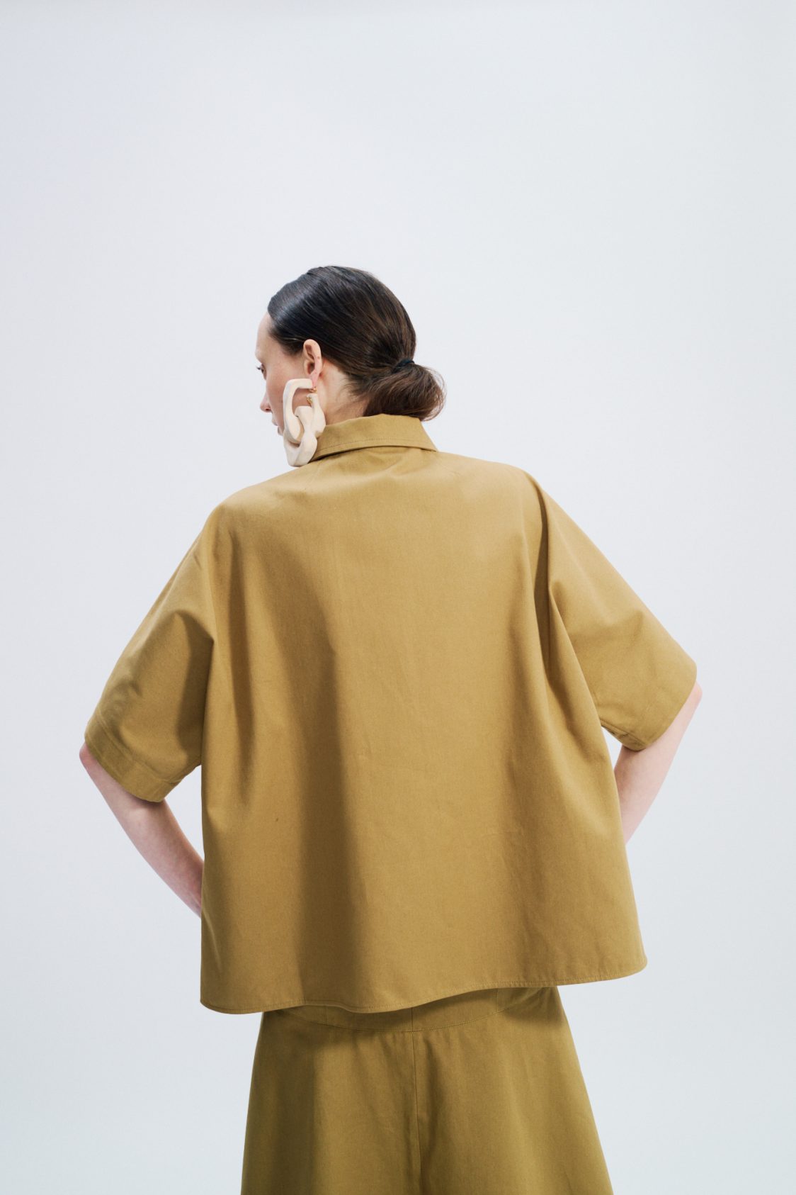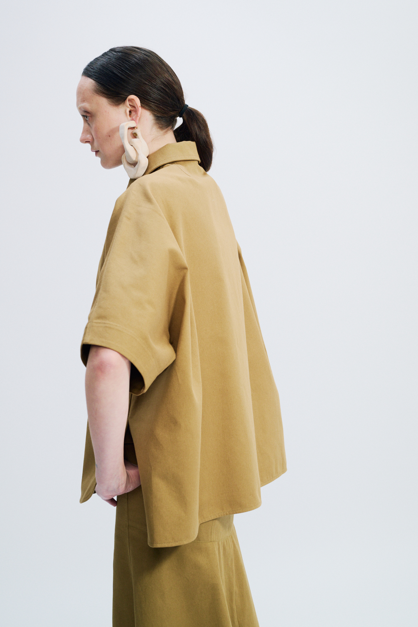 Une chemise/surchemise au look féminin/masculin légèrement déstructuré, en gabardine de coton.