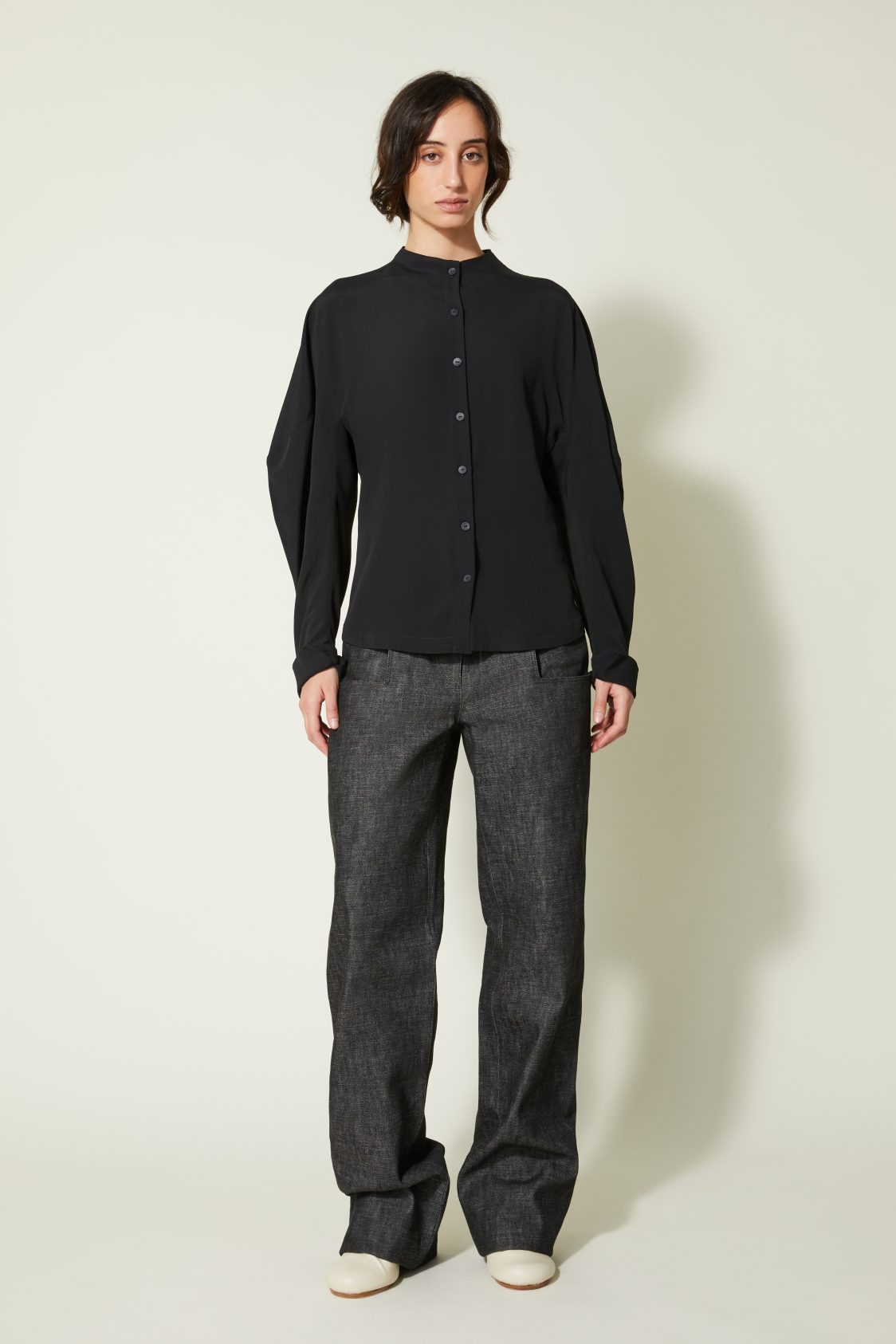 Manches galbées : forme phare de la collection — Col rond très légèrement montant — Longs poignets boutonnés avec fente — Bas arrondi — Boutons en nacre finition gomme, gravés “VL”