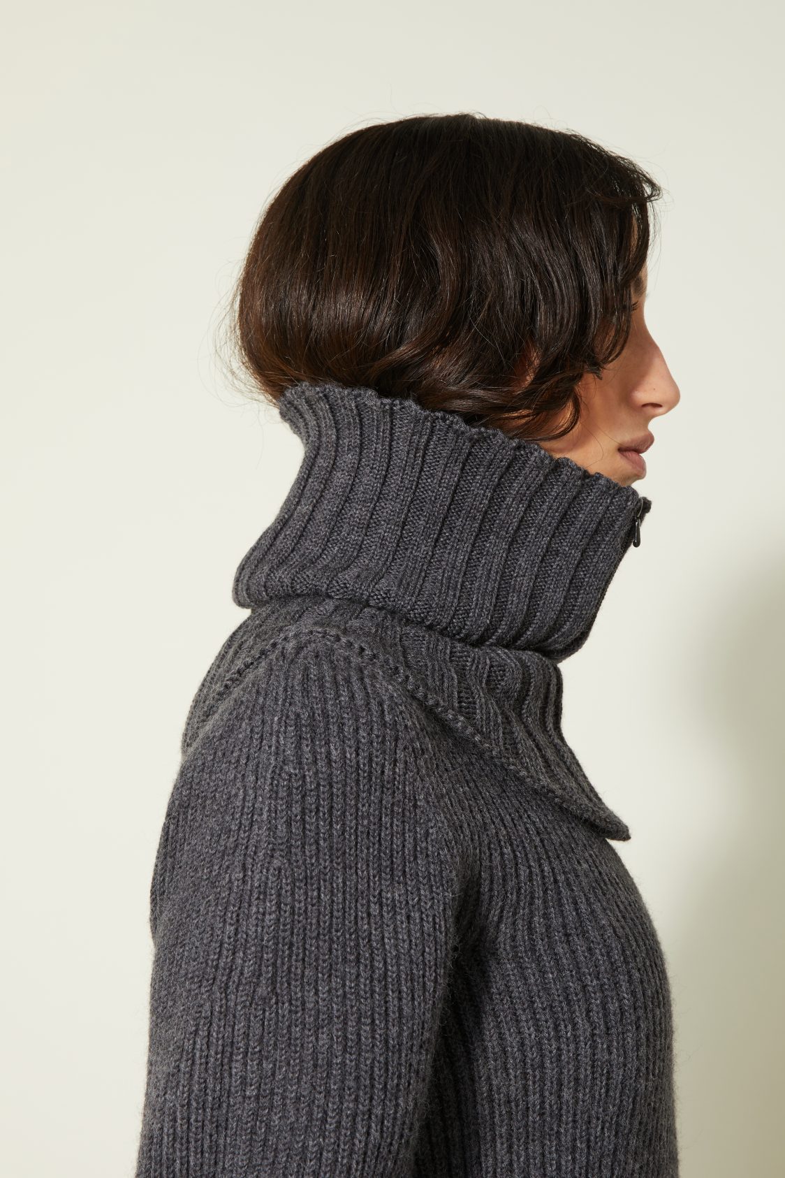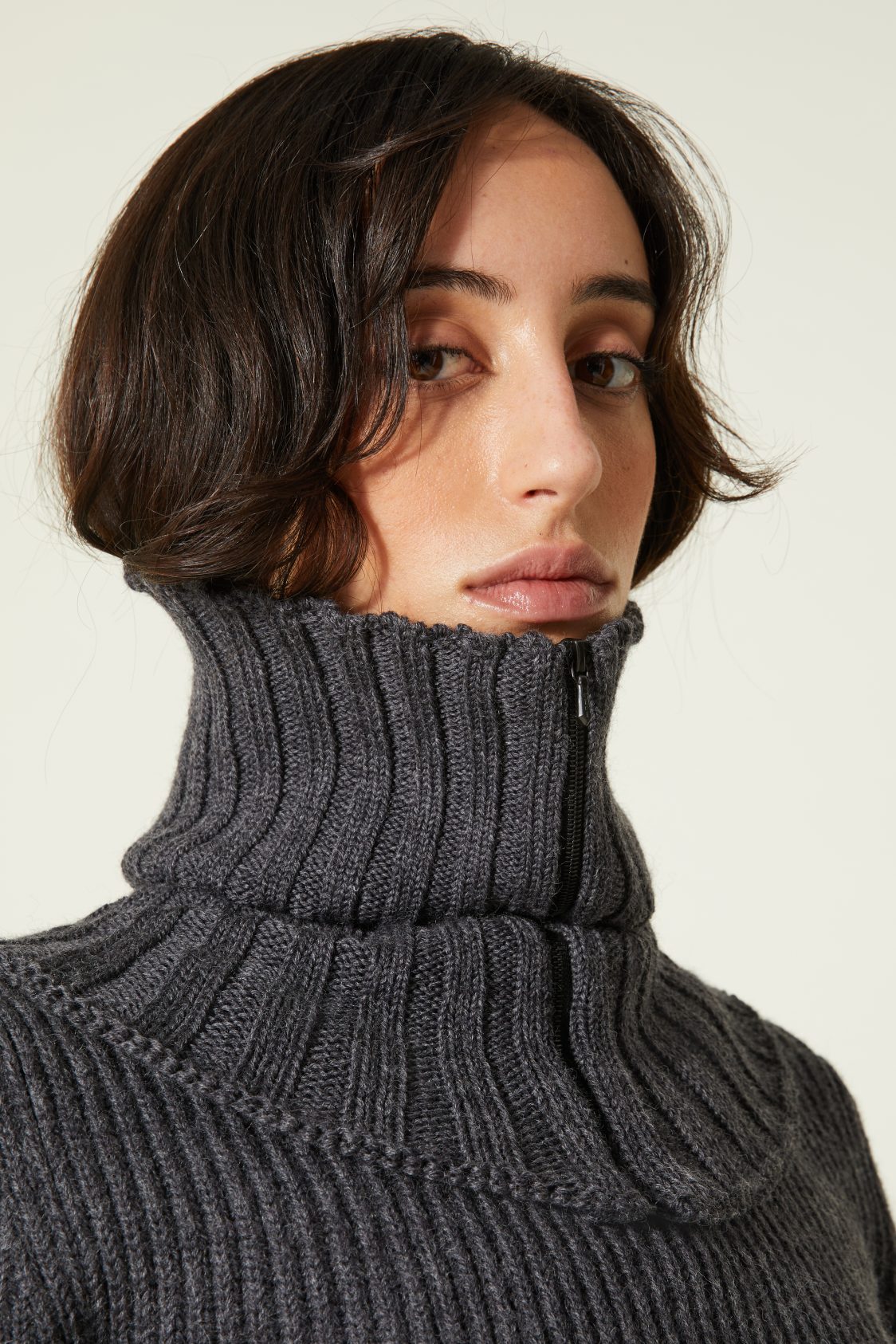 Ce col est réalisé dans une laine vierge, tricotée en larges côtes. Dans le plus pur esprit Véronique Leroy, celui-ci peut se porter de différentes manières : ouvert, comme un large col très visuel, ou fermé en tour de cou, devenant ainsi la meilleure des protections contre le froid.