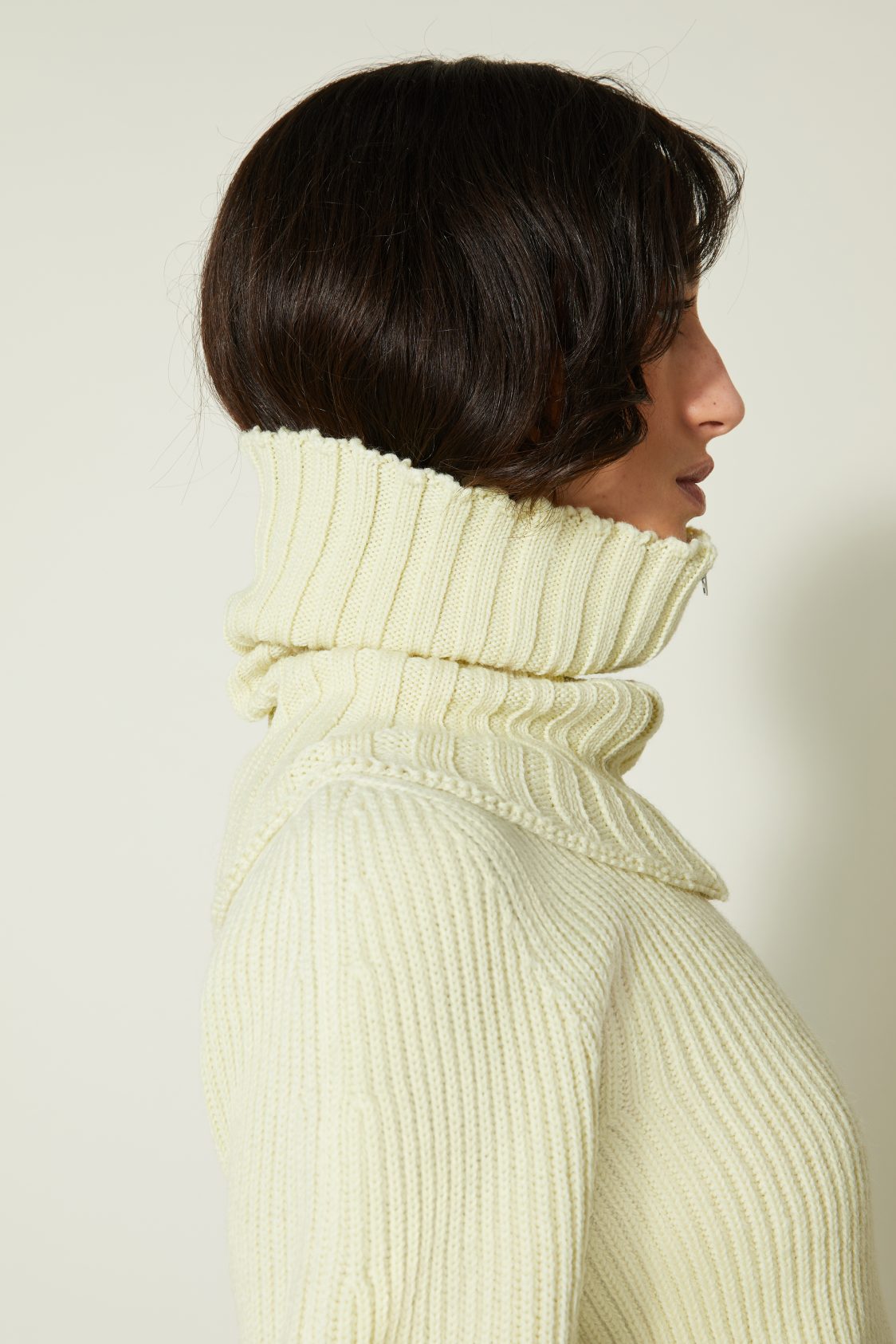 Ce col est réalisé dans une laine vierge, tricotée en larges côtes. Dans le plus pur esprit Véronique Leroy, celui-ci peut se porter de différentes manières : ouvert, comme un large col très visuel, ou fermé en tour de cou, devenant ainsi la meilleure des protections contre le froid.