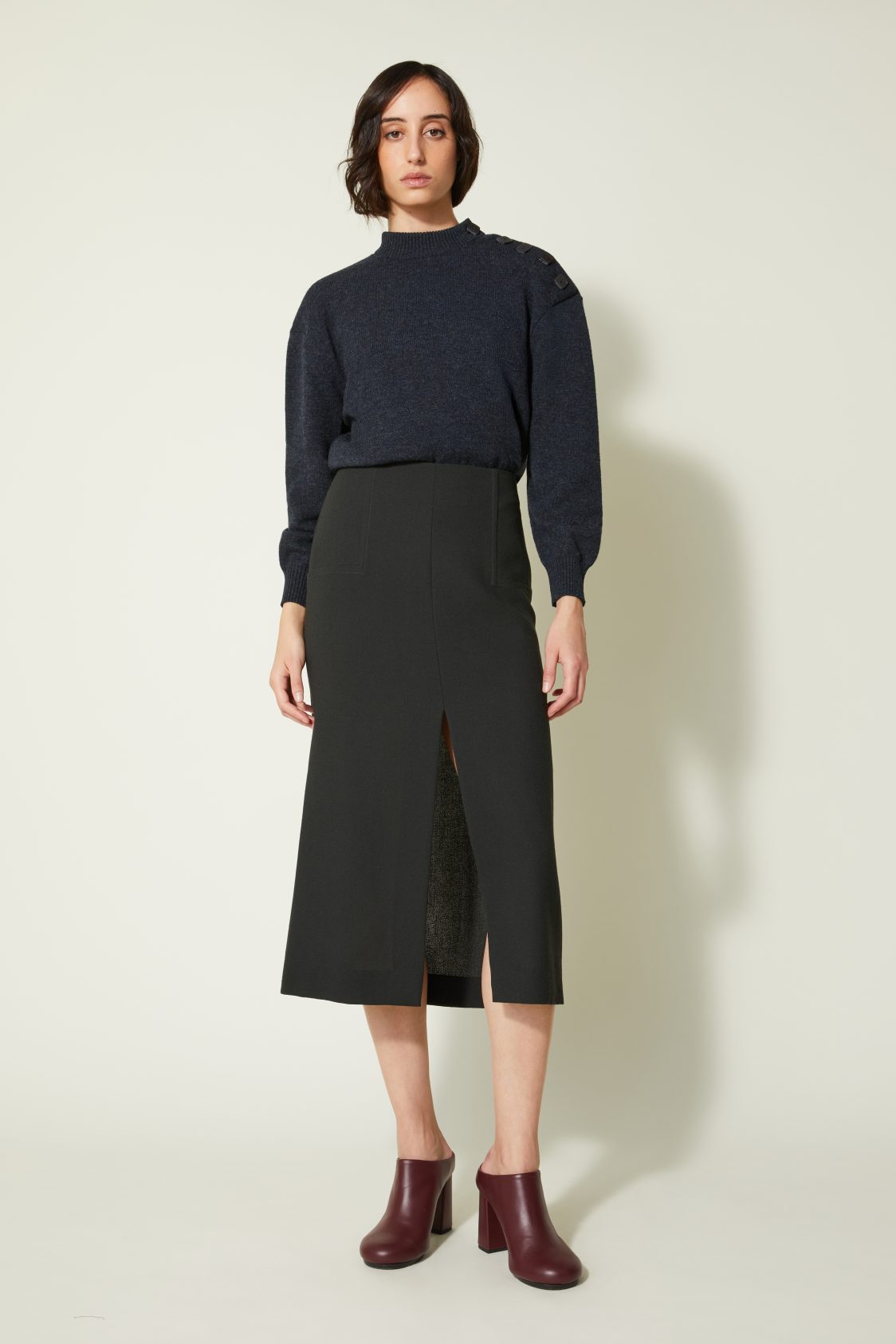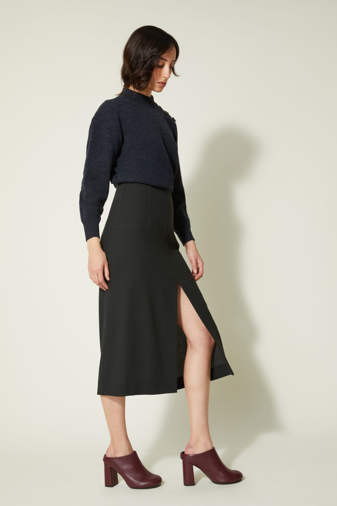 Jupe midi en crêpe de laine, à la ligne droite et élancée. La fente centrée sur le devant ouvre la silhouette et accompagne le mouvement. Les surpiqûres structurent la ligne.