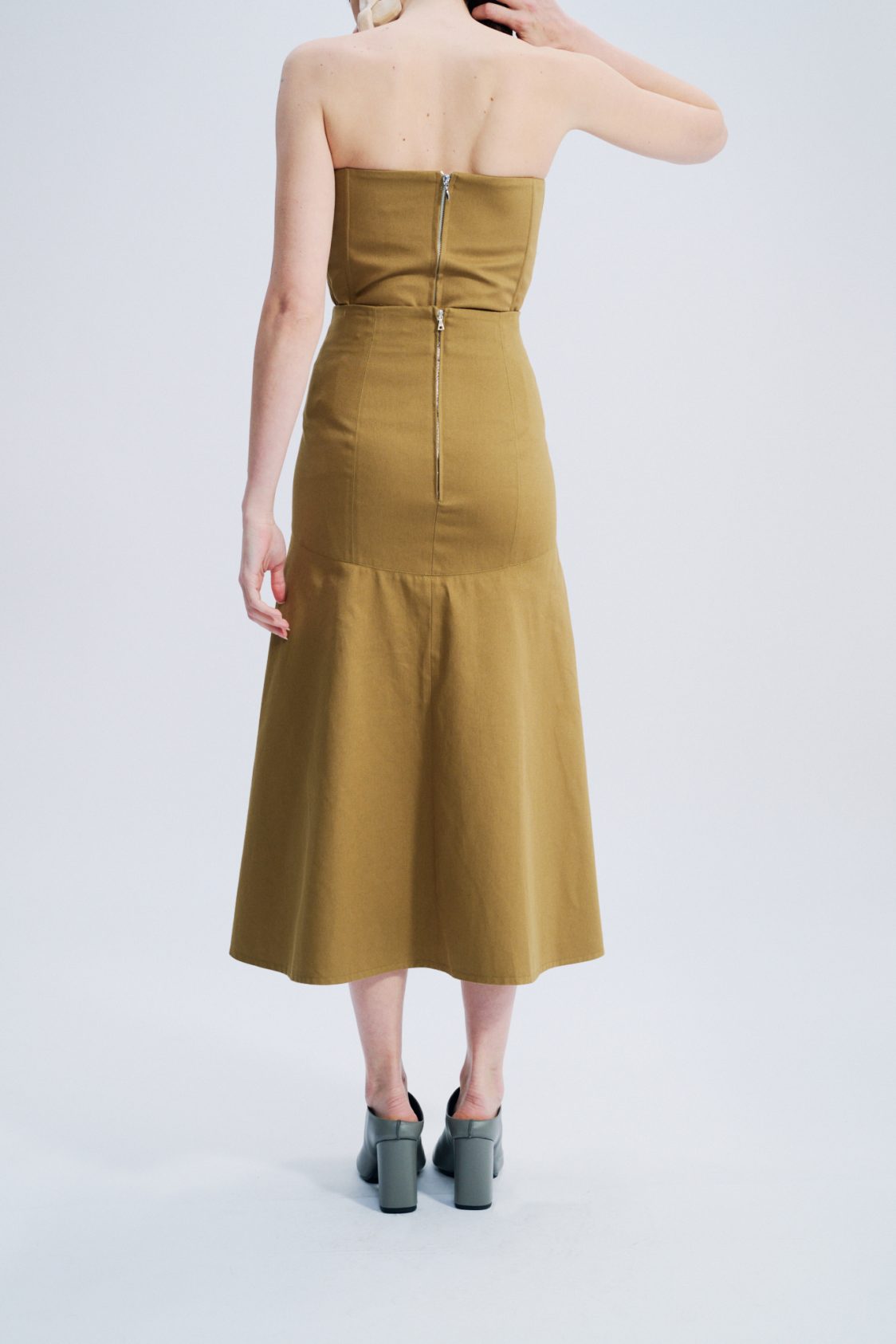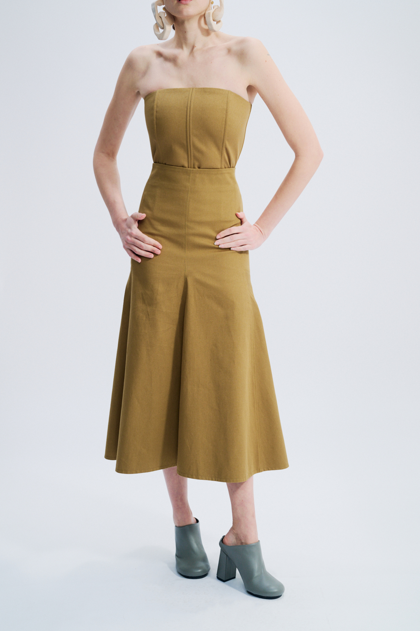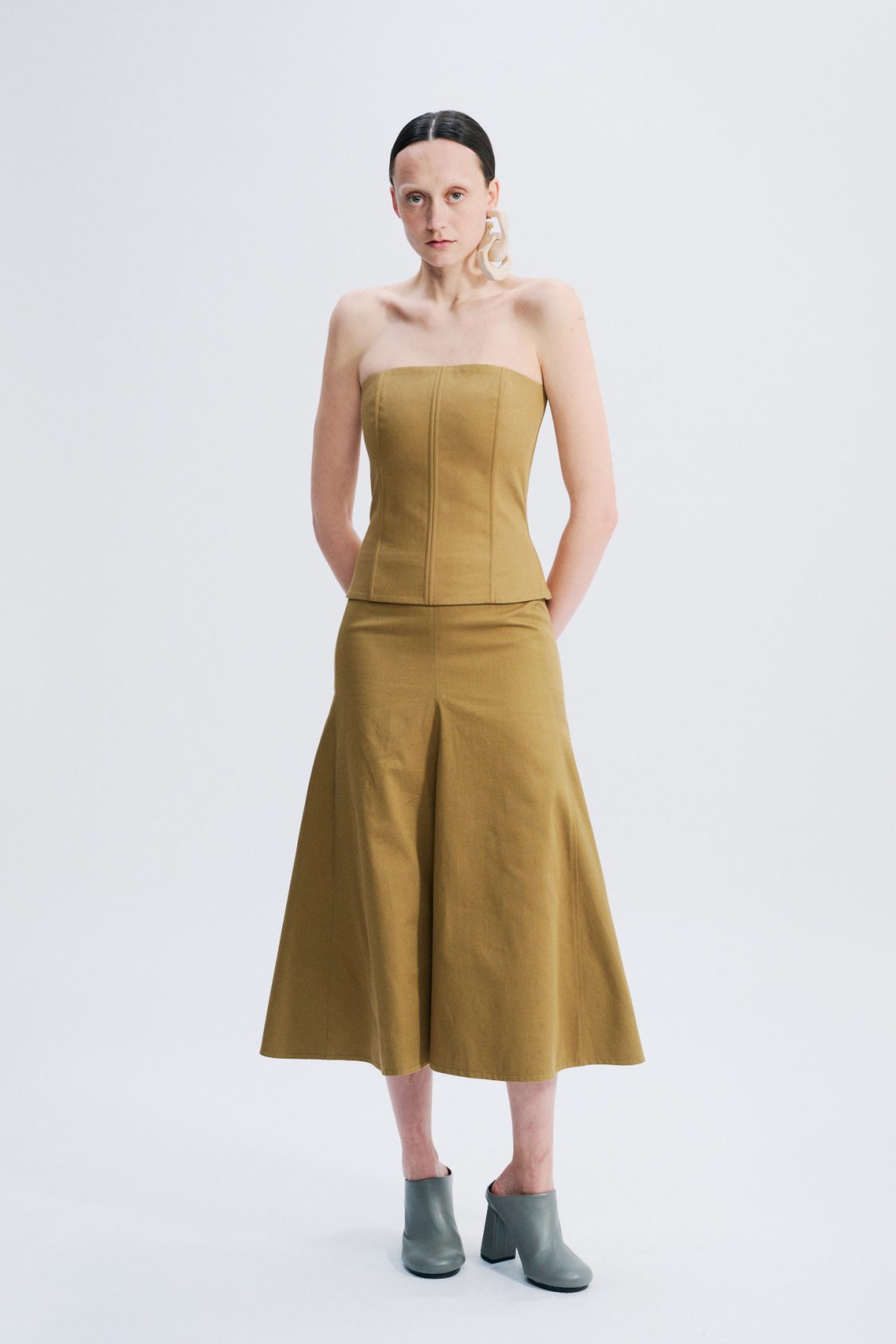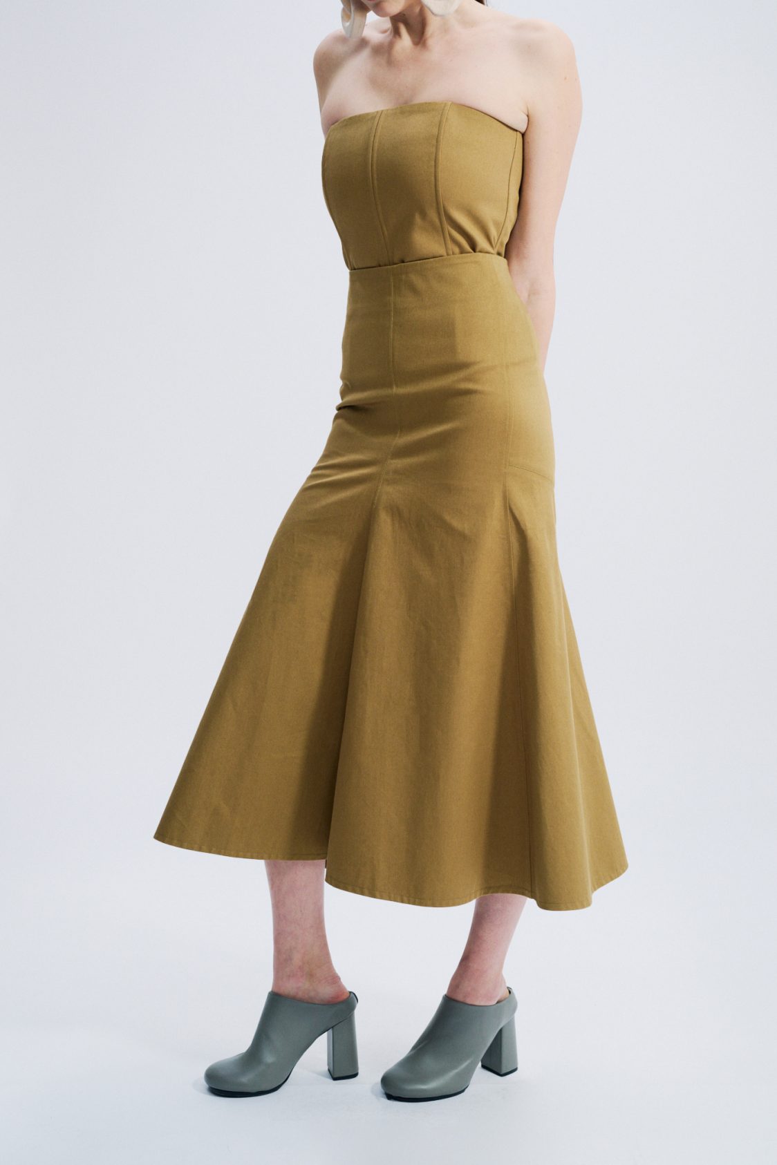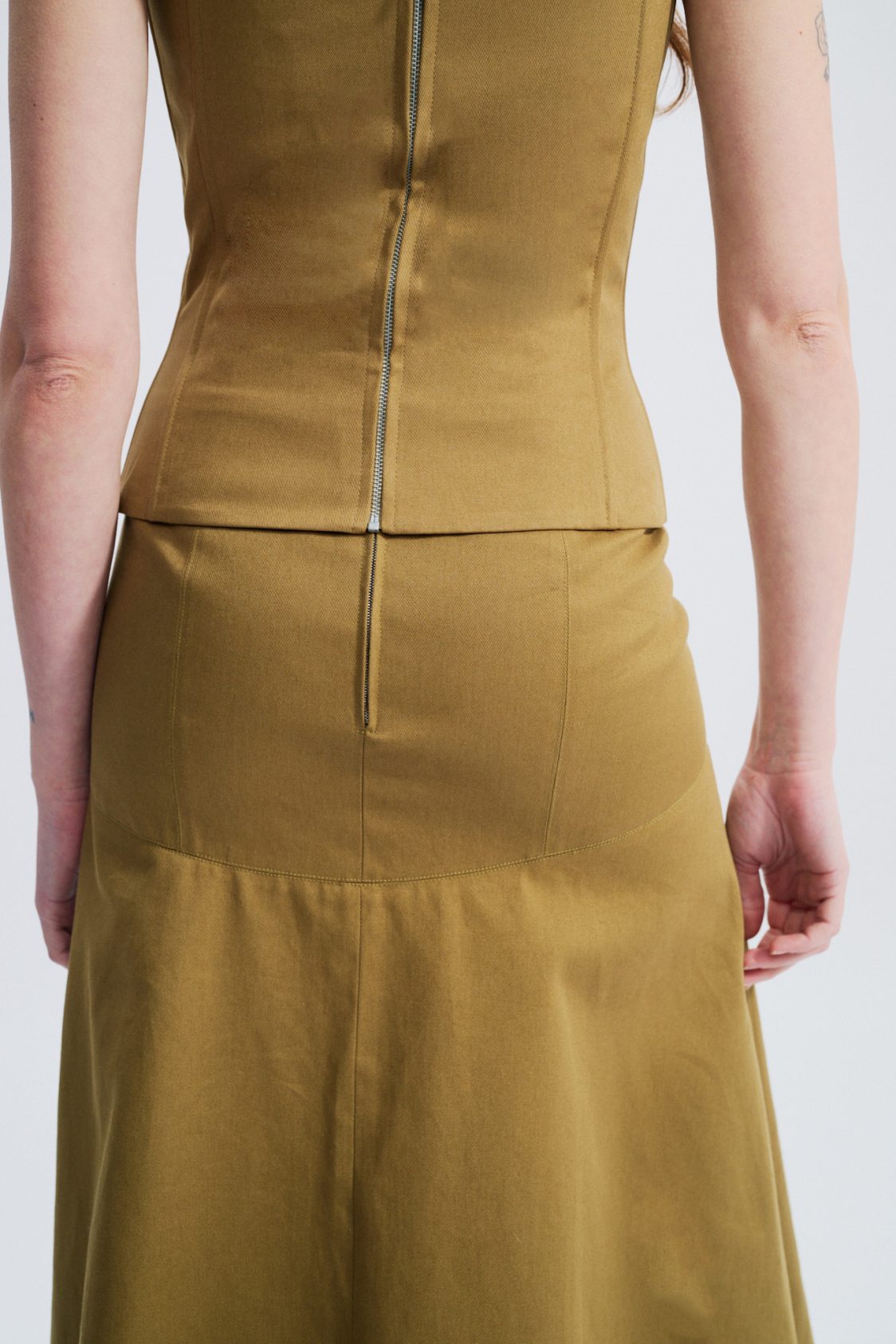 Jupe midi, ajustée sur les hanches, évasée ensuite, en gabardine de coton anglaise.