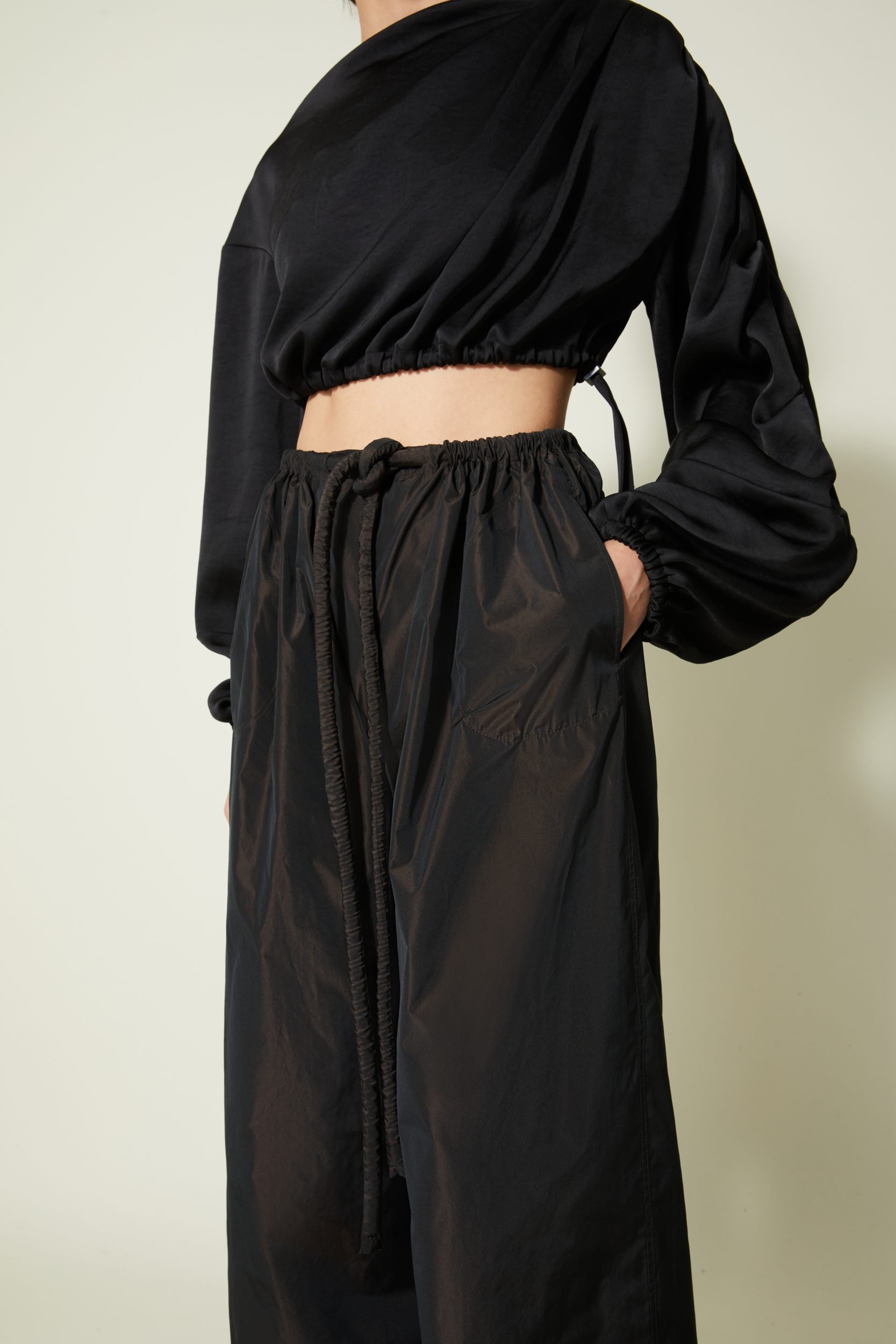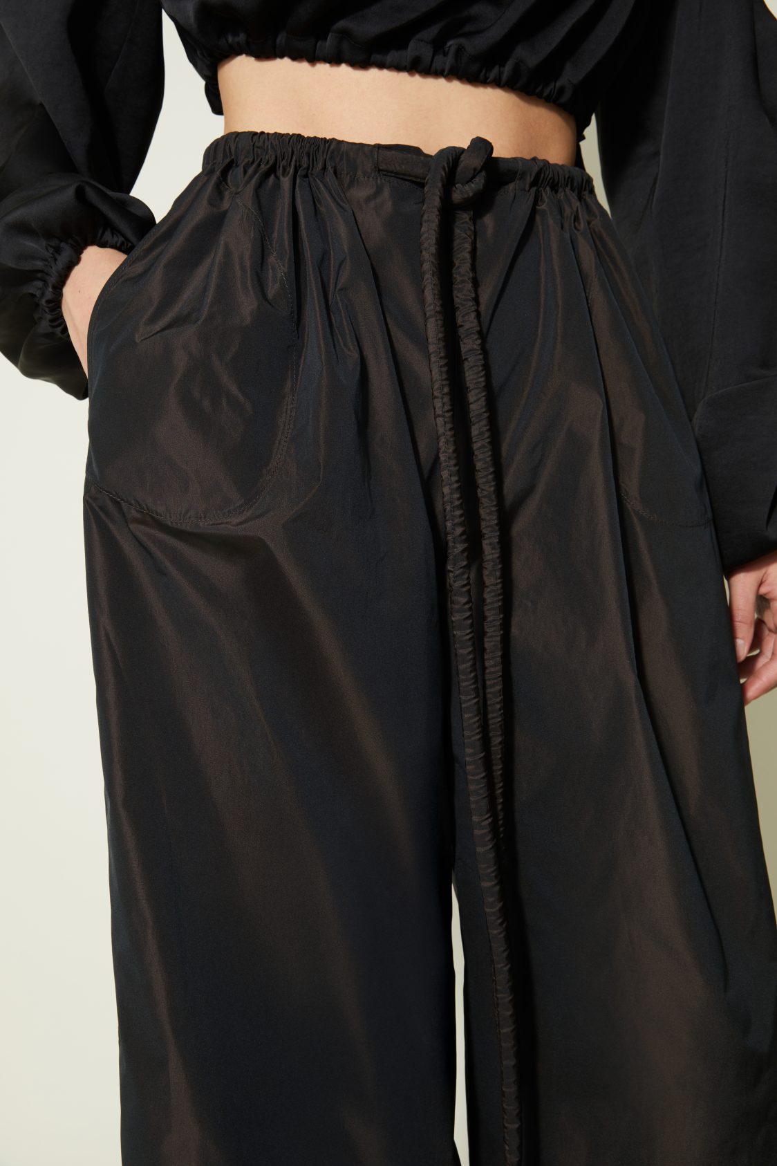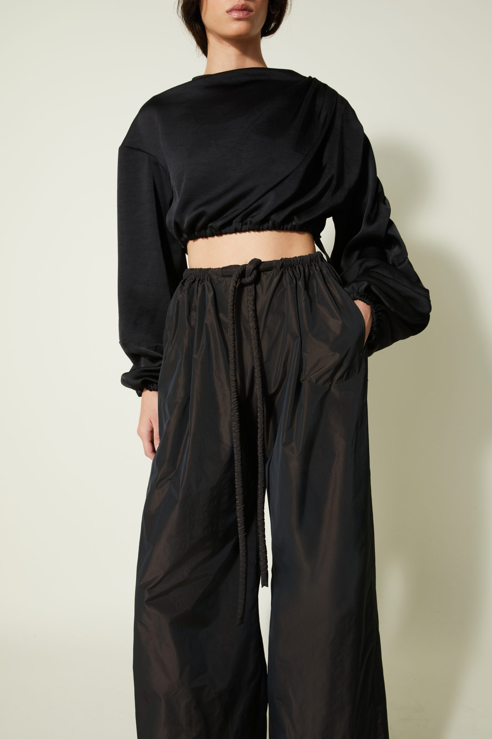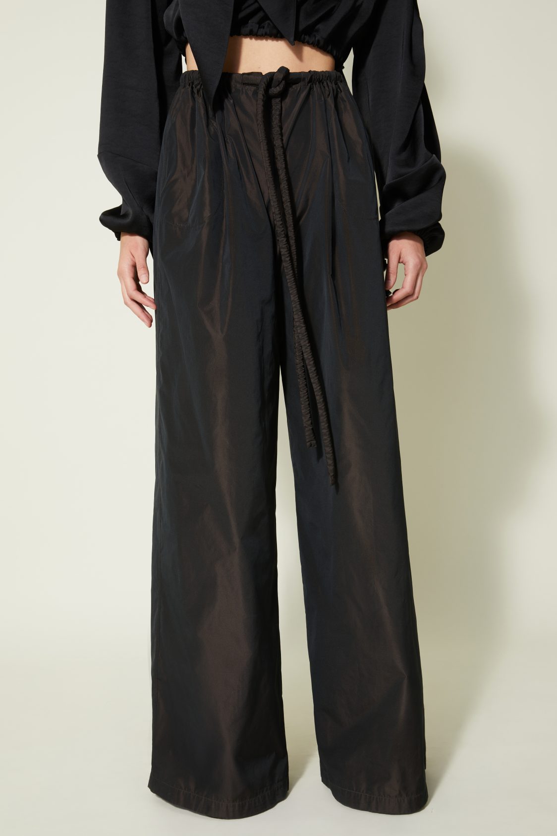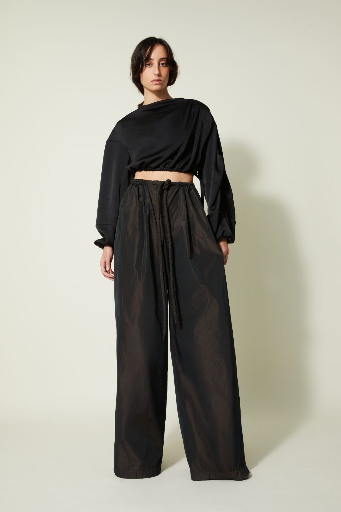 Des jambes amples et magistrales, structurées par des fronces ajustables à la taille. La ceinture “boudin” est elle aussi froncée, un pantalon très “Véronique Leroy” en somme.