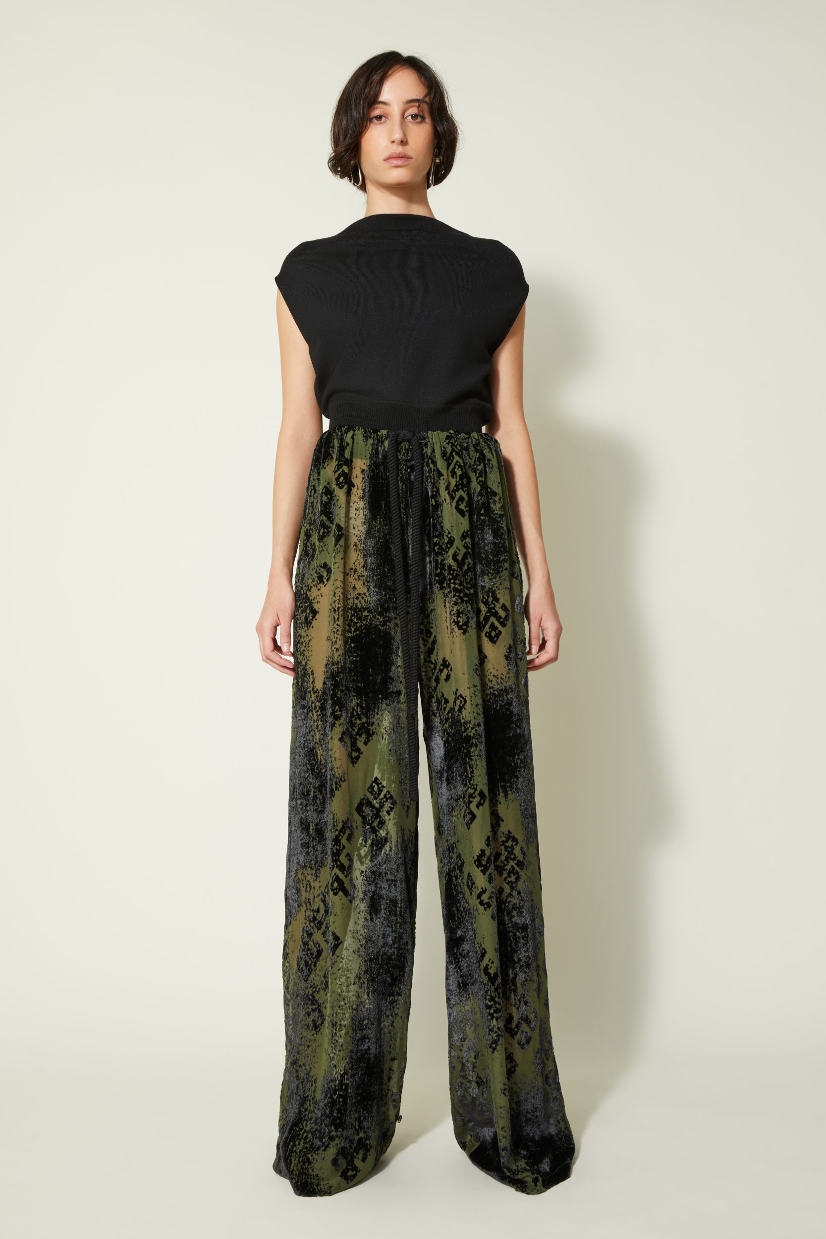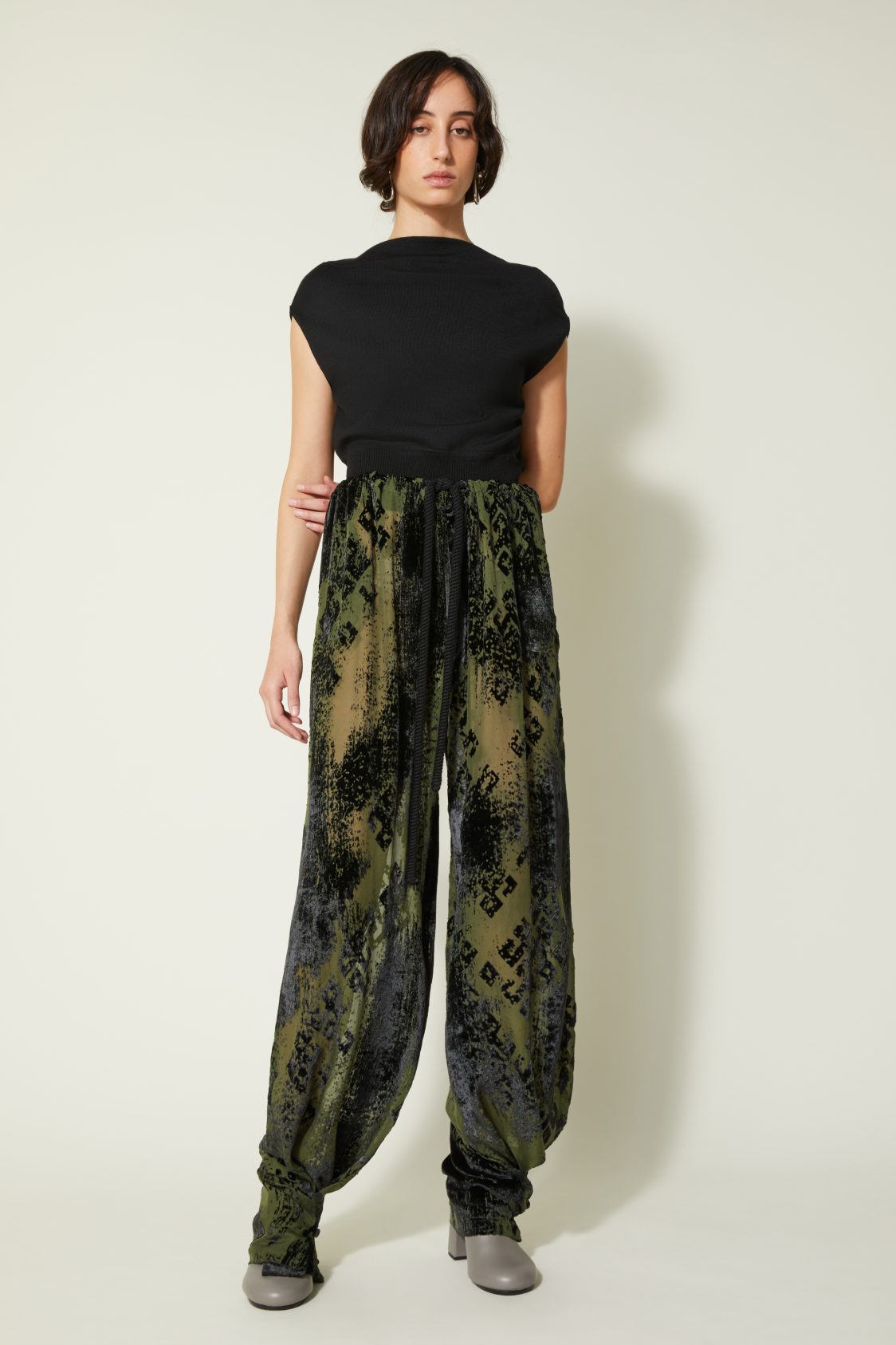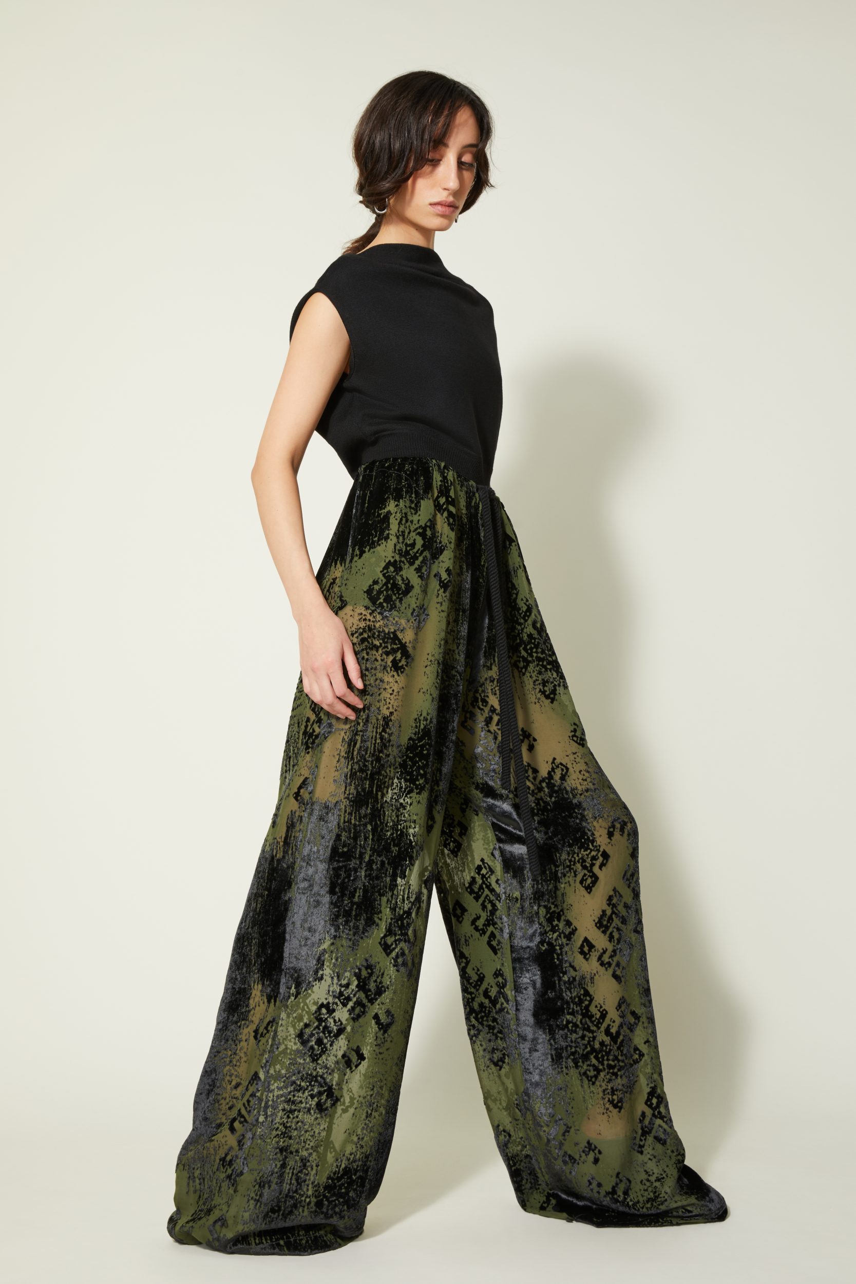 Des jambes amples et magistrales, structurées par des fronces ajustables à la taille. La ceinture “boudin” est elle aussi froncée, un pantalon très “Véronique Leroy” en somme. Réalisé ici dans un velours dévoré en soie et viscose conçu pour le défilé Automne/Hiver 2025.