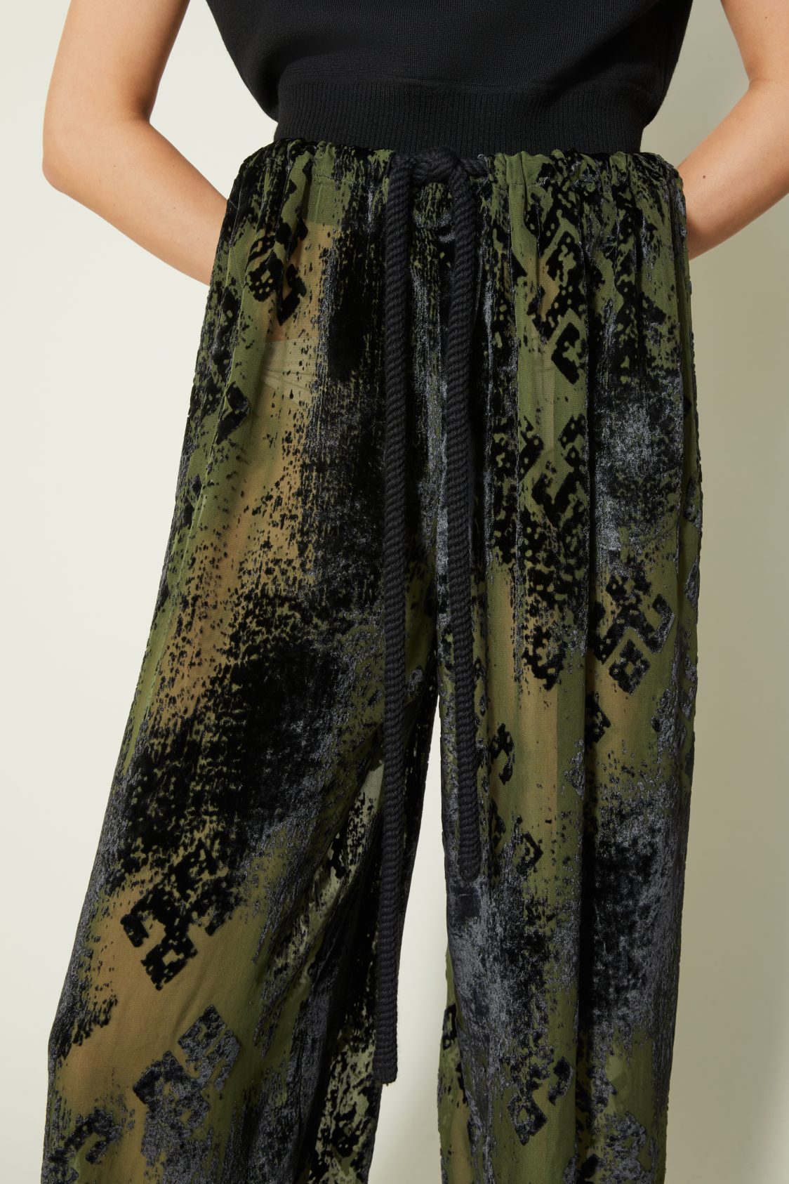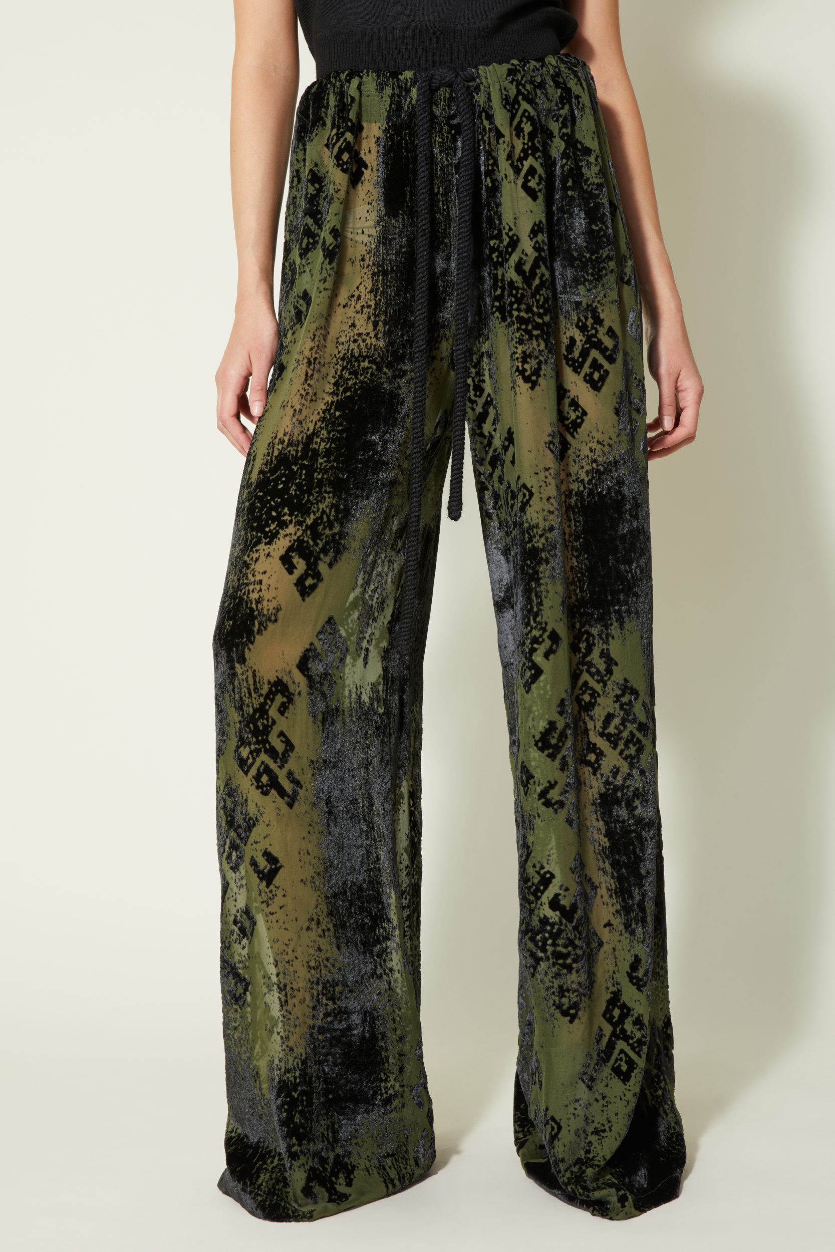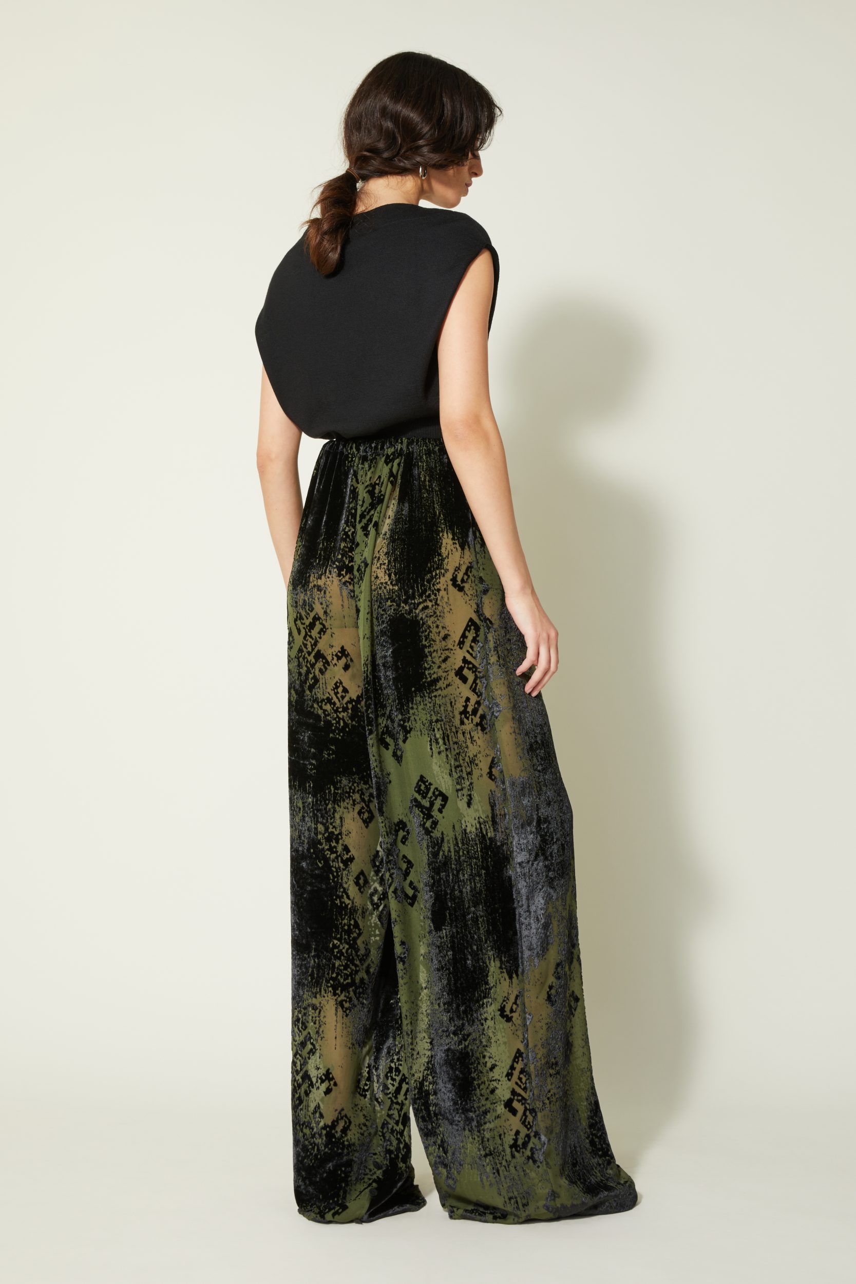 Des jambes amples et magistrales, structurées par des fronces ajustables à la taille. La ceinture “boudin” est elle aussi froncée, un pantalon très “Véronique Leroy” en somme. Réalisé ici dans un velours dévoré en soie et viscose conçu pour le défilé Automne/Hiver 2025.