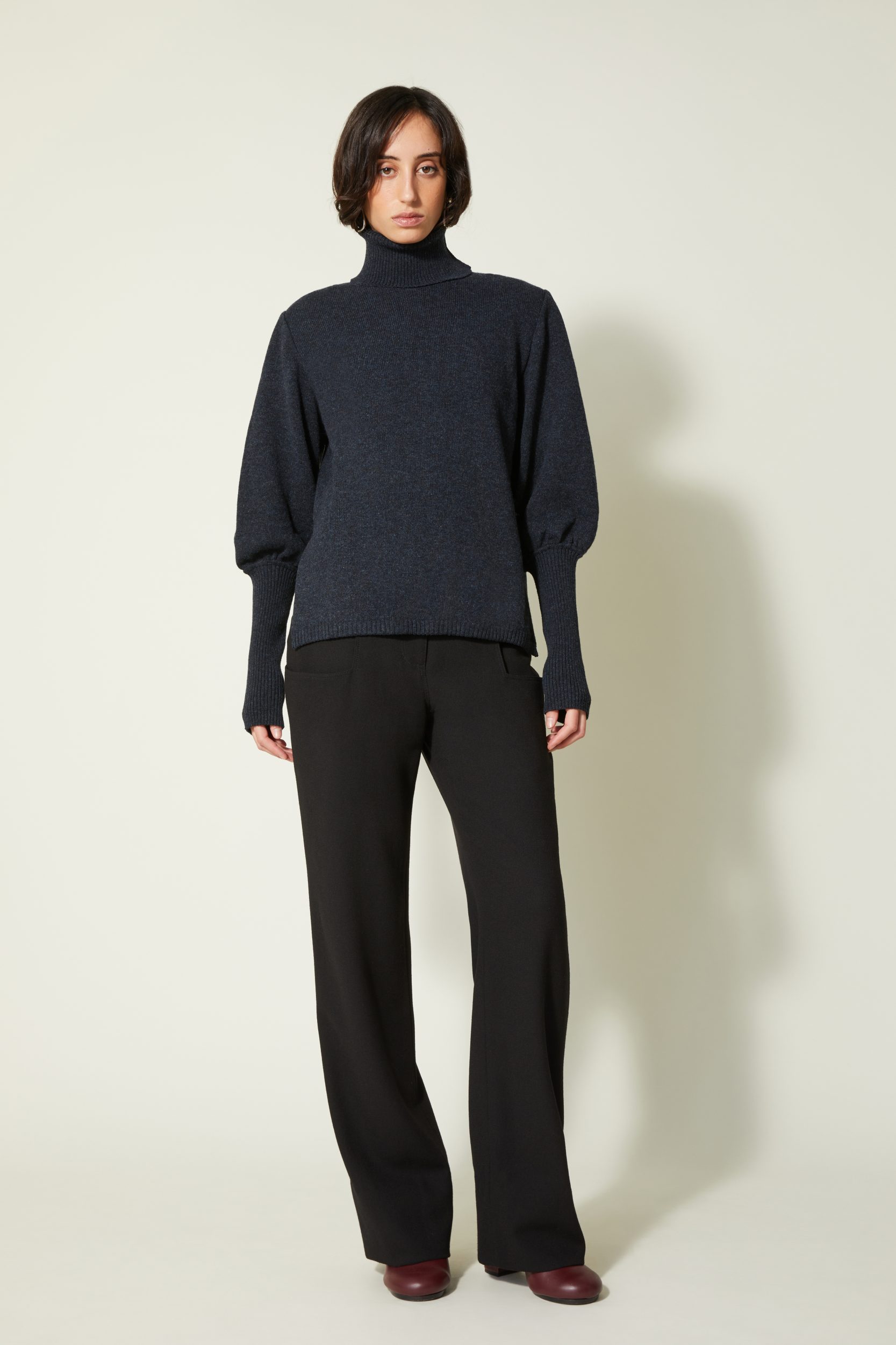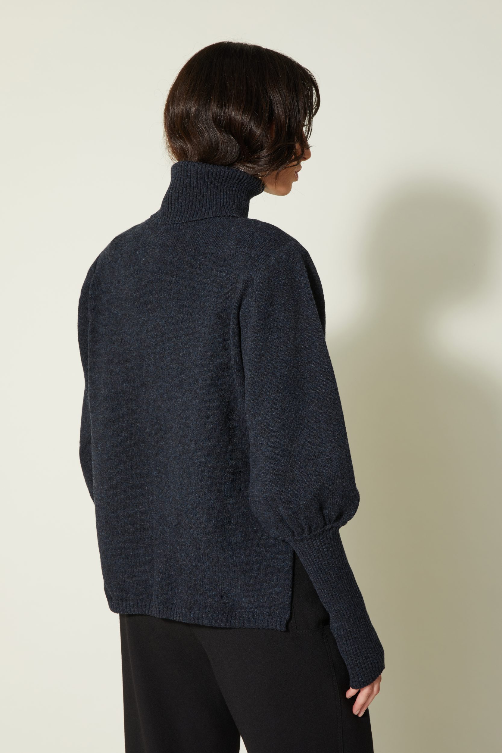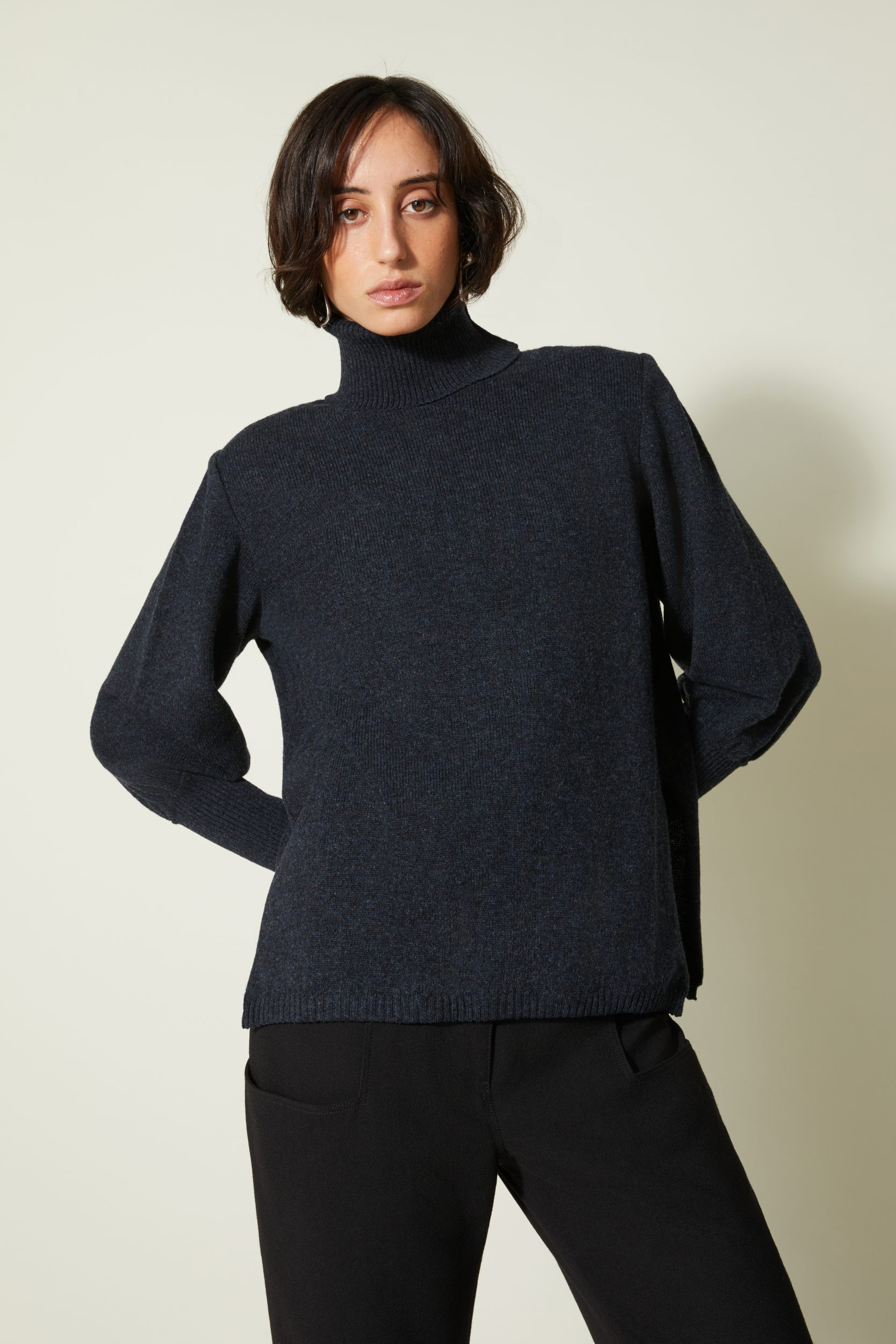 Col roulé en côtes — Manches longues montées assez larges — Poignets resserrés par un large bord-côte — Fentes côtés