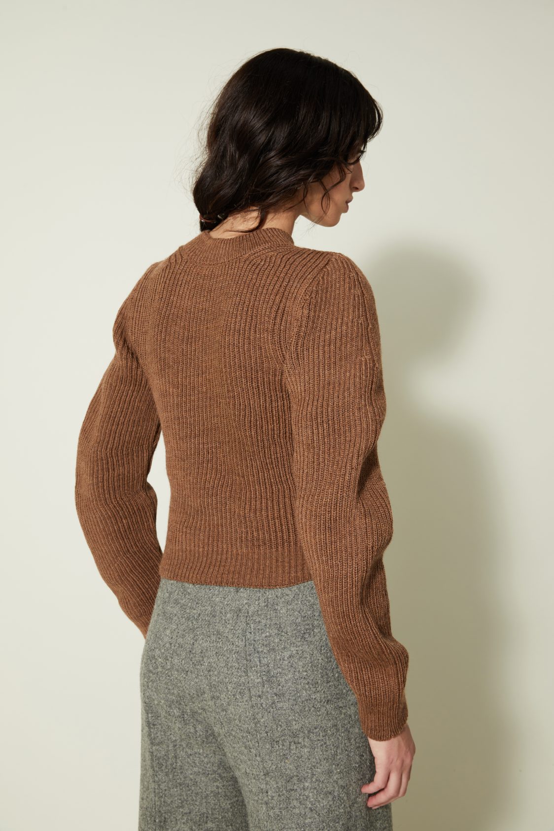 Un nouveau pull élaboré en côtes anglaises avec un fil de pure laine vierge sélectionnée pour sa main. Il a une particularité notable : la manche est tricotée plus longue du côté extérieur du bras qu’à l’intérieur ce qui crée ce mouvement ondulé.