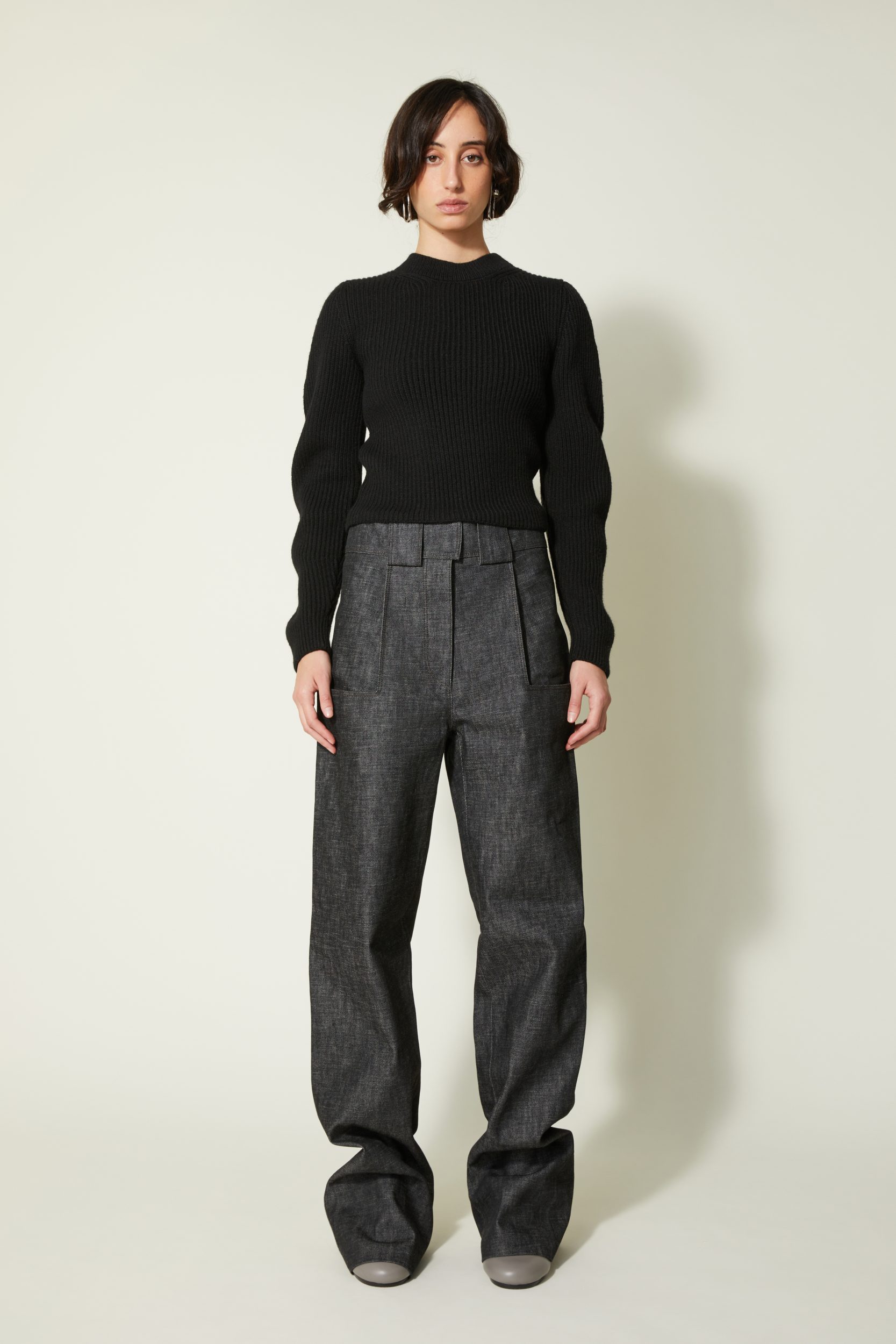Un nouveau pull élaboré en côtes anglaises avec un fil de pure laine vierge sélectionnée pour sa main. Il a une particularité notable : la manche est tricotée plus longue du côté extérieur du bras qu’à l’intérieur ce qui crée ce mouvement ondulé.