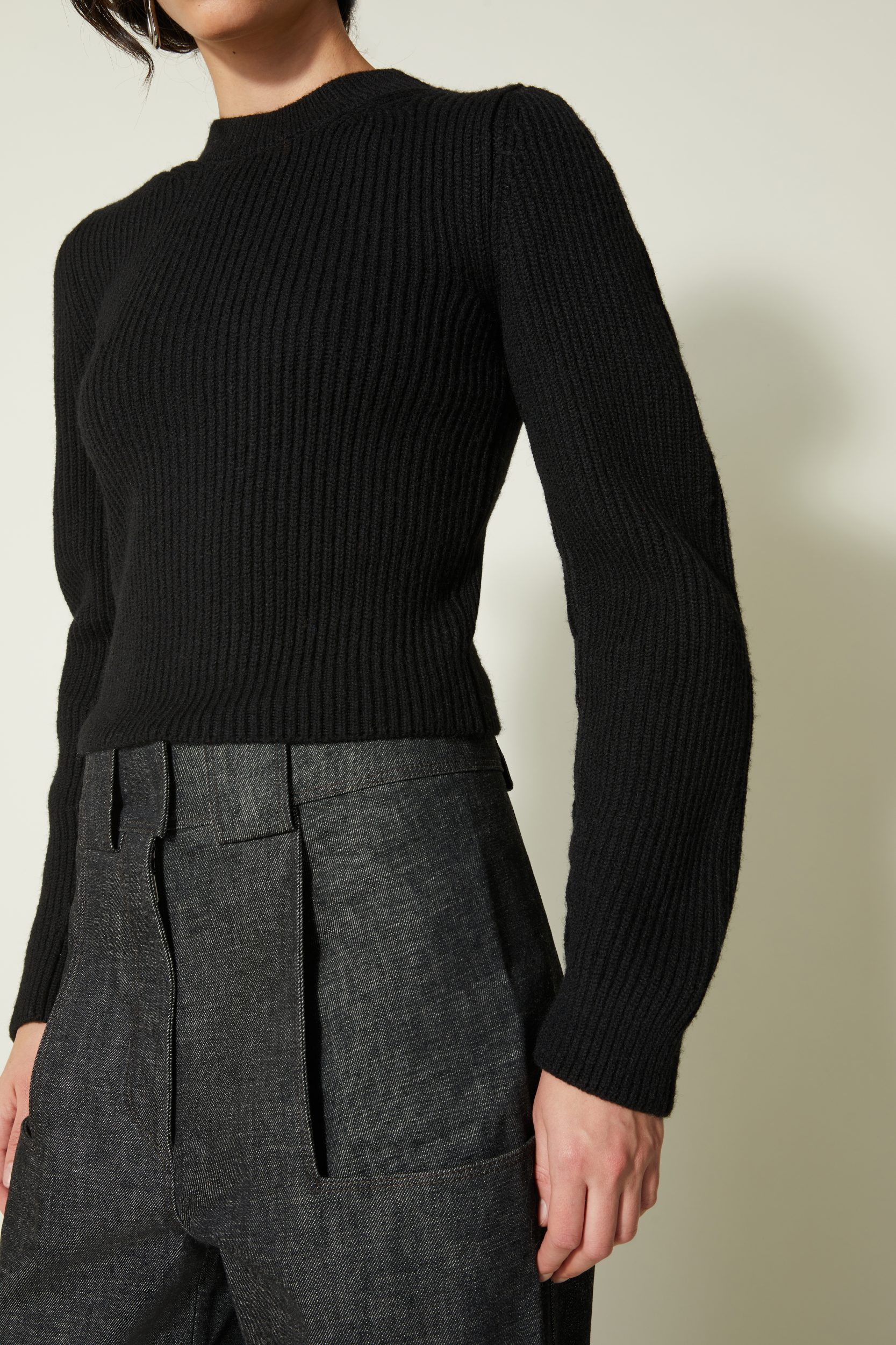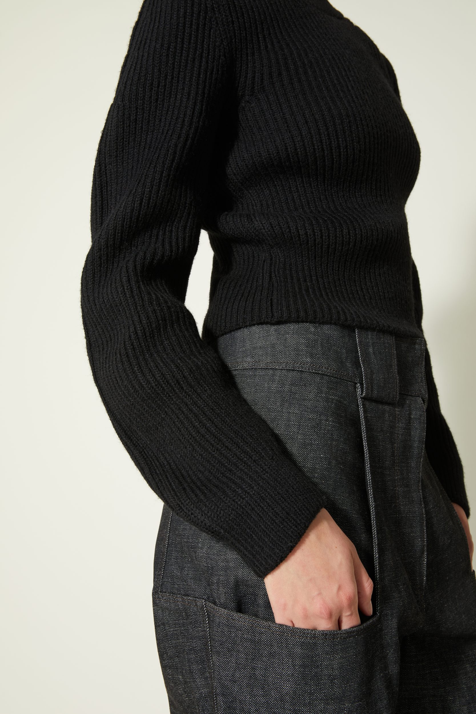 Col montant en côtes double épaisseur — Manches longues montées — Forme droite — Poignets et taille resserrés par un bord-côte