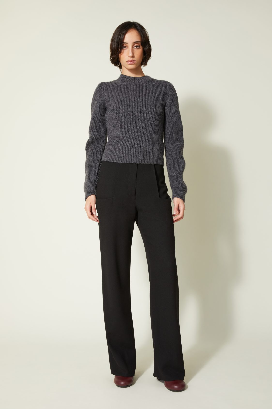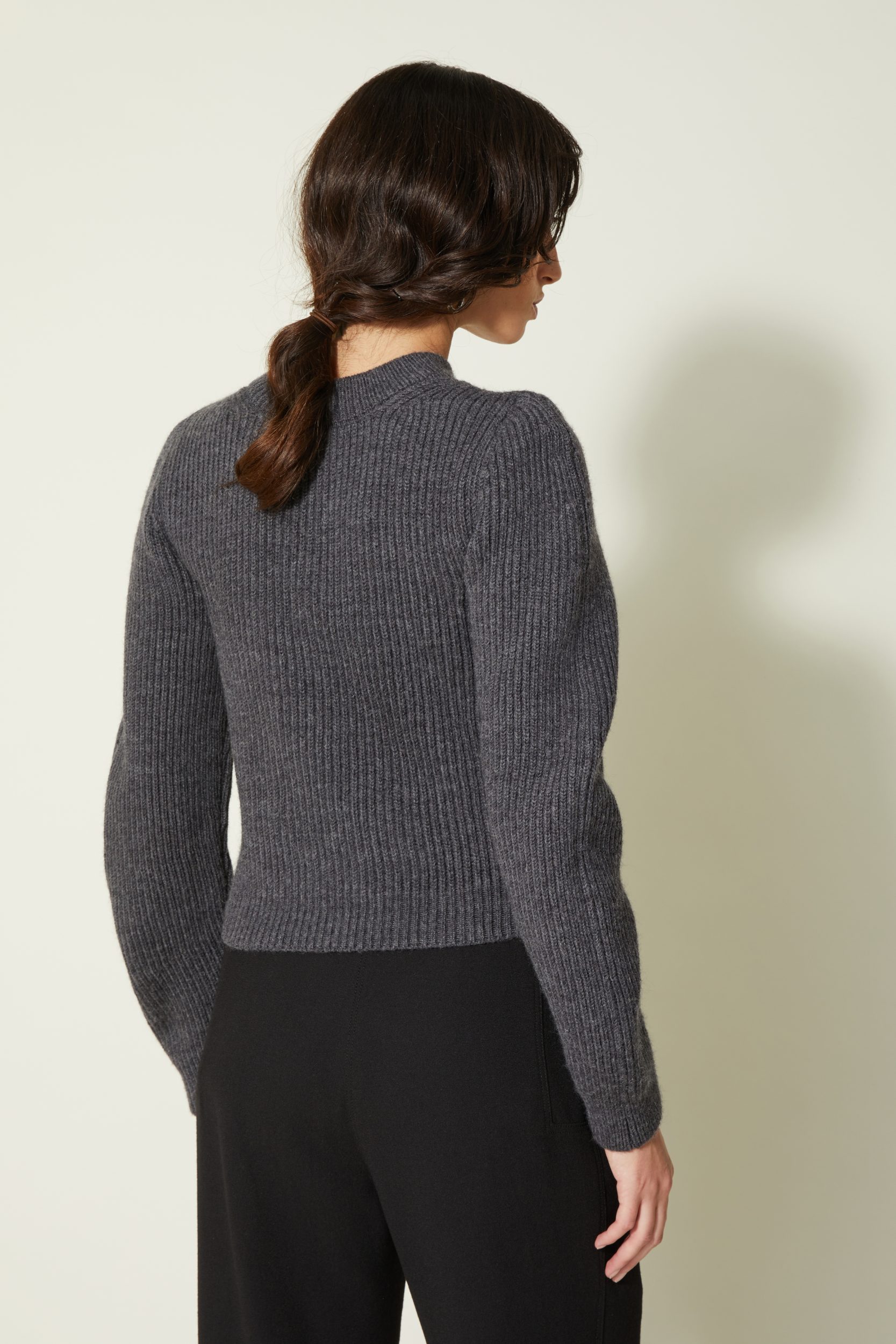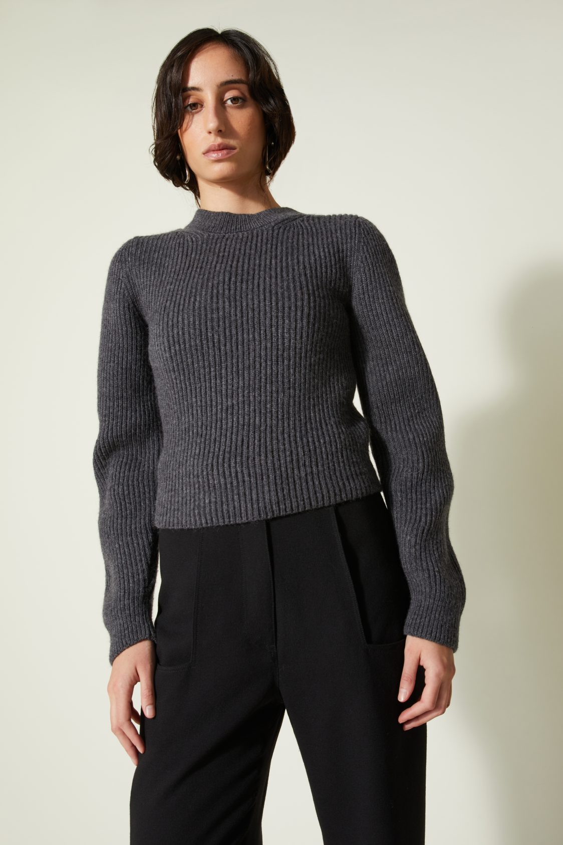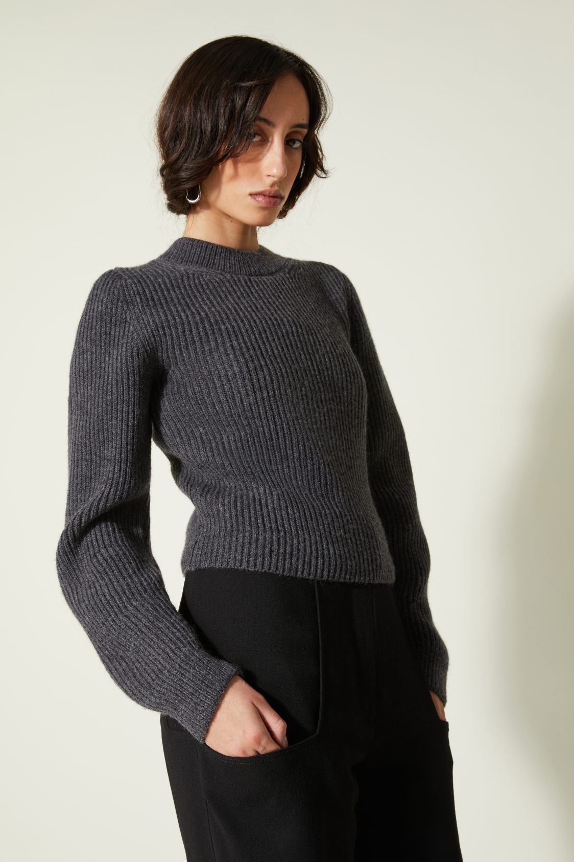 Col montant en côtes double épaisseur — Manches longues montées — Forme droite — Poignets et taille resserrés par un bord-côte