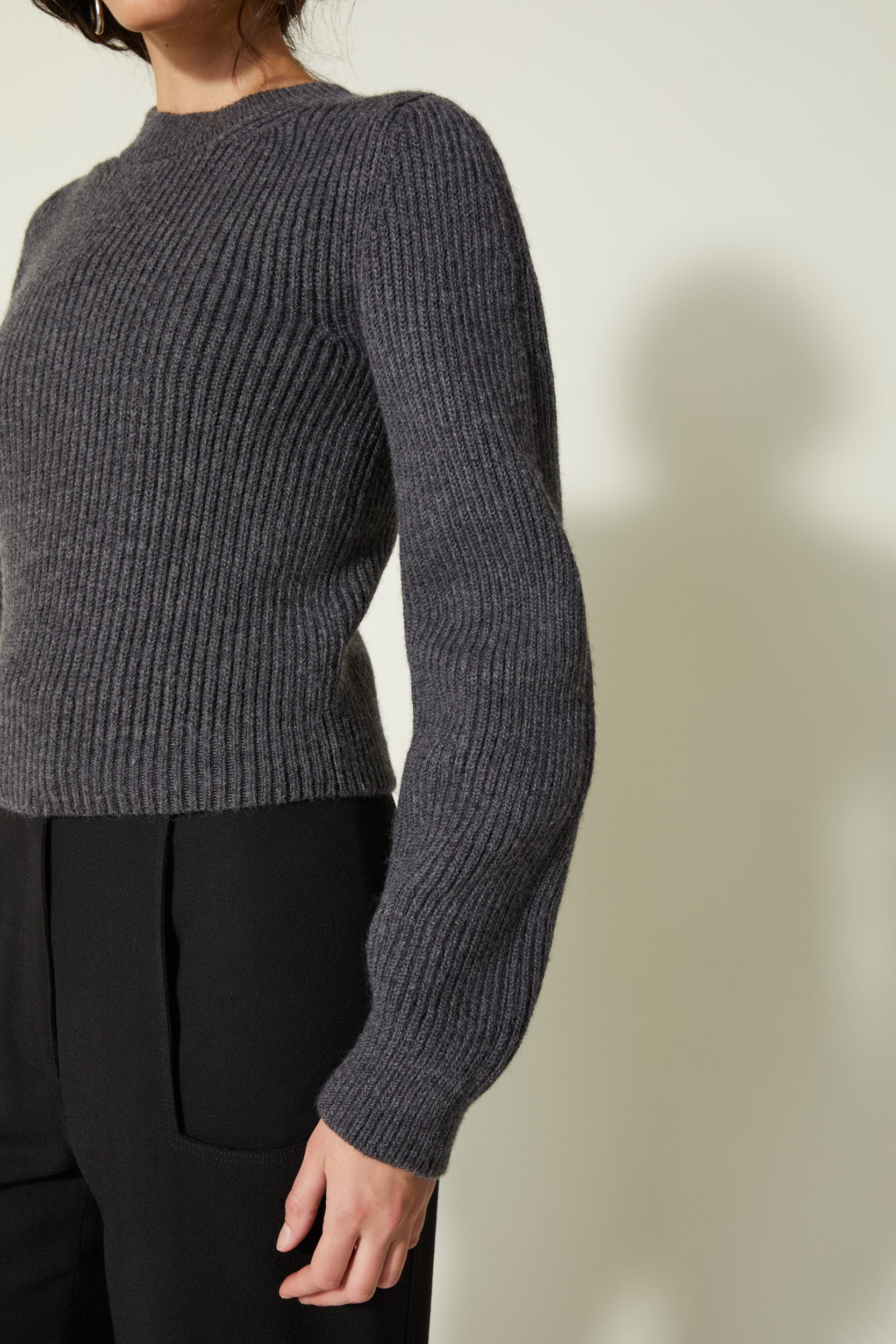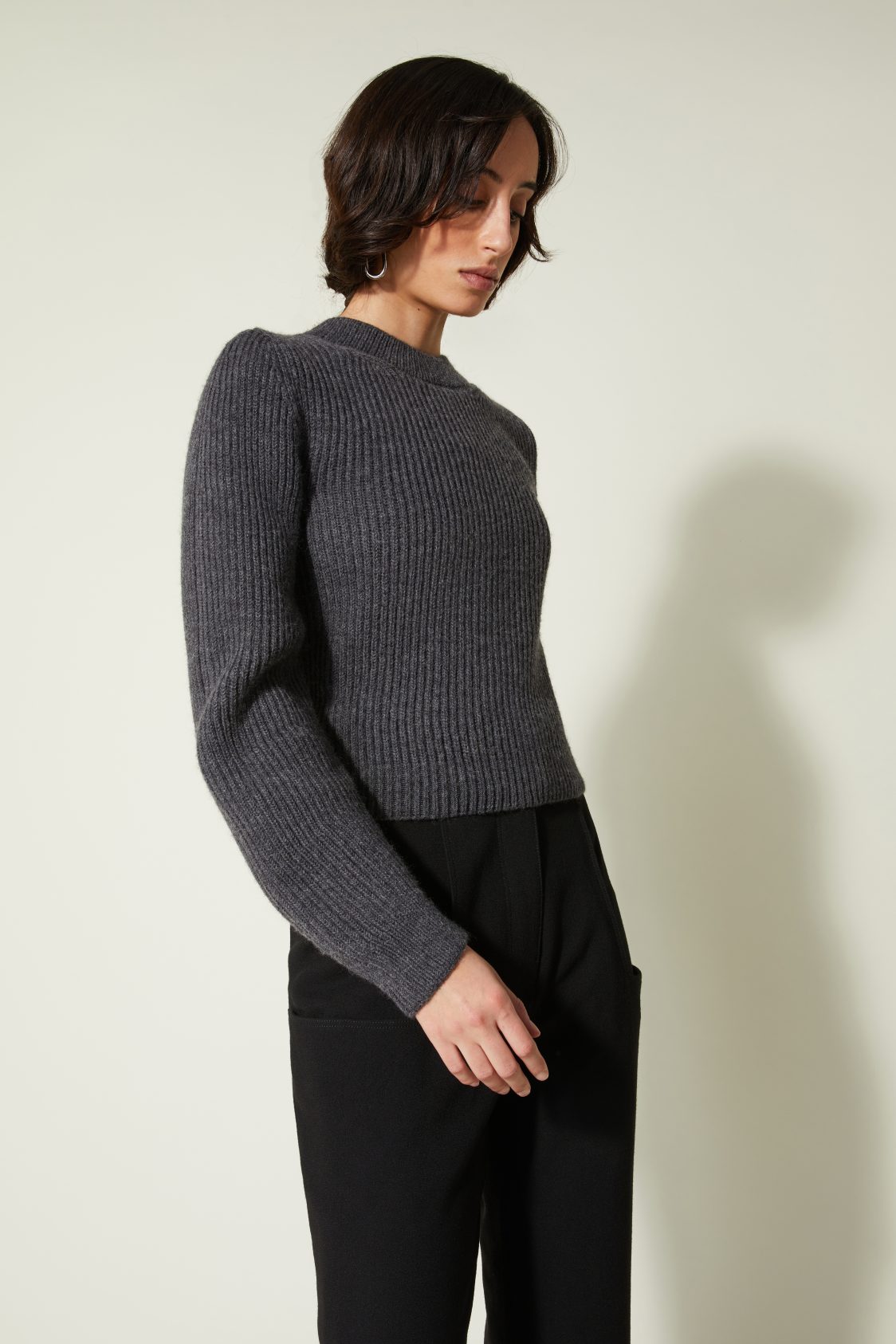 Un nouveau pull élaboré en côtes anglaises avec un fil de pure laine vierge sélectionnée pour sa main. Il a une particularité notable : la manche est tricotée plus longue du côté extérieur du bras qu’à l’intérieur ce qui crée ce mouvement ondulé.