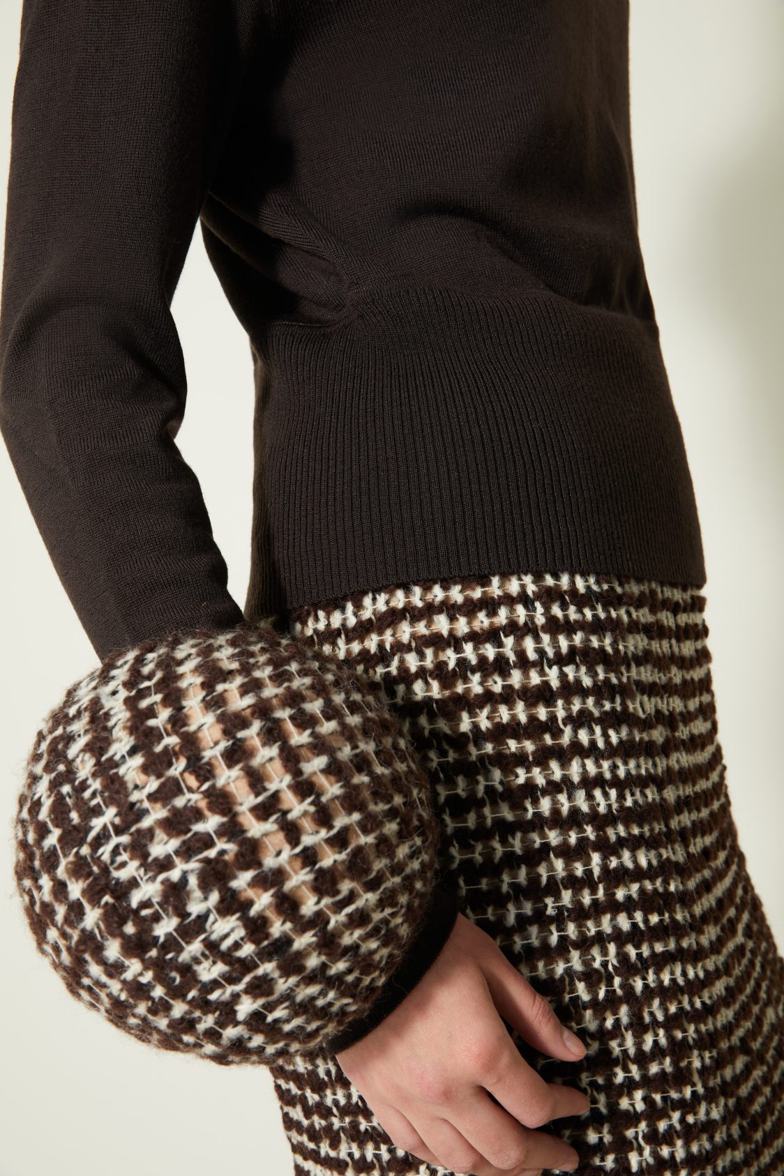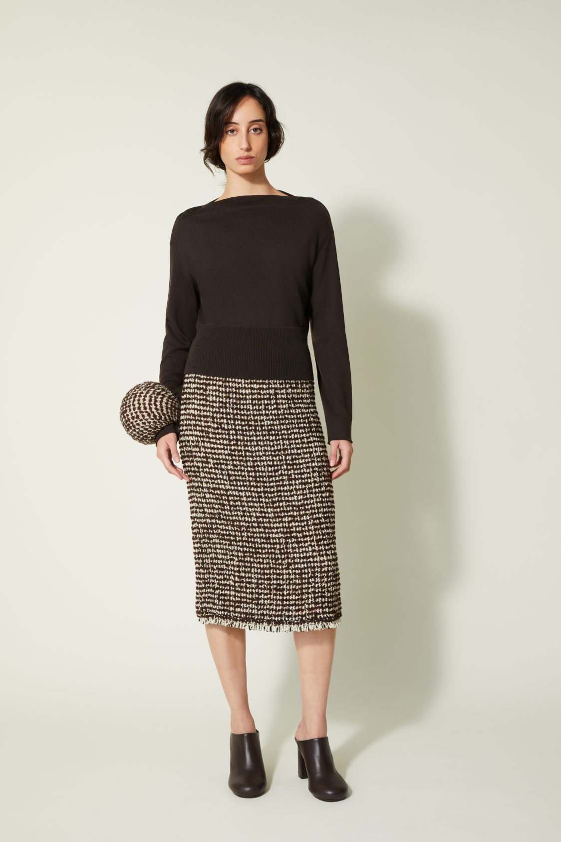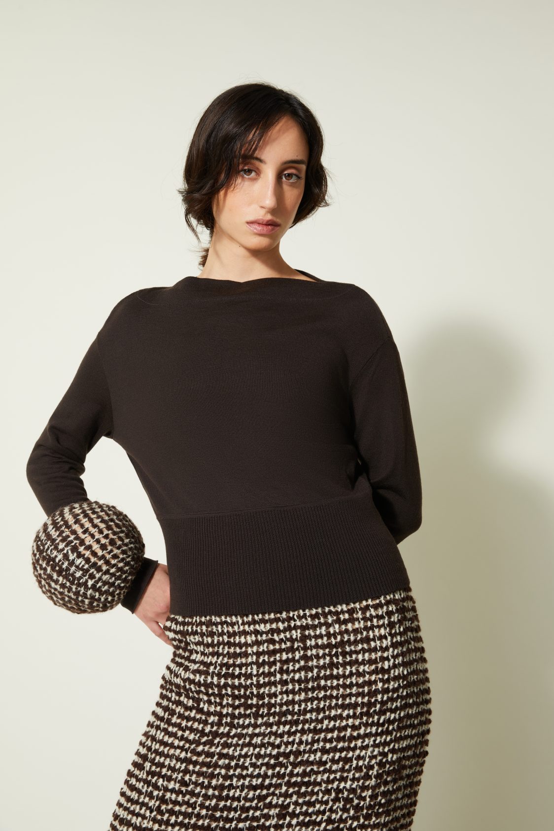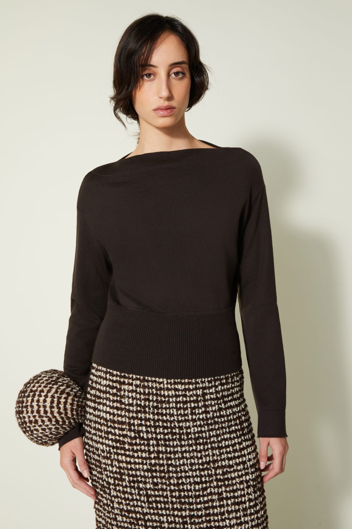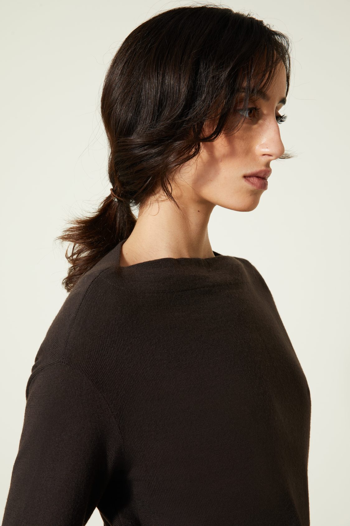Tricoté en pure laine, ce pull à jauge fine s’impose comme un nouveau basique du vestiaire. Son col large, proche du bateau, dégage légèrement la ligne du cou. Le corps, volontairement souple, est structuré par un large bord-côte haut qui vient marquer la taille avec netteté.