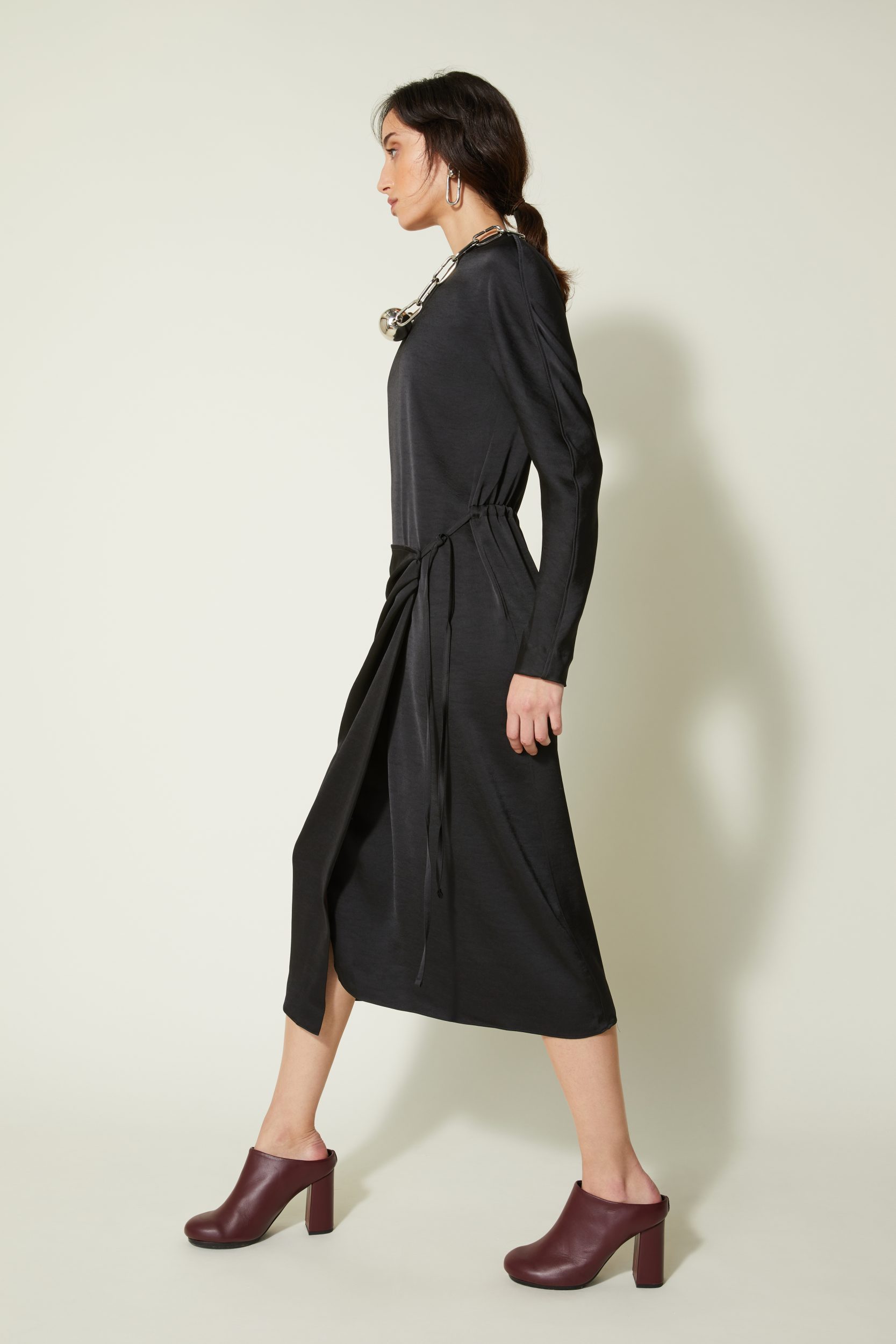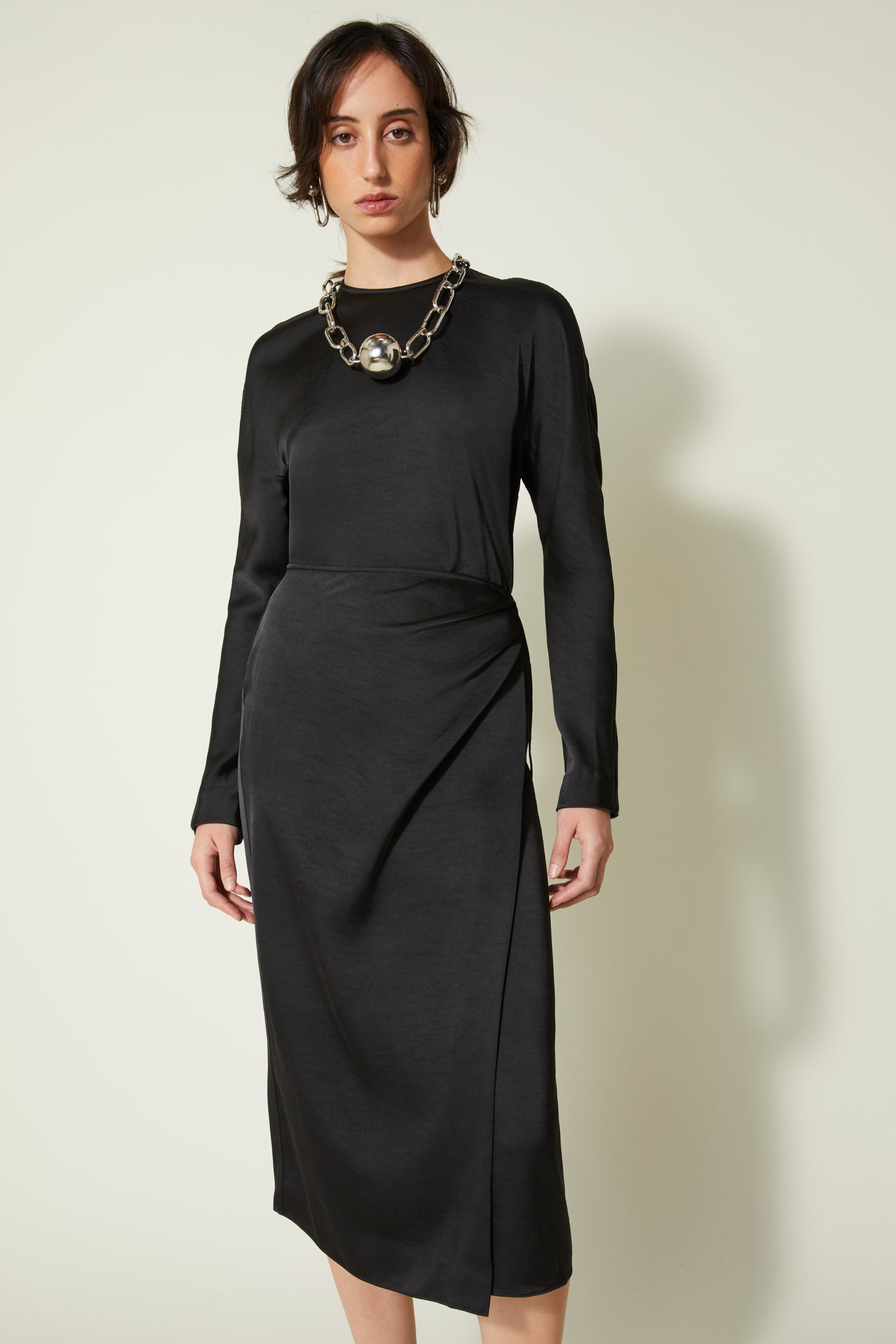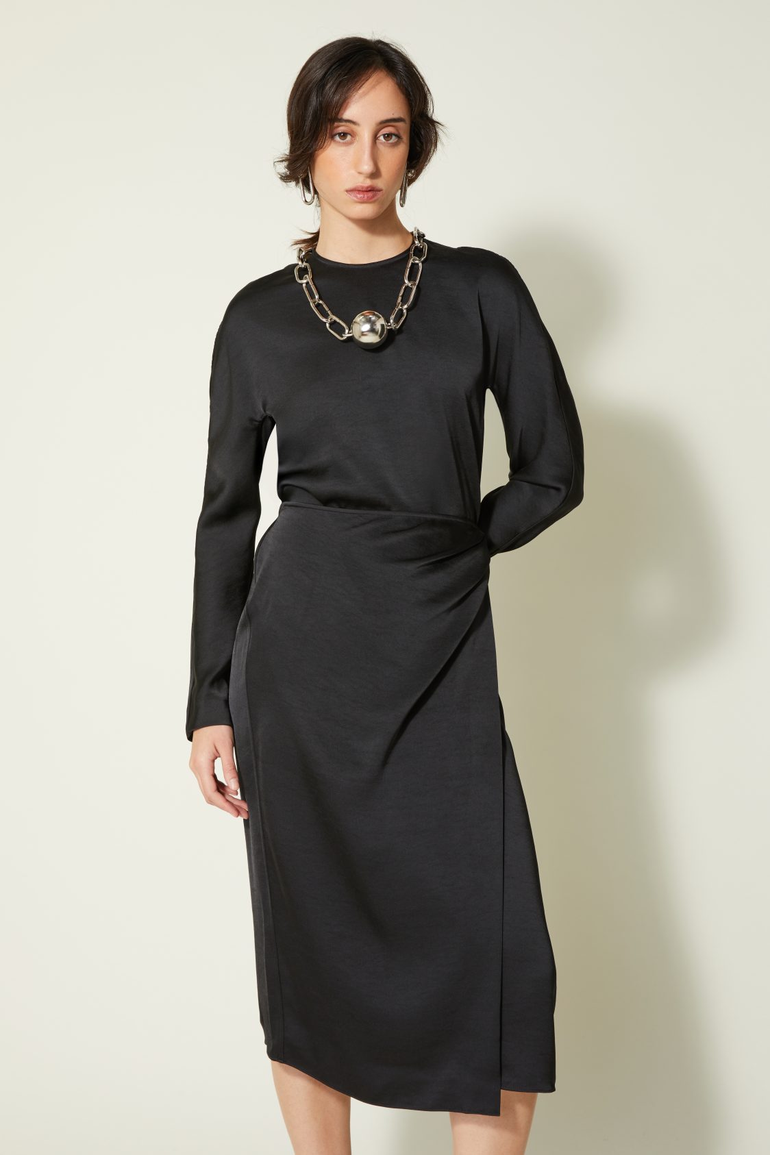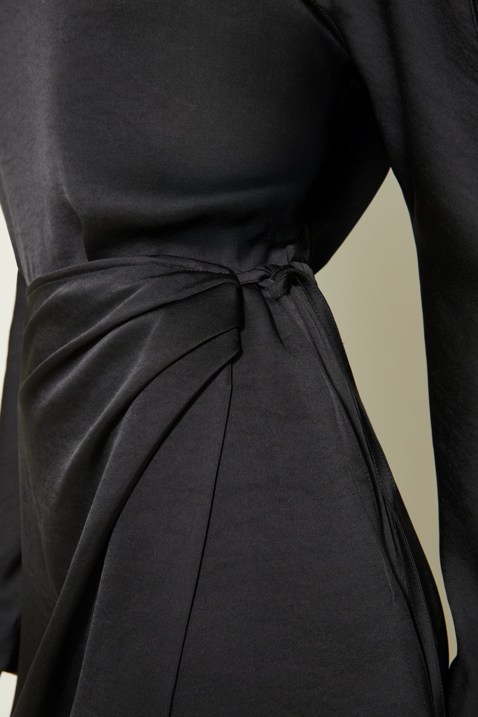 Une pièce hybride à l’allure maîtrisée, fusionnant la structure d’un top droit et la fluidité d’une jupe drapée pour créer une robe portefeuille confectionnée en satin fluide.