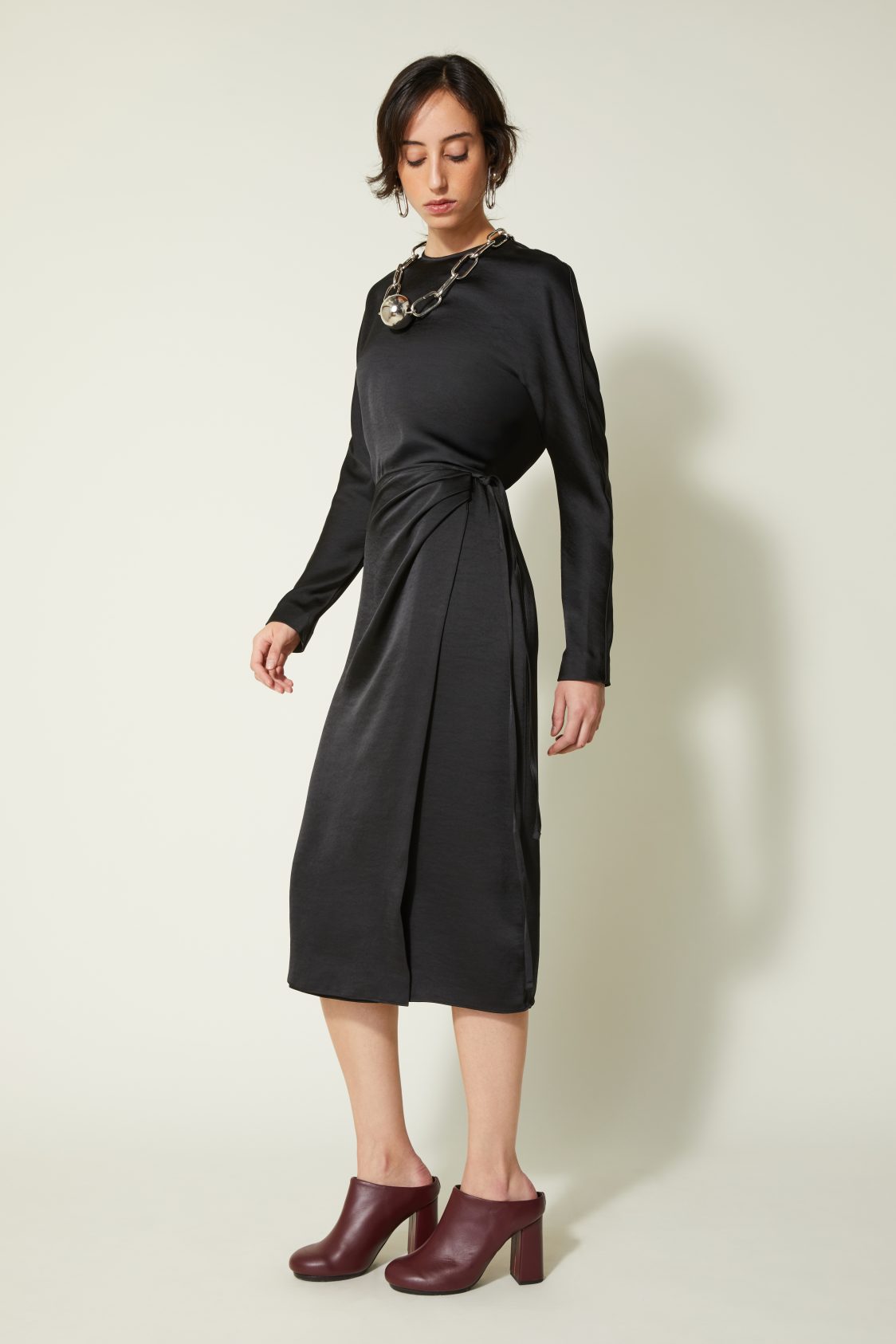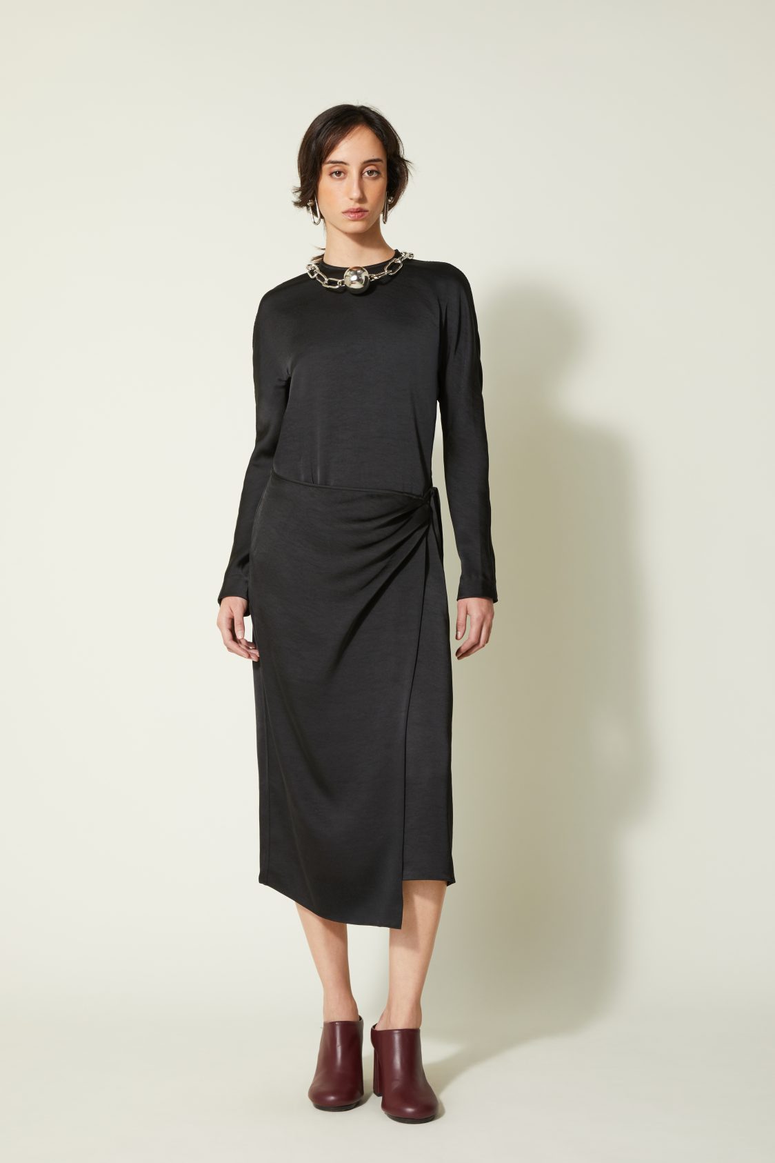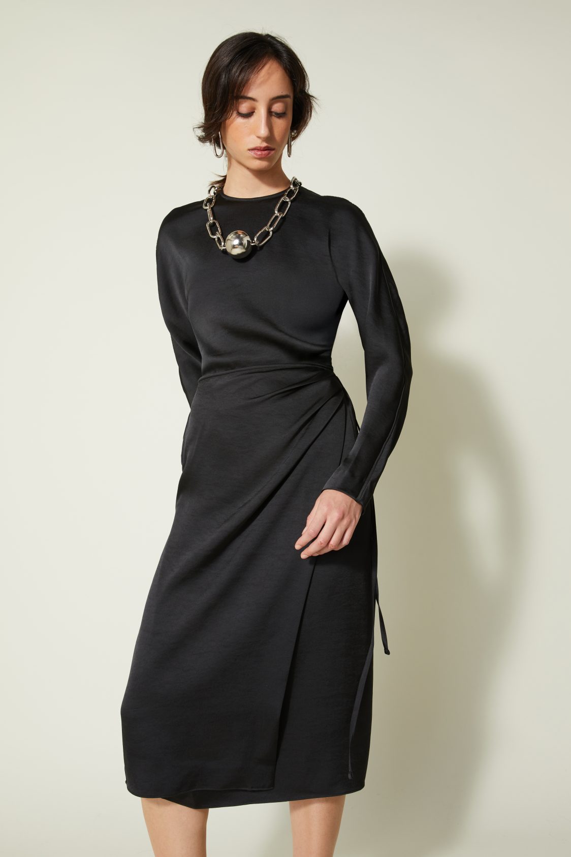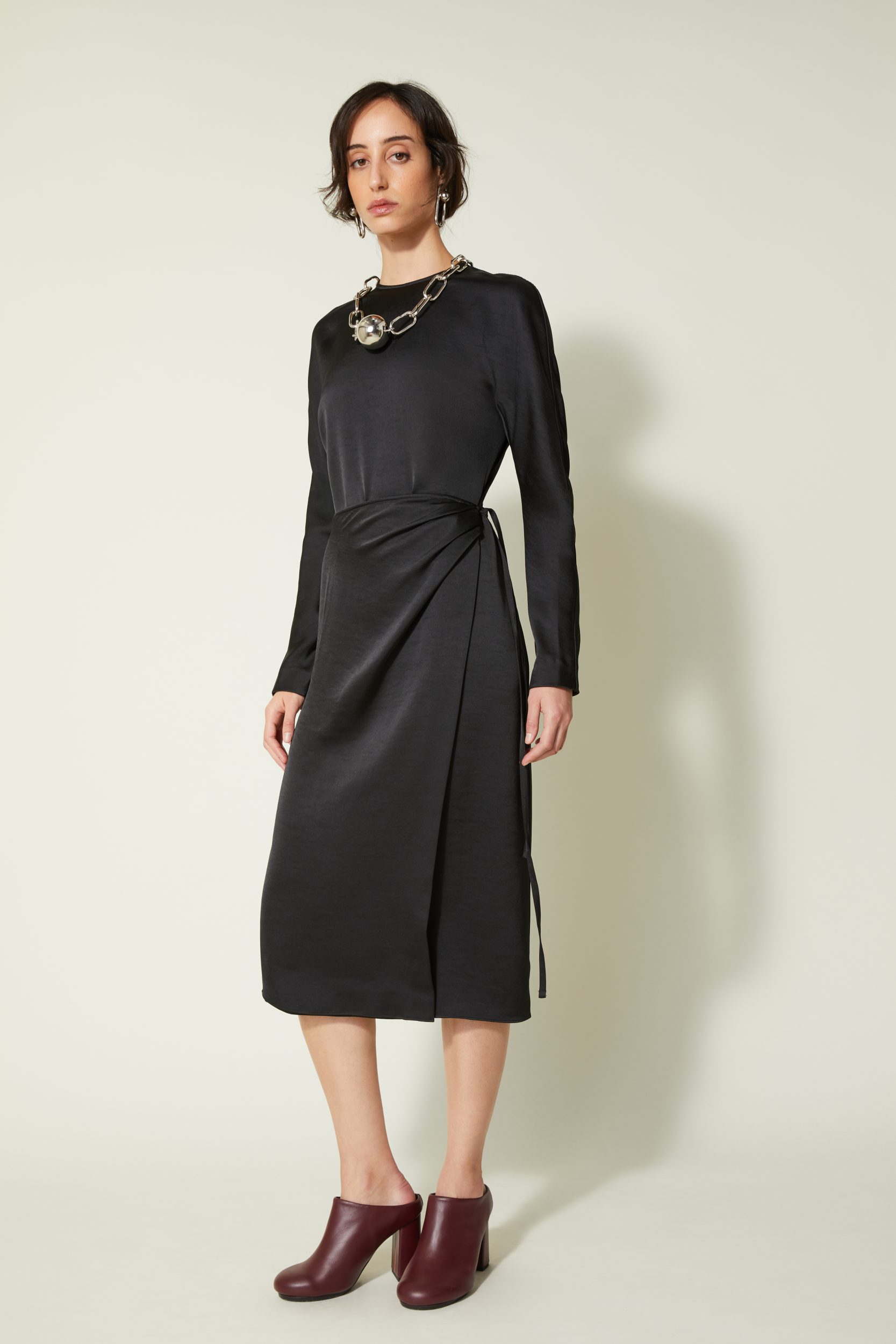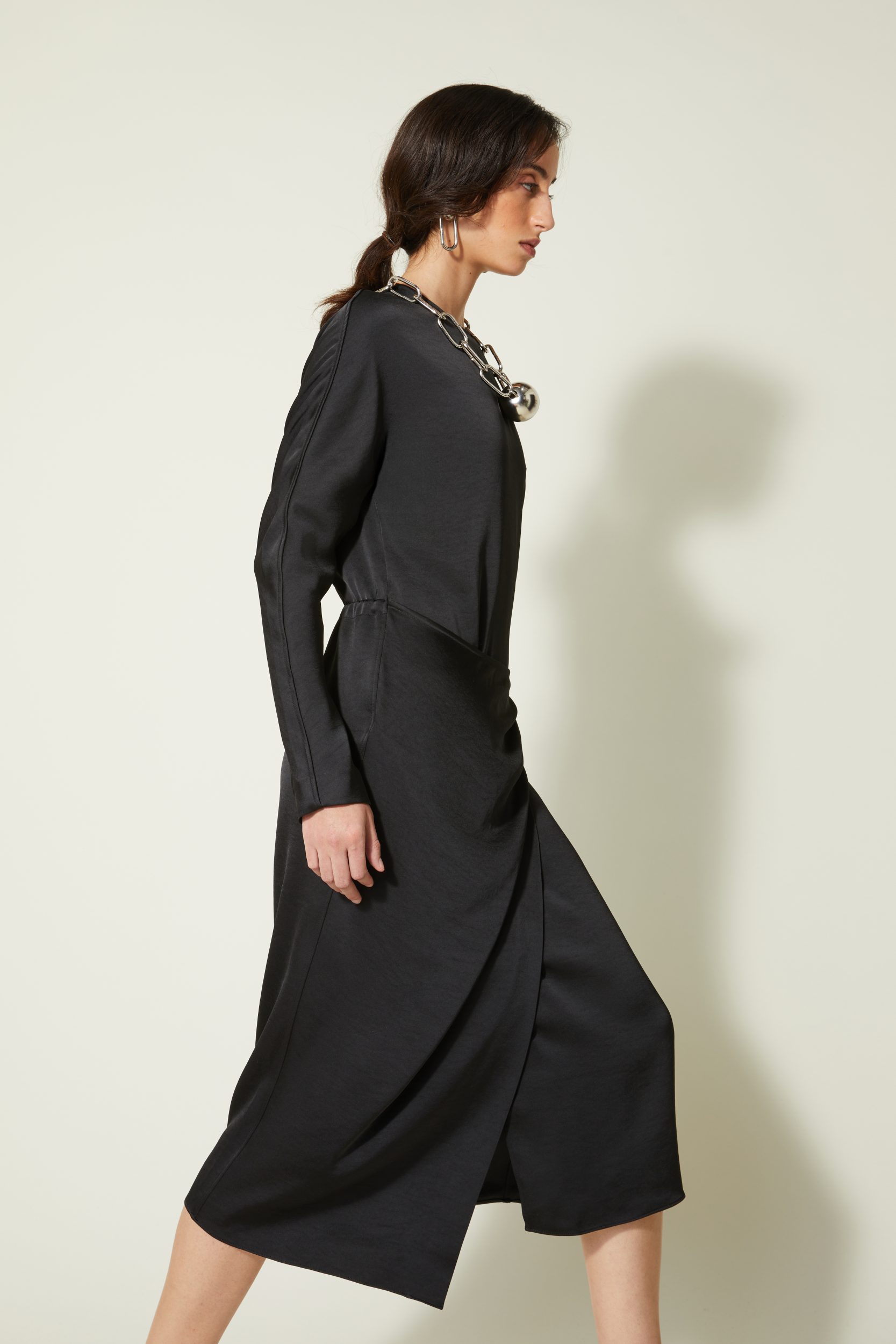 Une pièce hybride à l’allure maîtrisée, fusionnant la structure d’un top droit et la fluidité d’une jupe drapée pour créer une robe portefeuille confectionnée en satin fluide.