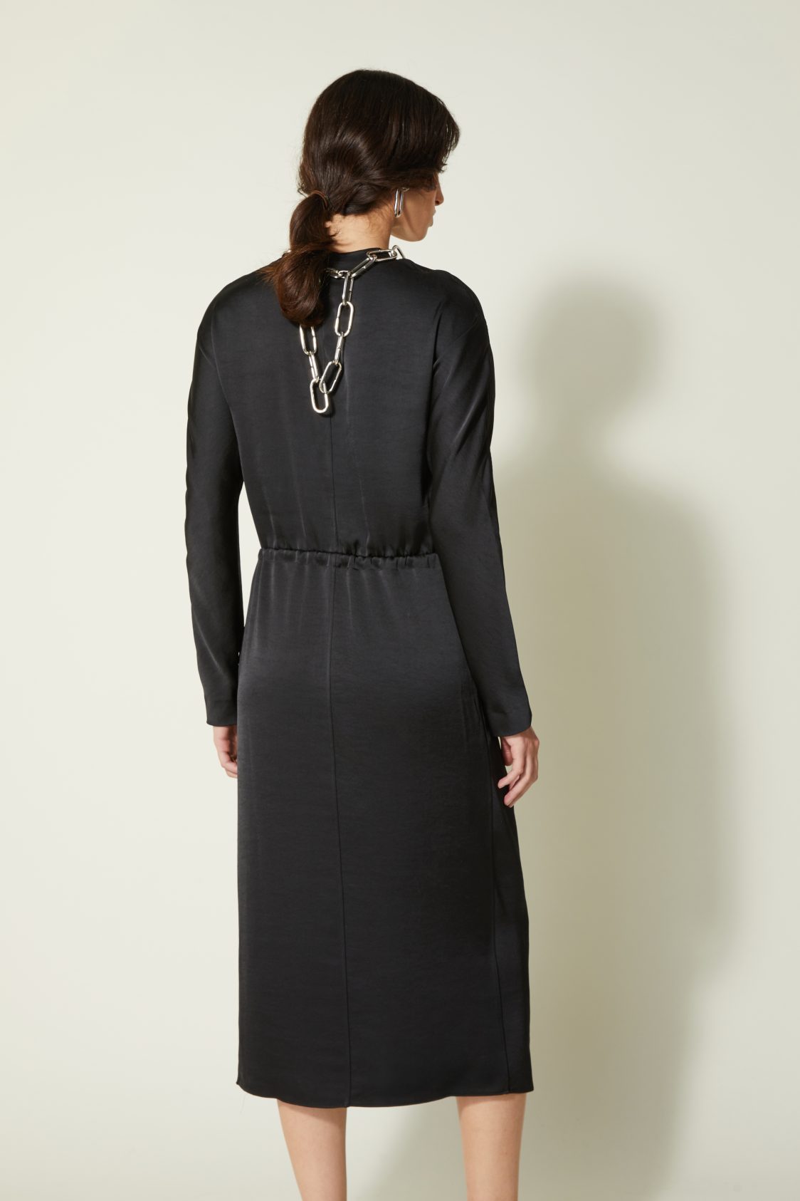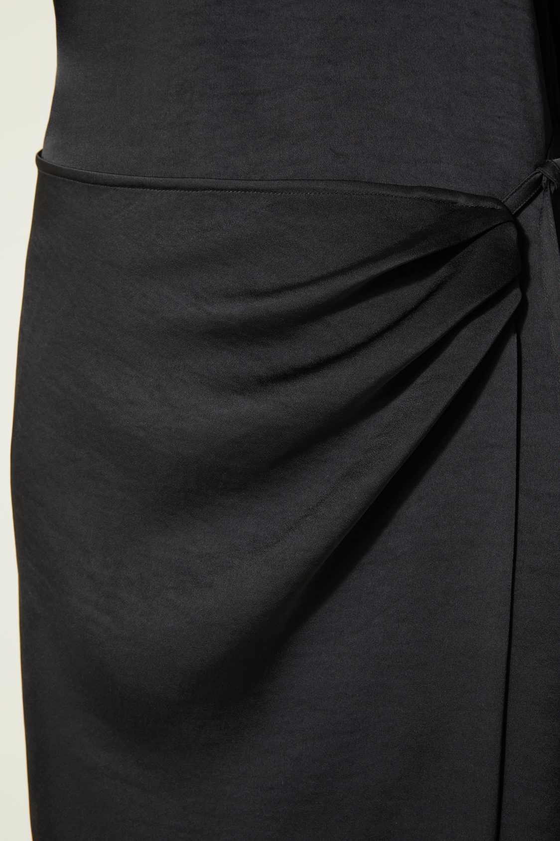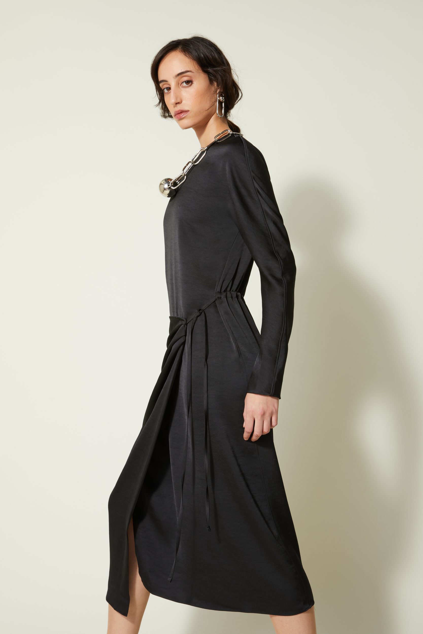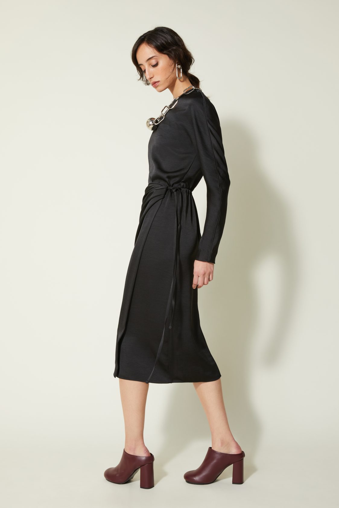 Une pièce hybride à l’allure maîtrisée, fusionnant la structure d’un top droit et la fluidité d’une jupe drapée pour créer une robe portefeuille confectionnée en satin fluide.
