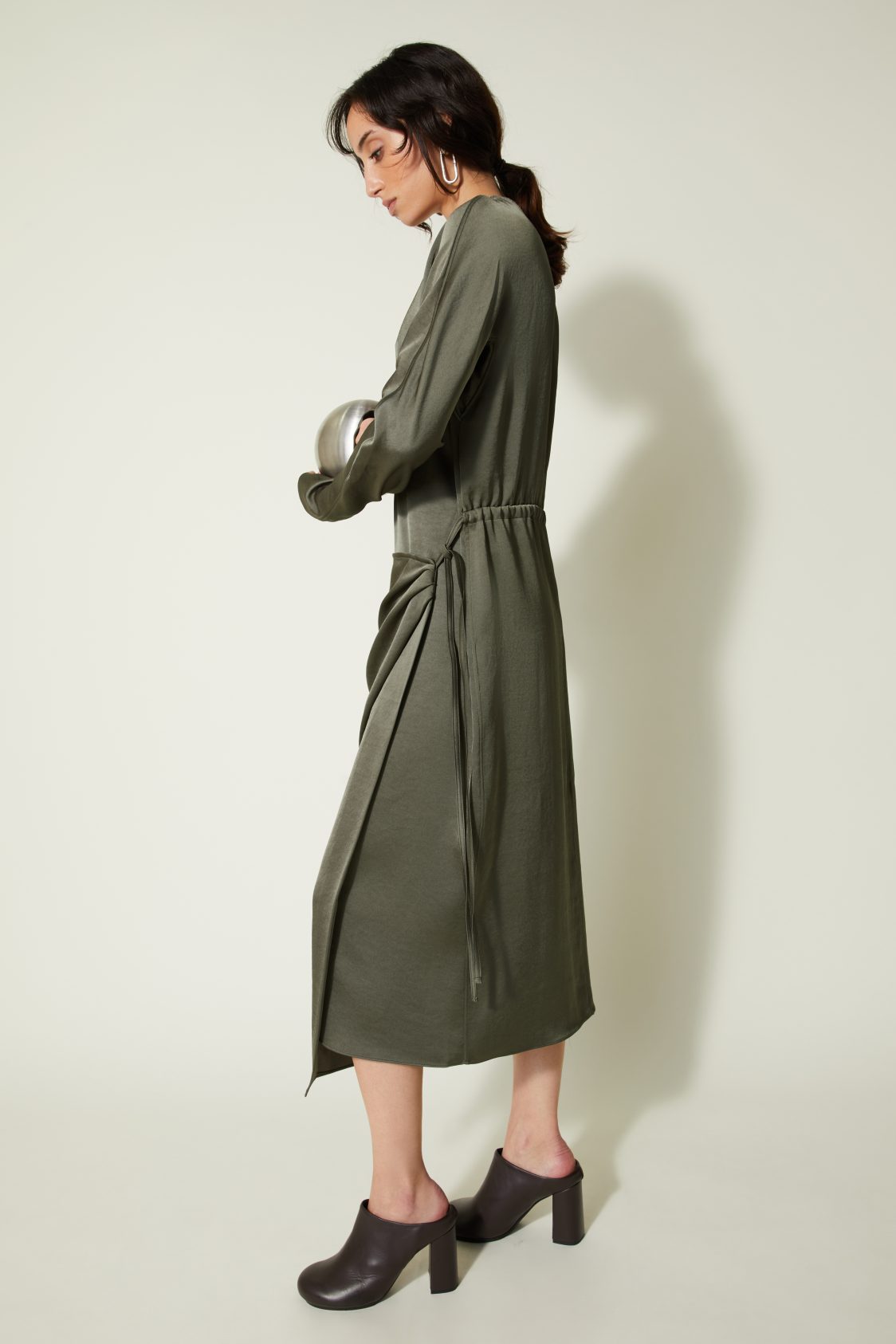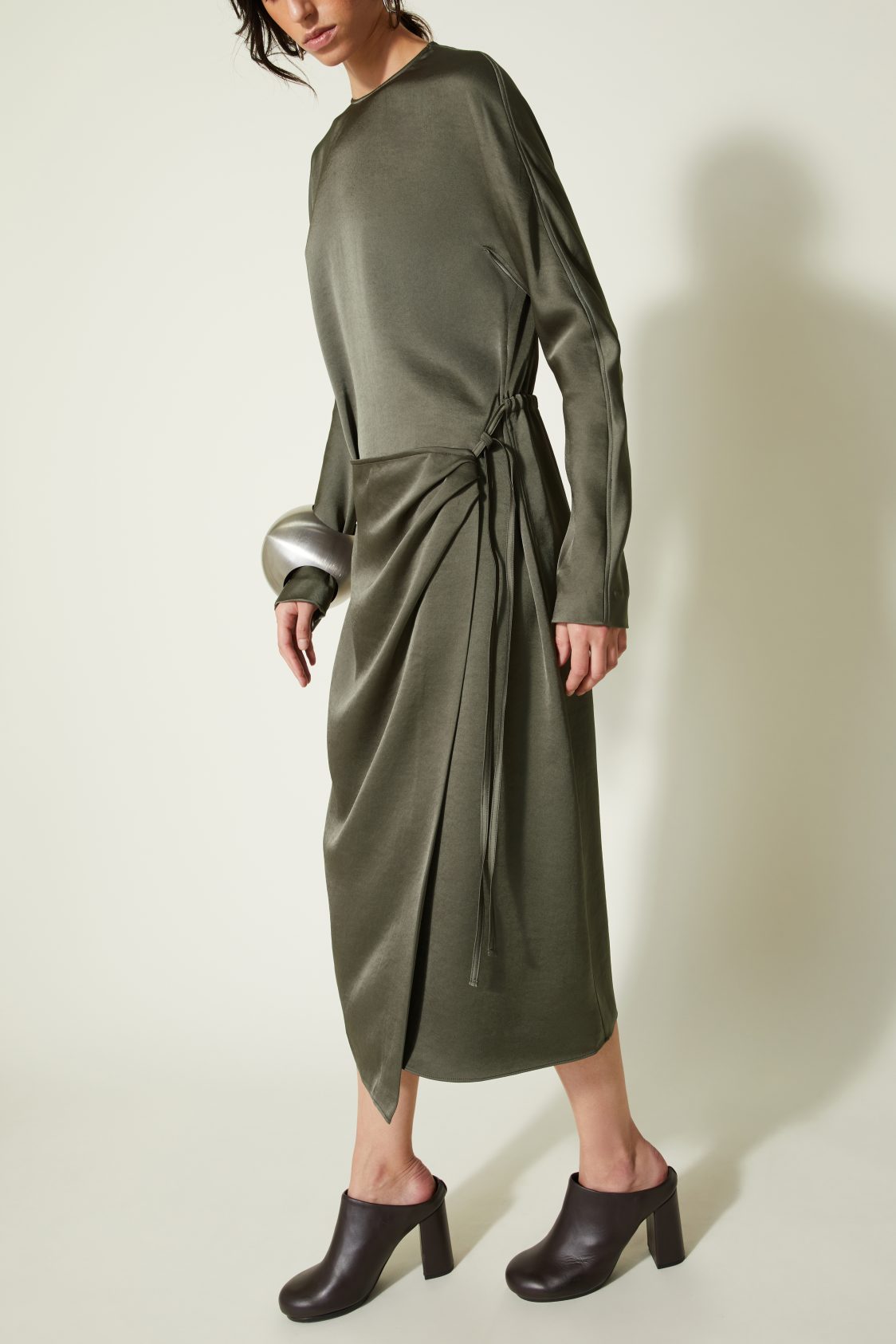 Une pièce hybride à l’allure maîtrisée, fusionnant la structure d’un top droit et la fluidité d’une jupe drapée pour créer une robe portefeuille confectionnée en satin fluide.