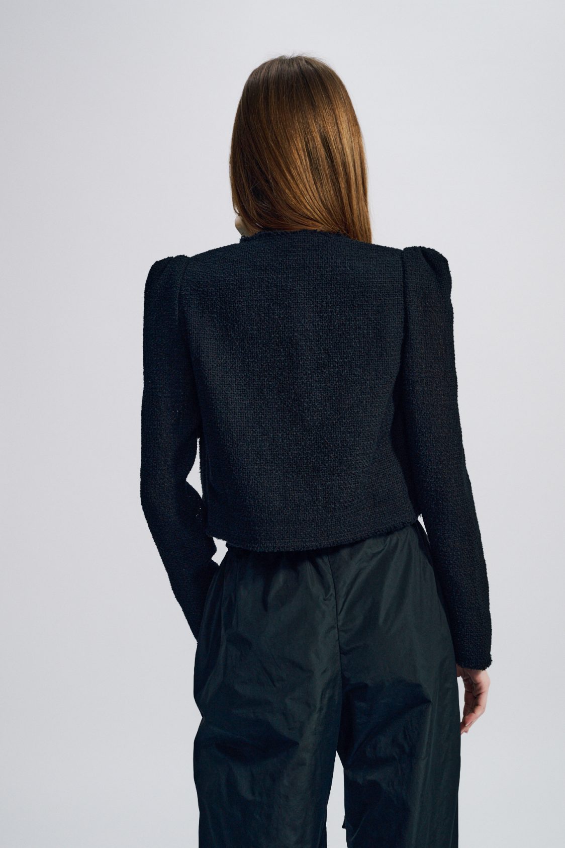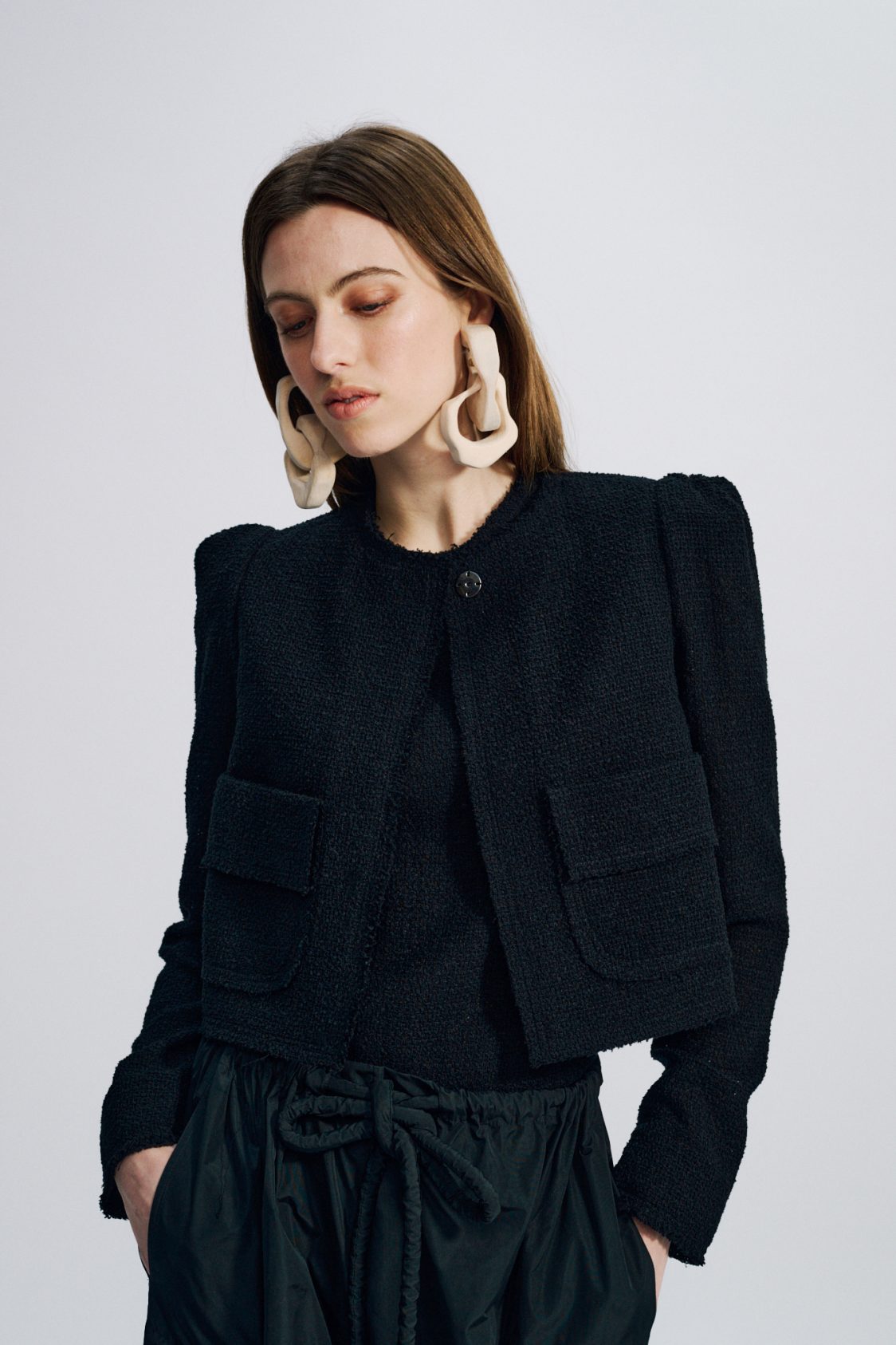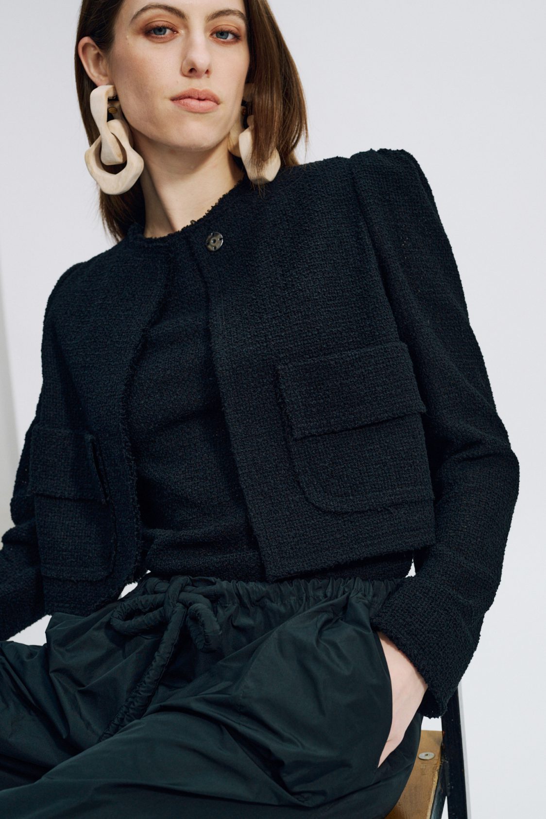 Cette veste courte et structurée est réalisée dans un tissu luxueux : une résille de coton. Les finitions à bord franc soulignent l’aspect tactile et authentique de la matière.