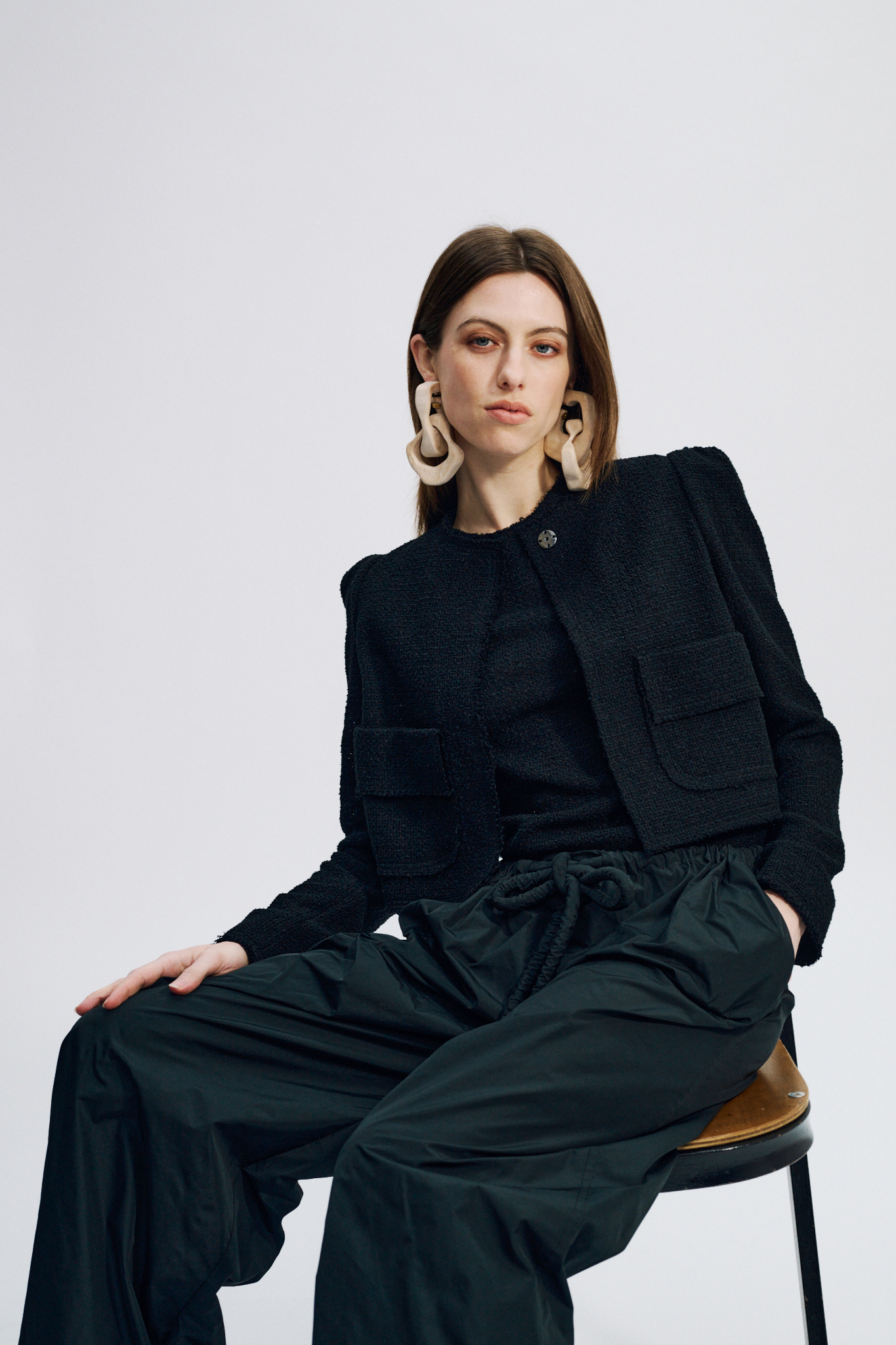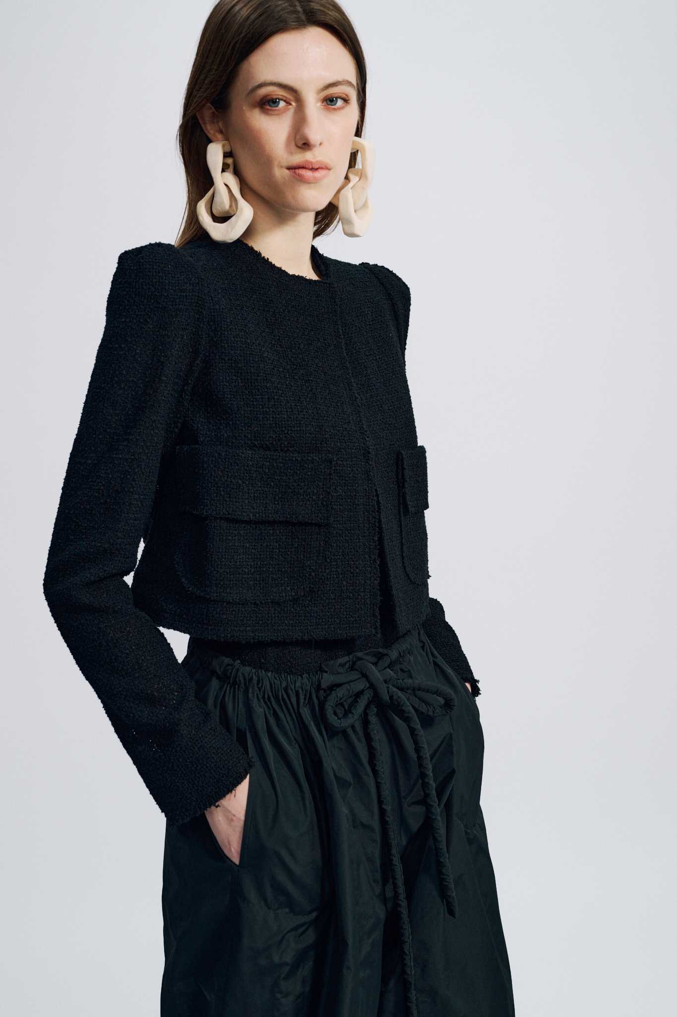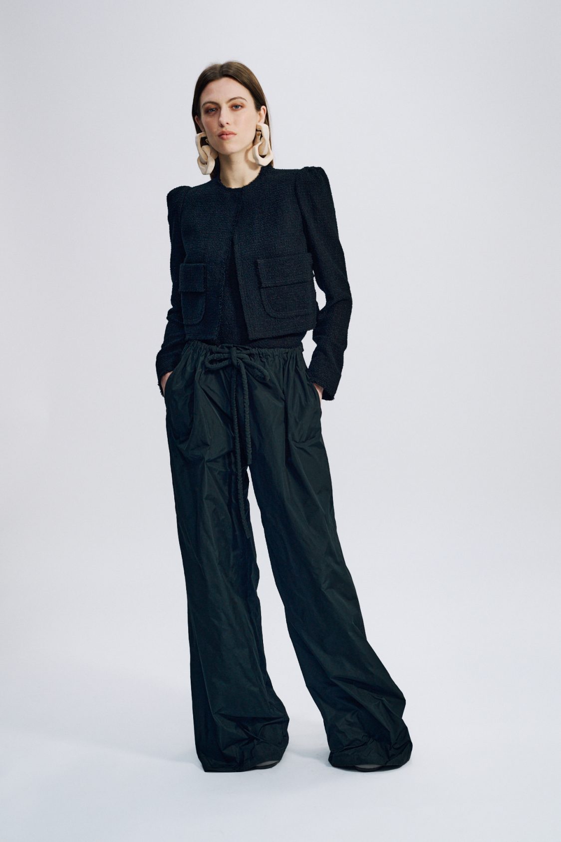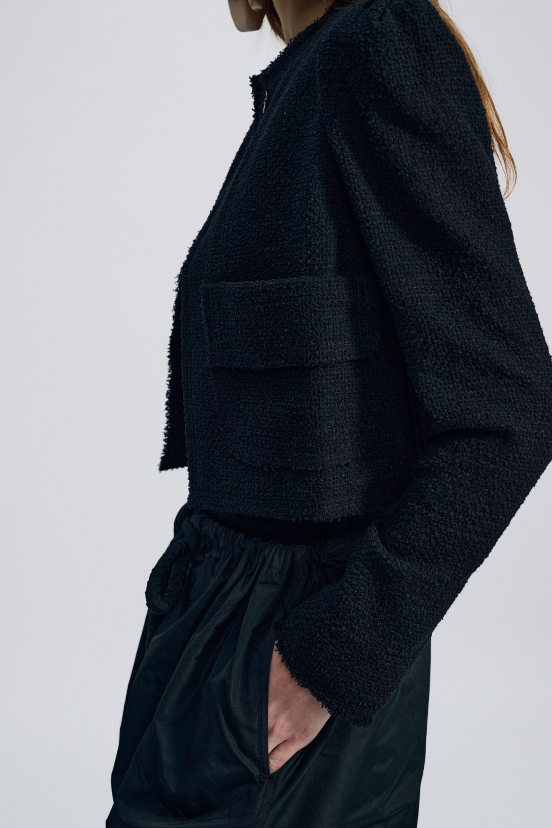 Cette veste courte et structurée est réalisée dans un tissu luxueux : une résille de coton. Les finitions à bord franc soulignent l’aspect tactile et authentique de la matière.